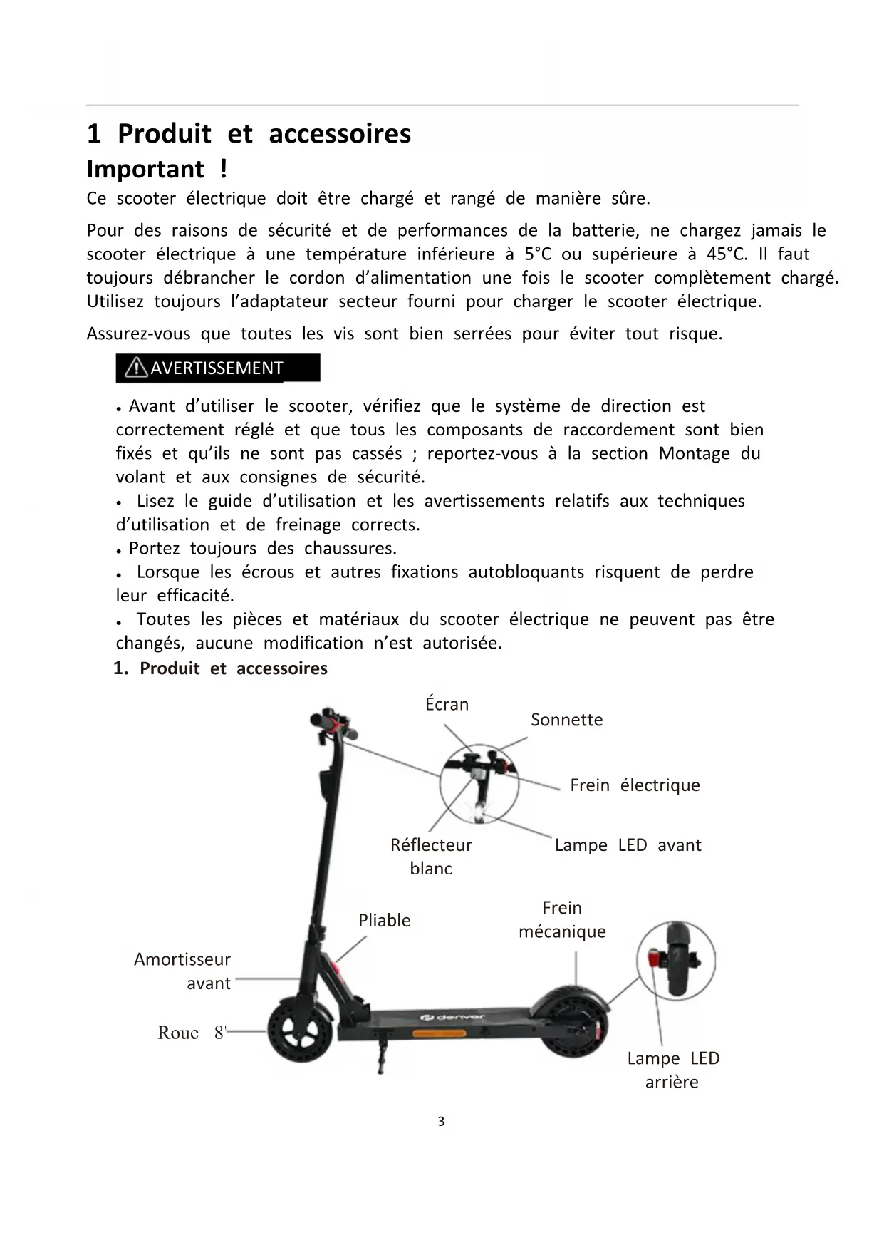 1 Produit et accessoires Important ! Ce scooter électrique doit être chargé et rangé de manière sûre. Pour des raisons de sécurité et de performances de la batterie, ne chargez jamais le scooter électrique à une température inférieure à 5°C ou supérieure à 45°C. Il faut toujours débrancher le cordon d’alimentation une fois le scooter complètement chargé. Utilisez toujours l’adaptateur secteur fourni pour charger le scooter électrique. Assurez-vous que toutes les vis sont bien serrées pour éviter tout risque. AVERTISSEMENT ● Avant d’utiliser le scooter, vérifiez que le système de direction est correctement réglé et que tous les composants de raccordement sont bien fixés et qu’ils ne sont pas cassés ; reportez-vous à la section Montage du volant et aux consignes de sécurité.
