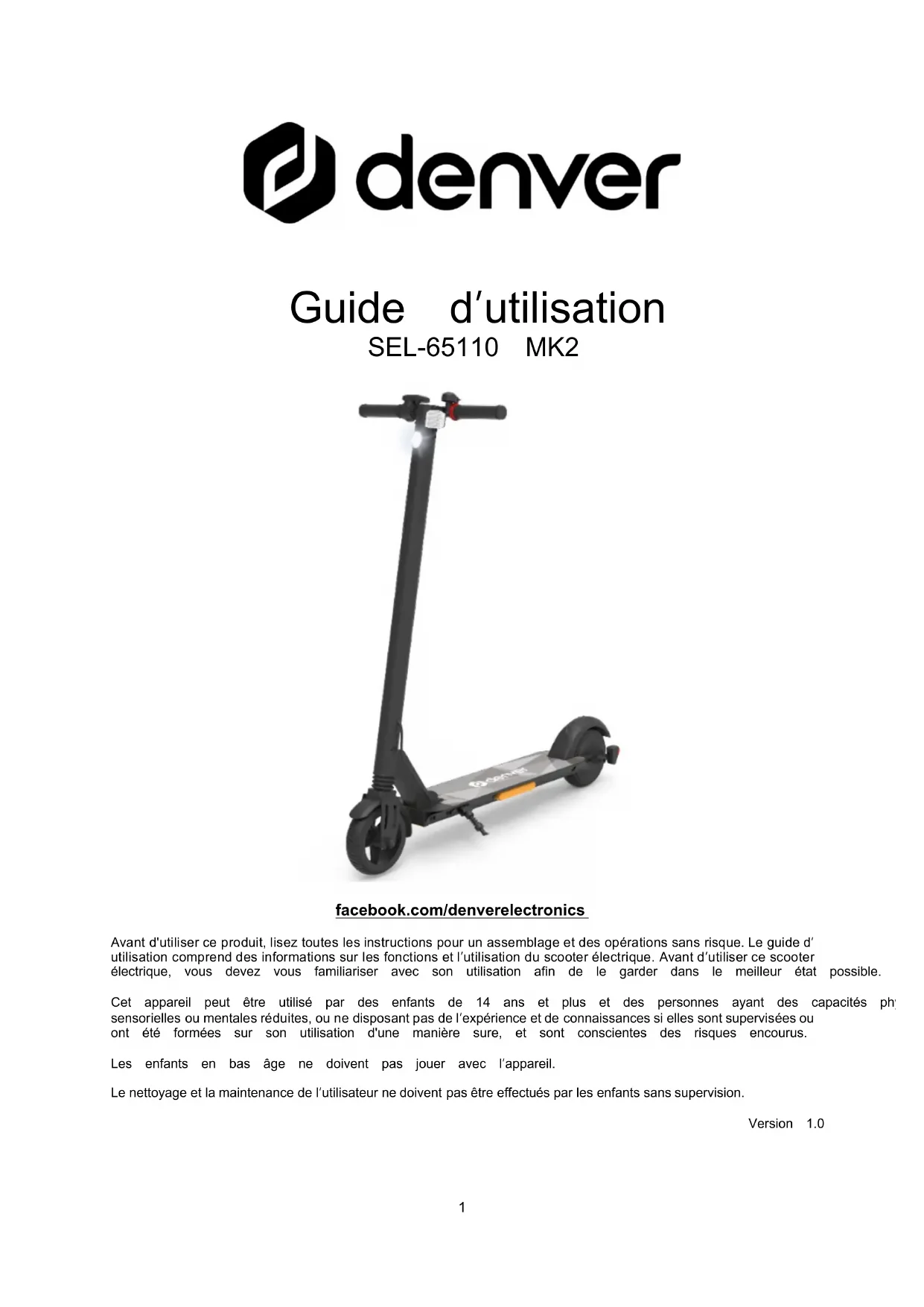 - Guide d’utilisation SEL-65110 MK2 facebook.com/denverelectronics Avant d'utiliser ce produit, lisez toutes les instructions pour un assemblage et des opérations sans risque. Le guide d’ utilisation comprend des informations sur les fonctions et l’utilisation du scooter électrique. Avant d’utiliser ce scooter électrique, vous devez vous familiariser avec son utilisation afin de le garder dans le meilleur état possible. Cet appareil peut être utilisé par des enfants de 14 ans et plus et des personnes ayant des capacités physiques, sensorielles ou mentales réduites, ou ne disposant pas de l’expérience et de connaissances si elles sont supervisées ou ont été formées sur son utilisation d'une manière sure, et sont conscientes des risques encourus. Les enfants en bas âge ne doivent pas jouer avec l’appareil. Le nettoyage et la maintenance de l’utilisateur ne doivent pas être effectués par les enfants sans supervision. Version 1.02 Table des matières 1. Produit et accessoires p. 3