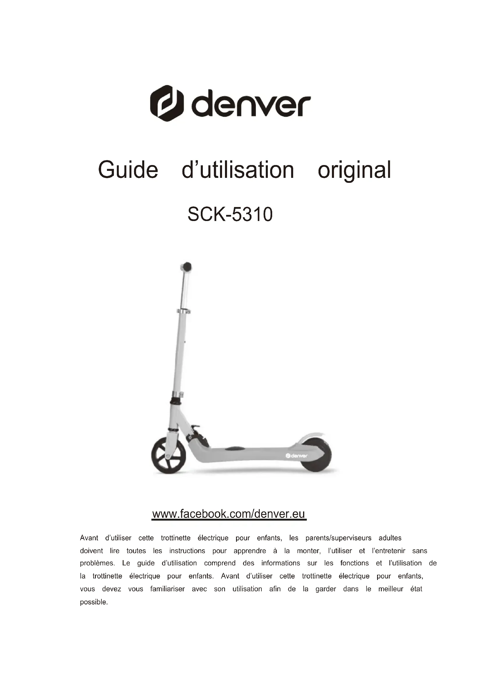 Guide d’utilisation original SCK-5310 www.facebook.com/denver.eu Avant d’utiliser cette trottinette électrique pour enfants, les parents/superviseurs adultes doivent lire toutes les instructions pour apprendre à la monter, l’utiliser et l’entretenir sans problèmes. Le guide d’utilisation comprend des informations sur les fonctions et l’utilisation de la trottinette électrique pour enfants. Avant d’utiliser cette trottinette électrique pour enfants, vous devez vous familiariser avec son utilisation afin de la garder dans le meilleur état possible.AVERTISSEMENT ! Cet appareil peut être utilisé par des enfants de 6 ans et plus et des personnes ayant des capacités physiques, sensorielles ou mentales réduites, ou manquant d’expérience et de connaissances si elles supervisées ou instruites en ce qui concerne l’utilisation de l’appareil en sécurité, et si elles comprennent des dangers impliqués. Les enfants en bas âge ne doivent pas jouer avec l’appareil. Le nettoyage et la maintenance de l’utilisateur ne doivent pas être effectués par les enfants sans supervision.