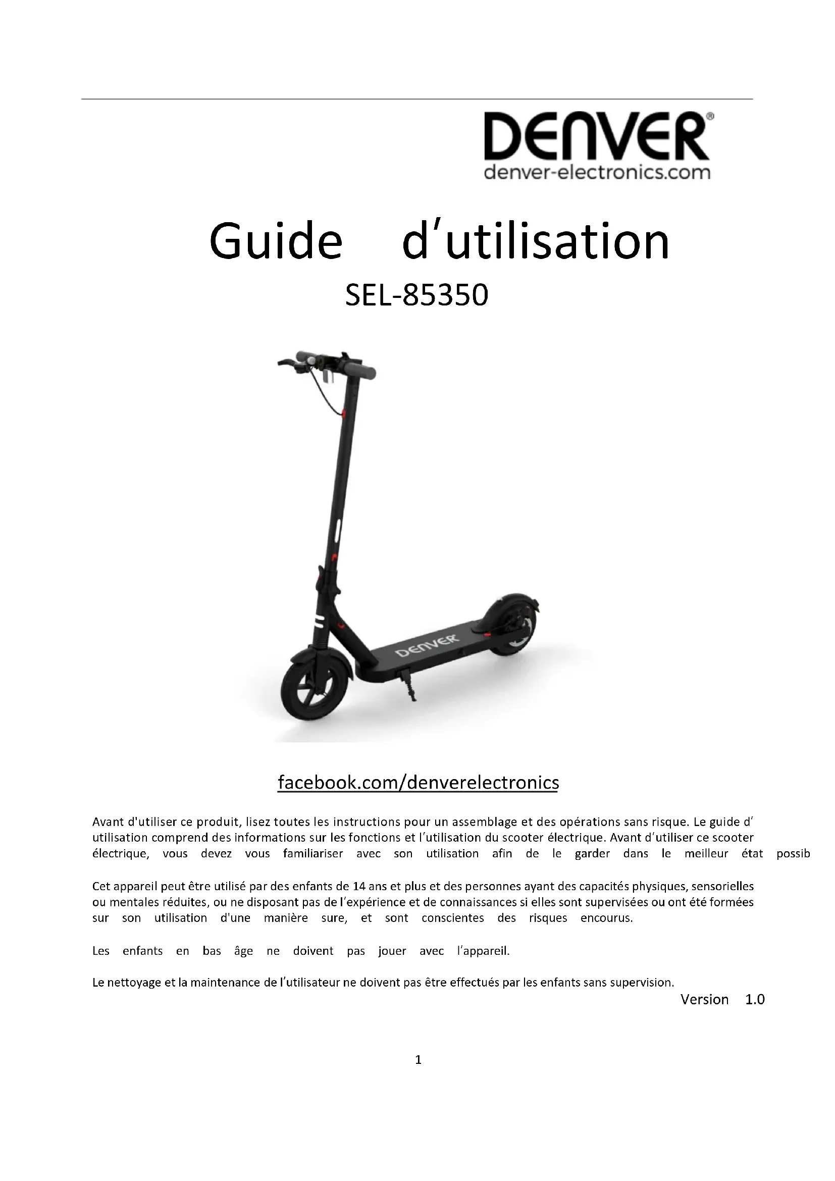 - Guide d’utilisation SEL-85350 facebook.com/denverelectronics Avant d'utiliser ce produit, lisez toutes les instructions pour un assemblage et des opérations sans risque. Le guide d’ utilisation comprend des informations sur les fonctions et l’utilisation du scooter électrique. Avant d’utiliser ce scooter électrique, vous devez vous familiariser avec son utilisation afin de le garder dans le meilleur état possible. Cet appareil peut être utilisé par des enfants de 14 ans et plus et des personnes ayant des capacités physiques, sensorielles ou mentales réduites, ou ne disposant pas de l’expérience et de connaissances si elles sont supervisées ou ont été formées sur son utilisation d'une manière sure, et sont conscientes des risques encourus.Les enfants en bas âge ne doivent pas jouer avec l’appareil. Le nettoyage et la maintenance de l’utilisateur ne doivent pas être effectués par les enfants sans supervision. Version 1.02 Table des matières 1 Produit et accessoires p. 3