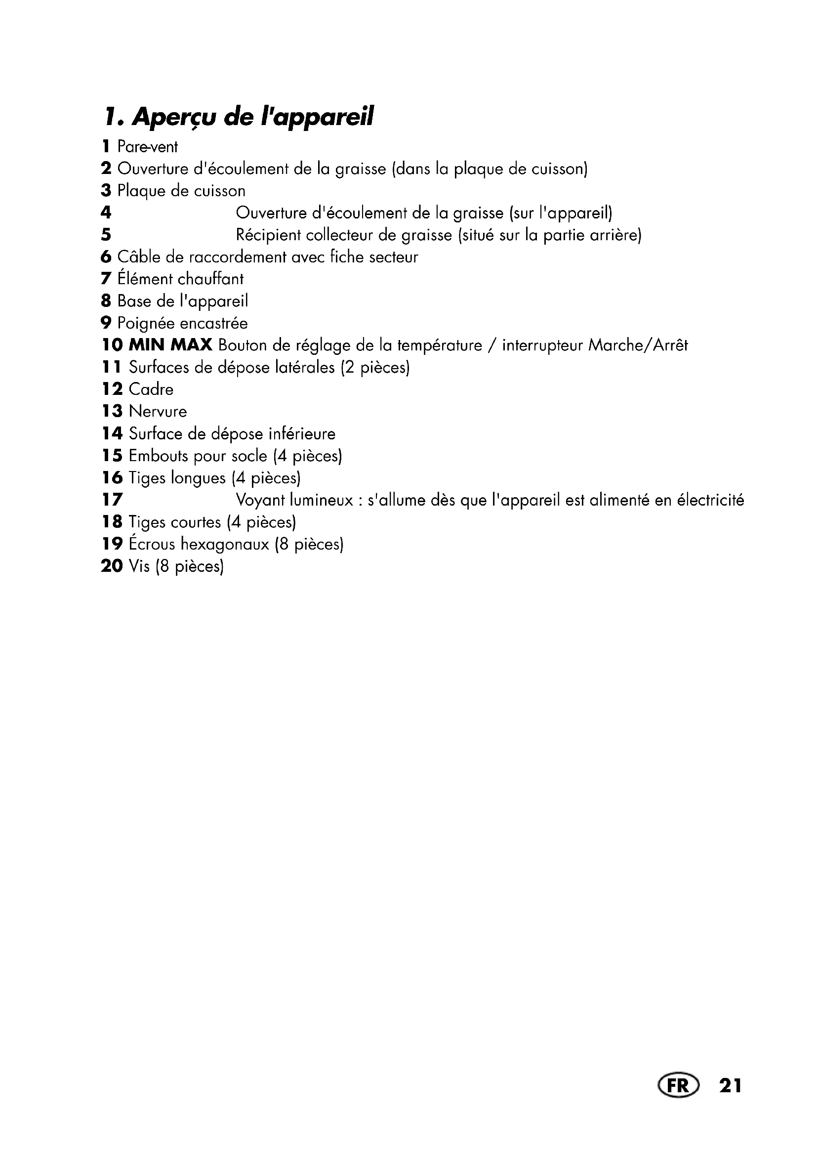 1 Pare-vent 2 Ouverture d'écoulement de la graisse (dans la plaque de cuisson) 3 Plaque de cuisson 4 Ouverture d'écoulement de la graisse (sur l'appareil) 5 Récipient collecteur de graisse (situé sur la partie arrière) 6 Câble de raccordement avec fiche secteur 7 Élément chauffant 8 Base de l'appareil 9 Poignée encastrée 10 MIN MAX Bouton de réglage de la température / interrupteur Marche/Arrêt 11 Surfaces de dépose latérales (2 pièces) 12 Cadre 13 Nervure 14 Surface de dépose inférieure 15 Embouts pour socle (4 pièces) 16 Tiges longues (4 pièces) 17 Voyant lumineux : s'allume dès que l'appareil est alimenté en électricité 18 Tiges courtes (4 pièces) 19 Écrous hexagonaux (8 pièces) 20 Vis (8 pièces) __332580_Elektrogrill mit Stand_B6.book Seite 21 Freitag, 10. Januar 2020 10:20 1022