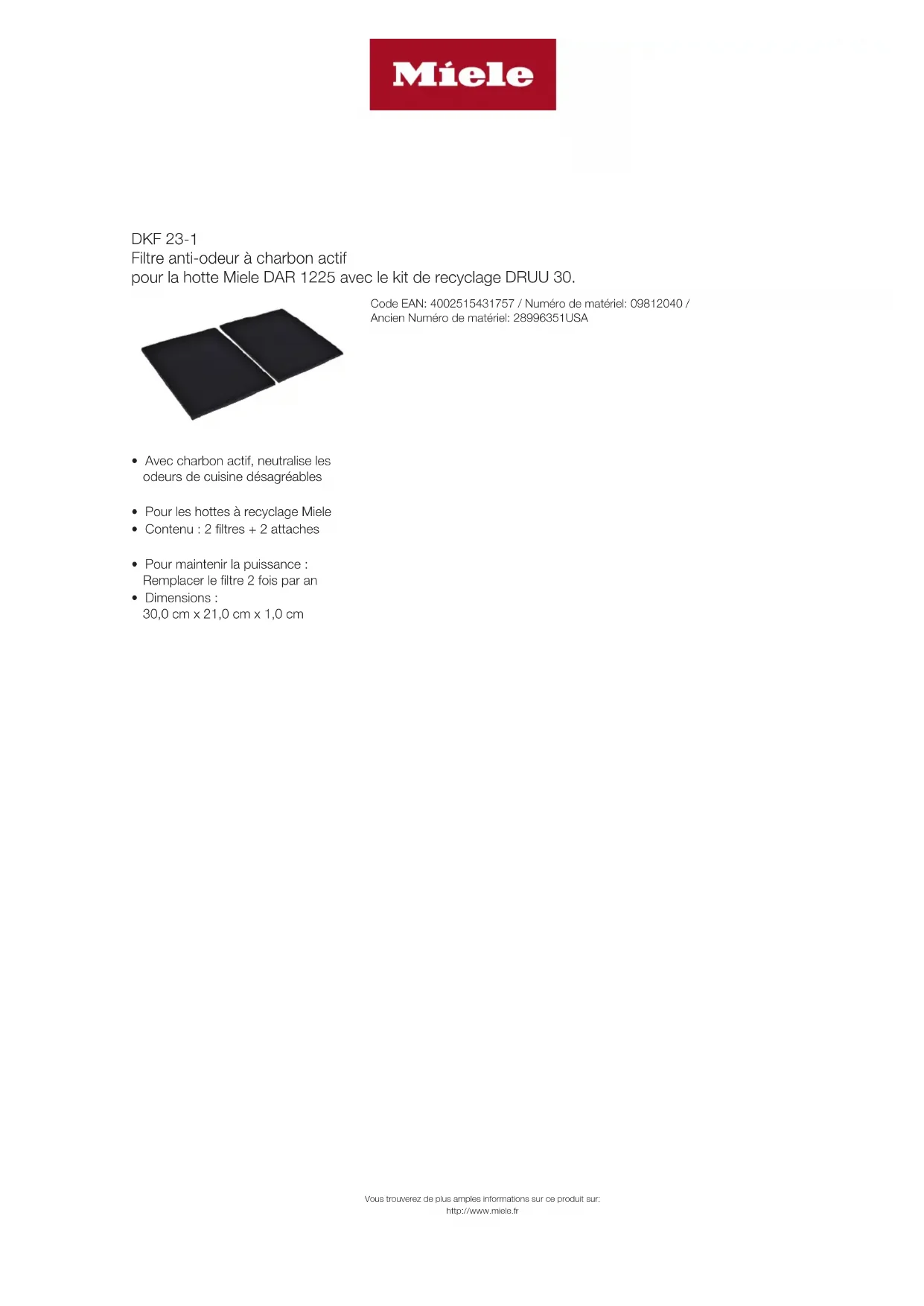 DKF 23-1 Filtre anti-odeur à charbon actif pour la hotte Miele DAR1225 avec le kit de recyclage DRUU30. Vous trouverez de plus amples informations sur ce produit sur: http://www.miele.fr