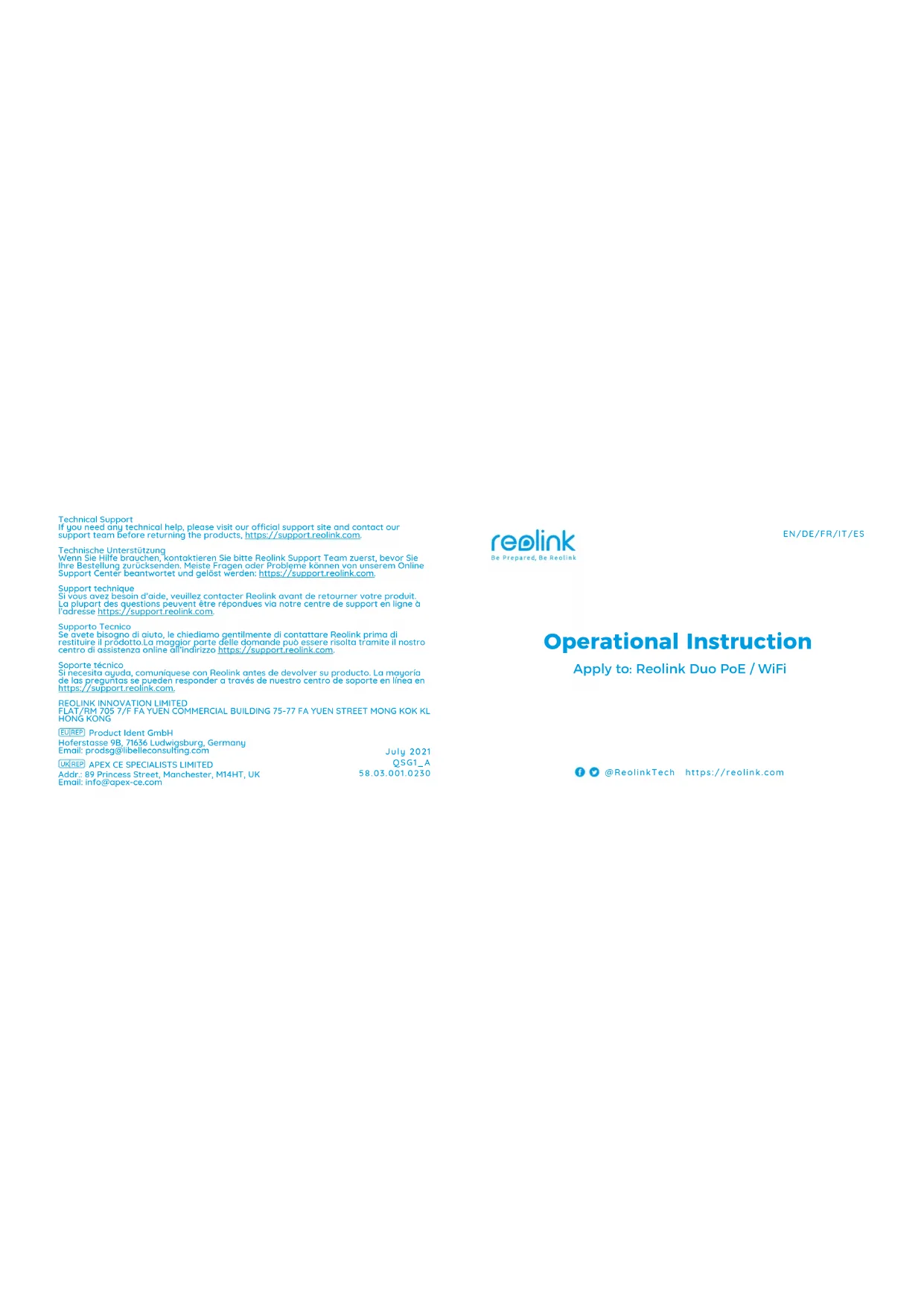 - Consulterlerevendeurouuntechnicien radio/TVexpérimentépourobtenirde l’aide. AvertissementFCCRF: L’appareilaétéévaluépourrépondre auxexigencesgénéralesd’expositionaux RF.L’appareilpeutêtreutilisédansdes conditionsd’expositionportablesans restriction. modicationsnonexpressément approuvésparlapartieresponsabledela conformitépourraientannulerl’autoritéde l’utilisateuràutiliserl’équipement.Français Français53 54 Ceproduitestassortid’unegarantie limitéede2ansquin’estvalableques’ilest achetédanslaboutiqueocielleReolink ouchezunrevendeuragrééReolink. Ensavoirplus: https://reolink.com/warranty-and-return/. Garantie limitée NOTA: Nousespéronsquevous apprécierezcenouvelachat.Maissivous n’êtespassatisfaitduproduitetsivous voulezleretourner,nousvousconseillons vivementderéinitialiserl’appareilaux réglagesd’usinepardéfautavantdele retourner. L’utilisationduproduitestsoumiseàvotre acceptationdesConditionsd’utilisation etdelaPolitiquedeconfidentialitésur https://reolink.com.Tenez-lehorsdela portéedesenfants. Conditions et Condentialité Enutilisantlelogicielduproduitintégréau produitReolink,vousacceptezlestermes duprésentcontratdelicenced’utilisateur final(«CLUF»)entrevousetReolink.En savoirplus:https://reolink.com/eula/. LacaméraWiFiestconformeauxlimites d’expositionauxrayonnements RSS-102définiespourunenvironnement Contrat de licence d’utilisateur nal ISED Déclaration d’exposition aux rayonnements (pour la version WiFi) Cemarquageindiquequeceproduitne doitpasêtreéliminéavecd’autresdéchets ménagersdansl’UE.Pouréviterque l’éliminationincontrôléedesdéchetsne nuiseàl’environnementouàlasanté humaine,recyclez-lesdemanière responsableandepromouvoirla réutilisation durable des ressources matérielles.Pourretournervotre appareilusagé,veuillezutiliserles systèmesderetouretdecollecteou 2412MHz---2472MHz(19dBm) 5150MHz---5350MHz(18dBm) 5470MHz---5725MHz(18dBm)