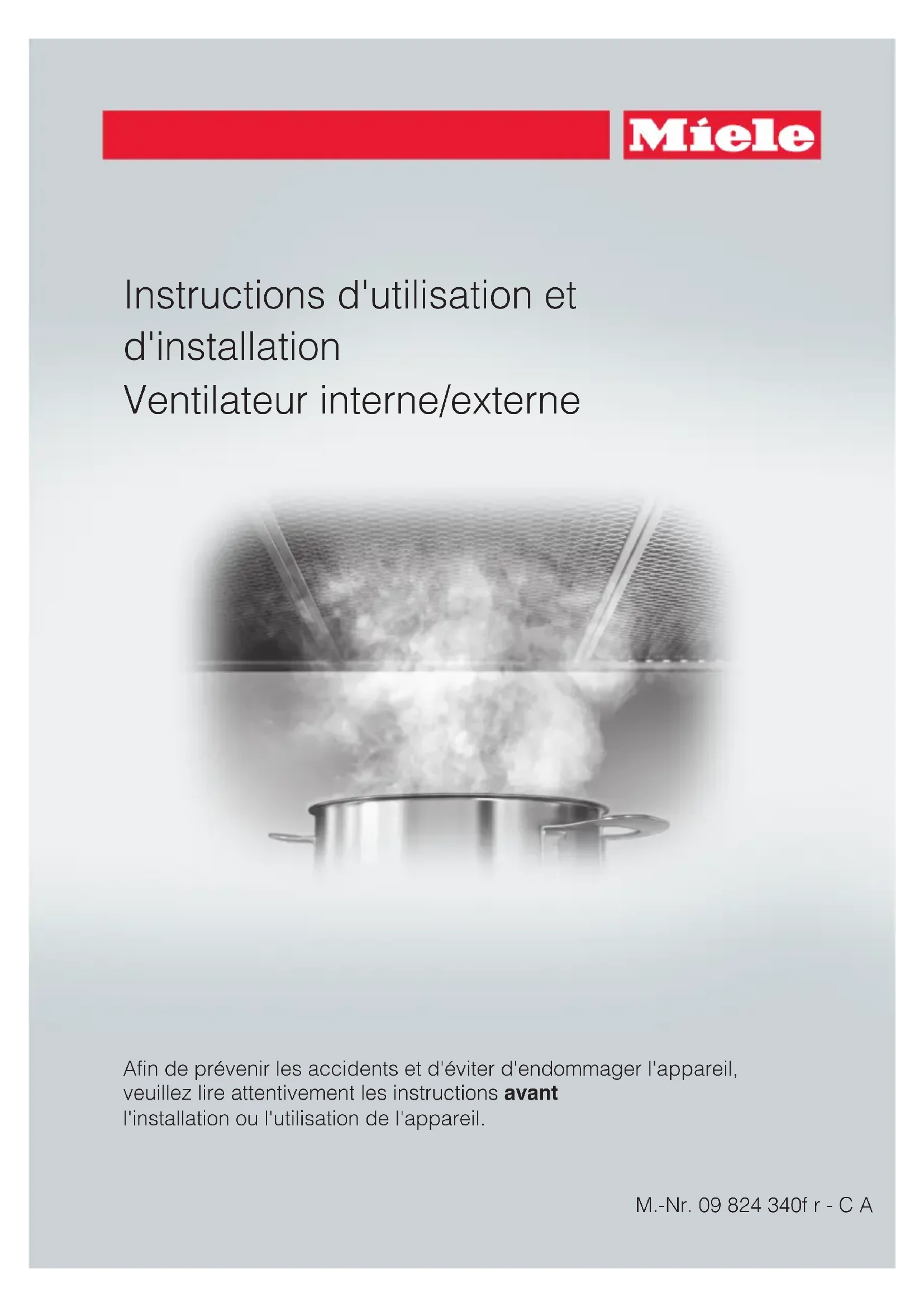 - Instructions d'utilisation et d'installation Ventilateur interne/externe Afin de prévenir les accidents et d'éviter d'endommager l'appareil, veuillez lire attentivement les instructions avant l'installation ou l'utilisation de l'appareil. M.-Nr. 09 824 340fr-CAINSTRUCTIONS IMPORTANTES SUR LA SÉCURITÉ p. 3