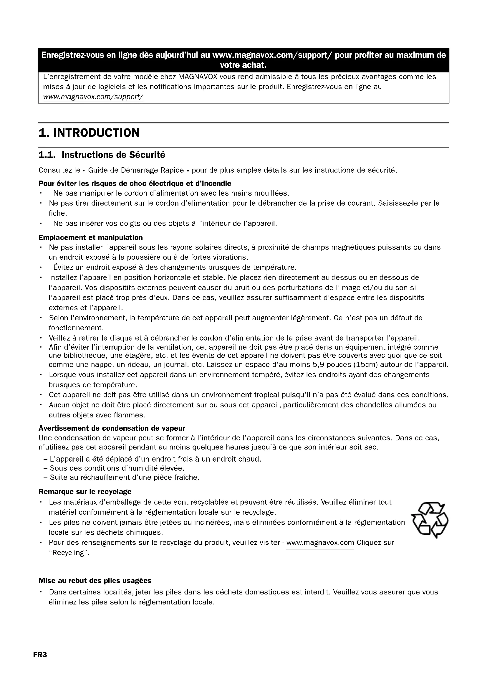 - Pour des renseignements sur le recyclage du produit, veuillez visiter - www.magnavox.com Cliquez sur “Recycling”. Mise au rebut des piles usagées