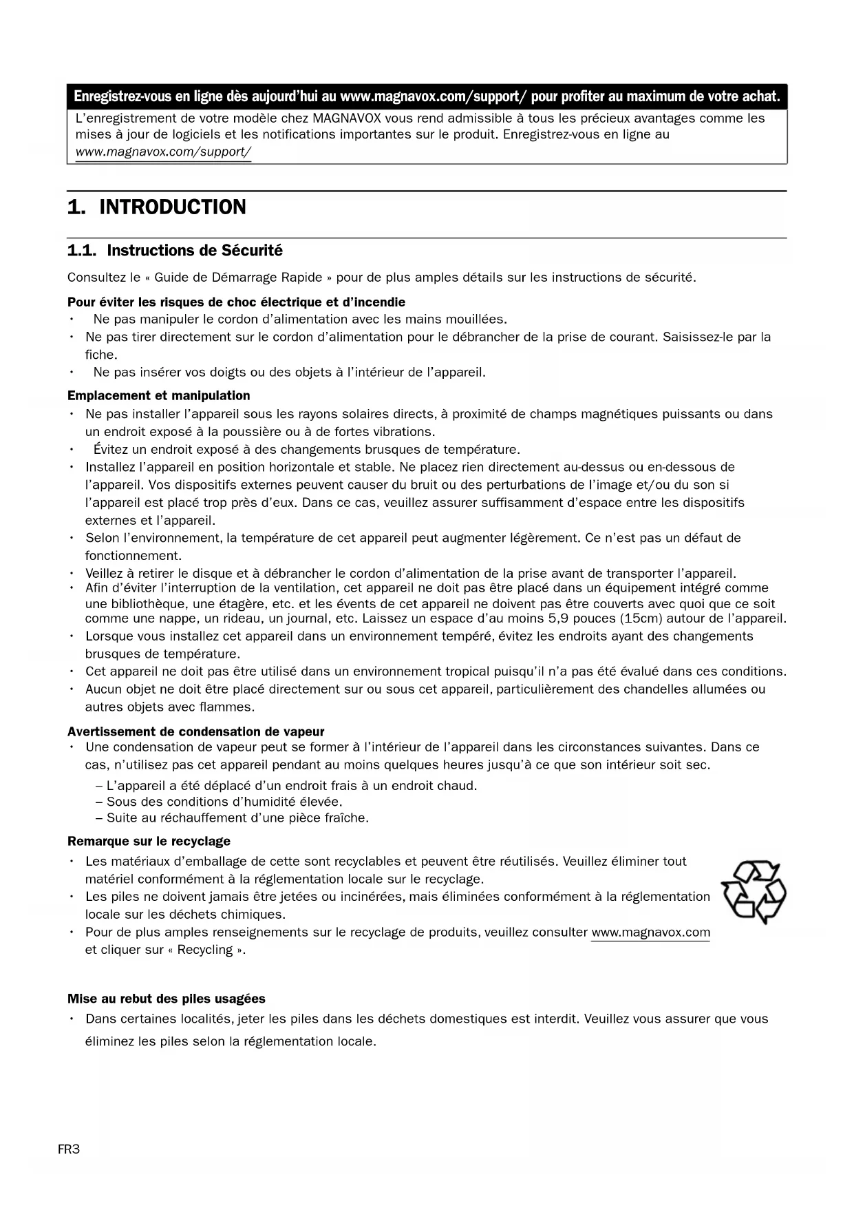 - Pour de plus amples renseignements sur le recyclage de produits, veuillez consulter www.magnavox.com et cliquer sur «Recycling». Mise au rebut des piles usagées