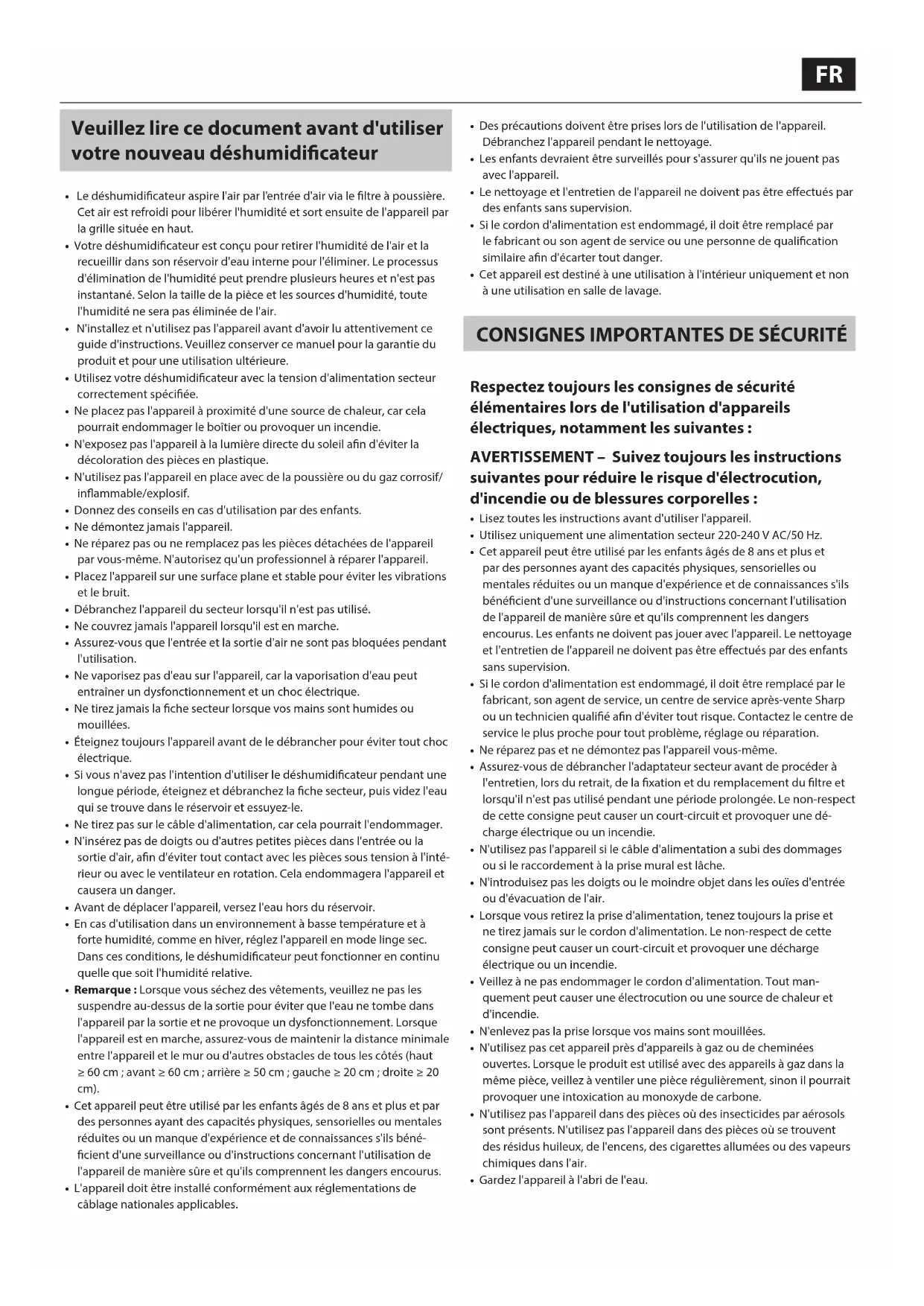 - Ne montez pas et ne vous appuyez pas sur le produit. Placement de l'appareil Évitez l'utilisation dans des emplacements où des meubles, des tissus ou autres objets peuvent entrer en contact avec l'appareil et interférer avec l'entrée et/ou la sortie d'air. Évitez l'utilisation dans des emplacements où l'appareil est exposé à de la condensation ou des changements radicaux de température. La température ambiante appropriée est comprise entre 0 °C et 35 °C. Placez l'appareil sur une surface plane et stable avec une circulation d'air susante. Placez le produit au centre de la pièce pour une meilleure circulation de l'air. Lorsqu'il est placé sur un tapis épais, l'appareil peut vibrer légèrement. Évitez les endroits avec de la graisse, de la fumée d'huile, de l'alcool, de l'acide hypochloreux ou des produits chimiques dans l'air. Cela risquerait de provoquer des ssures à l'extérieur de l'appareil. Les murs environnants et le sol autour du produit peuvent devenir sales avec le temps. Lorsque vous utilisez l'appareil pendant une période prolongée au même endroit, nettoyez périodiquement les murs et le sol adjacents. Attention: Votre produit est marqué de ce symbole. Cela signie que les produits électriques et électroniques usagés ne doivent pas être mélangés aux ordures ménagères. Il existe un système de collecte séparé pour ces produits. Informations sur la mise au rebut (pour les utilisateurs domestiques) Dans l'Union européenne SI VOUS SOUHAITEZ METTRE CET ÉQUIPEMENT AU REBUT, N'UTILISEZ PAS UNE POUBELLE ORDINAIRE ET NE LE METTEZ PAS AU FEU. Les équipements électriques et électroniques usagés doivent toujours être récupérés et traités SÉPARÉMENT selon la législation locale en vigueur. La collecte séparée permet un traitement respectueux de l'environnement, un recyclage des matériaux et minimise la quantité de déchets naux. LA MISE AU REBUT INCORRECTE peut être dangereuse pour la santé des personnes et l'environnement, les appareils pouvant contenir des substances nocives! Apportez votre ÉQUIPEMENT USAGÉ à un centre de collecte local, généralement municipal, lorsque cela est possible. En cas de doute concernant la mise au rebut, contactez vos autorités locales ou votre revendeur et renseignez-vous sur la méthode correcte de mise au rebut. UNIQUEMENT POUR LES UTILISATEURS DE L'UNION EUROPÉENNE, ET DE CERTAINS AUTRES PAYS, PAR EXEMPLE LA NORVÈGE ET LA SUISSE: Votre participation dans le tri sélectif est exigée par la loi. Le symbole présenté ci-dessus apparaît sur les appareils électroniques et électriques (ou leur emballage) pour rappeler ces règles aux utilisateurs. Les utilisateurs des FOYERS DOMESTIQUES doivent recourir aux centres de tri existants pour se débarrasser de leurs appareils usagés. La collecte est gratuite. Si l'équipement a été utilisé à DES FINS COMMERCIALES, veuillez contacter votre revendeur SHARP qui vous informera des méthodes de reprise. Il est possible que vous deviez payer des frais de reprise. Les petits appareils (en faible quantité) peuvent être repris par votre centre de collecte local. En Espagne: Veuillez contacter le système de collecte mis en place ou votre autorité locale pour la reprise de vos produits usagés. Dans d'autres pays en dehors de l'UE Si vous souhaitez vous débarrasser de ce produit, veuillez contacter vos autorités locales et demander la méthode correcte de mise au rebut. Pour la Suisse: Les appareils électriques ou électroniques usagés peuvent être retournés gratuitement au revendeur, même si vous n'achetez pas un produit neuf. Des centres de collecte additionnels sont listés sur la page web www.swico.ch ou www.sens.ch. Informations sur la mise au rebut pour les utilisateurs commerciaux Dans l'Union européenne Si le produit est utilisé à des ns commerciales et vous souhaitez vous en débarrasser: Veuillez contacter votre revendeur SHARP qui vous informera des méthodes de reprise. Il est possible que vous deviez payer des frais de reprise. Les petits appareils (en faible quantité) peuvent être repris par votre centre de collecte local. En Espagne: Veuillez contacter le système de collecte mis en place ou votre autorité locale pour la reprise de vos produits usagés. Dans d'autres pays en dehors de l'UE Si vous souhaitez vous débarrasser de ce produit, veuillez contacter vos autorités locales et demander la méthode correcte de mise au rebut. Matières inammables. Cet appareil contient du R290/ propane, un réfrigérant inammable. N'essayez pas de regazéier l'appareil. Ne libérez pas le réfrigérant dans l'atmosphère.FR Installation AVANT LA PREMIÈRE UTILISATION Laissez l'appareil reposer pendant 4 heures pour permettre au uide frigorigène de se déposer.