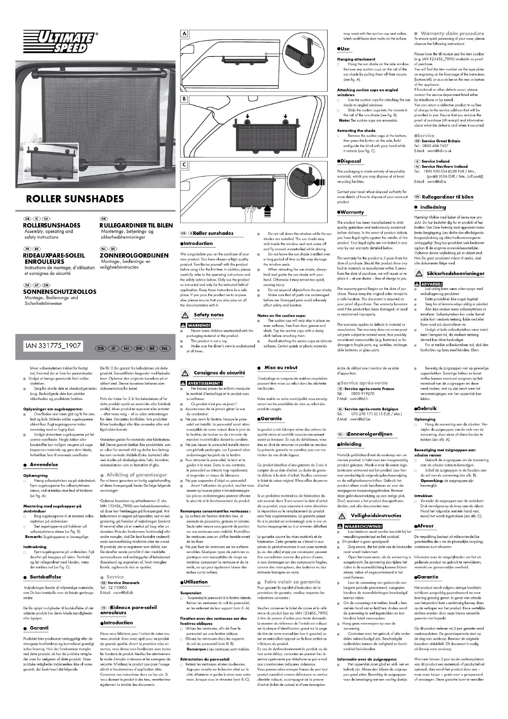 Service Service DanmarkTel.: 32 710005E-Mail: owim@lidl.dk Rideaux pare-soleil enrouleurs Introduction Nous vous félicitons pour l‘achat de votre nou-veau produit. Vous avez opté pour un produit de grande qualité. Avant la première mise en service, vous devez vous familiariser avec toutes les fonctions du produit. Veuillez lire attentivement le mode d’emploi ci-dessous et les consignes de sécurité. N’utilisez le produit que pour l’usage décrit et les domaines d’application cités. onserver ces instructions dans un lieu sûr. Si vous donnez le produit à des tiers, remettez-leur également la totalité des documents. Consignes de sécurité Ne laissez jamais les enfants manipuler le matériel d‘emballage et le produit sans surveillance. Ce produit n‘est pas un jouet ! Assurez-vous de ne jamais gêner la vue du conducteur. Ne pas ouvrir la fenêtre, lorsque le pare- soleil est installé. Le pare-soleil serait alors susceptible de rester coincé dans le joint de la fenêtre, de tomber ou de s‘envoler de manière incontrôlable durant la conduite. Ne pas laisser le pare-soleil installé durant une période prolongée, car il pourrait alors endommager les joints de la fenêtre. Pour rétracter le pare-soleil, le tenir et le guider à la main. Dans le cas contraire, le pare-soleil se rétracte trop rapidement, et engendre un risque de blessures. Ne pas suspendre d‘objet au pare-soleil. Avant l‘utilisation du produit, veuillez vous assurer qu‘aucune pièce n‘est endommagée. Les pièces endommagées peuvent affecter la sécurité et le fonctionnement du produit.Remarques concernant les ventouses : La surface de fixation doit être lisse, et exempte de poussières, graisses et calcaire. Seule cette mesure vous garantit de position-ner vos ventouses avec stabilité. Humidifiez les ventouses avec un chiffon humide avant de les fixer. Ne pas fixer de ventouses sur les surfaces sensibles. Quelques types de peintures ou plastiques sont susceptibles de réagir au matériau composant la ventouse et de ra-mollir, ce qui peut également laisser des taches sur la surface. Utilisation Suspension Suspendez le pare-soleil à la fenêtre latérale. Retirez les ventouses du rail du pare-soleil, en les enlevant de leur support (voir ill. A).Fixation avec des ventouses sur des fenêtres obliques Utilisez les ventouses, afin de fixer le pare-soleil sur une fenêtre oblique. Glissez les ventouses dans les supports du rail du pare-soleil (voir ill. B). Remarque : Les ventouses sont mobiles. Rétractation du pare-soleil Retirez les ventouses situées au-dessous. Appuyez ensuite sur le bouton situé sur le côté. Maintenir et guider le store avec votre main, lorsque vous le rétractez (voir ill. C). Mise au rebut L’emballage se compose de matières recyclables pouvant être mises au rebut dans les déchette-ries locales.Votre mairie ou votre municipalité vous renseig-neront sur les possibilités de mise au rebut des produits usagés. Garantie Le produit a été fabriqué selon des critères de qualité stricts et contrôlé consciencieusement avant sa livraison. En cas de défaillance, vous êtes en droit de retourner ce produit au vendeur. La présente garantie ne constitue pas une res-triction de vos droits légaux.Ce produit bénéficie d‘une garantie de 3 ans à compter de sa date d’achat. La durée de garan-tie débute à la date d’achat. Veuillez conserver le ticket de caisse original. Il fera office de preuve d’achat.Si un problème matériel ou de fabrication de-vait survenir dans 3 ans suivant la date d‘achat de ce produit, nous assurons à notre discrétion la réparation ou le remplacement du produit sans frais supplémentaires. La garantie prend fin si le produit est endommagé suite à une uti-lisation inappropriée ou à un entretien défaillant.La garantie couvre les vices matériels et de fabrication. Cette garantie ne s’étend ni aux pièces du produit soumises à une usure normale (p. ex. des piles) et qui, par conséquent, peuvent être considérées comme des pièces d’usure, ni aux dommages sur des composants fragiles, comme des interrupteurs, des batteries ou des éléments fabriqués en verre. Faire valoir sa garantie Pour garantir la rapidité d’exécution de la procédure de garantie, veuillez respecter les indications suivantes :Veuillez conserver le ticket de caisse et la réfé-rence du produit (par ex. IAN 123456_7890) à titre de preuve d’achat pour toute demande.Le numéro de référence de l’article est indiqué sur la plaque d’identification, gravé sur la page de titre de votre manuel (en bas à gauche) ou sur un autocollant apposé sur la face arrière ou inférieure du produit.En cas de dysfonctionnement du produit, ou de tout autre défaut, contactez en premier lieu le service après-vente par téléphone ou par e-mail aux coordonnées indiquées ci-dessous.Vous pouvez alors envoyer franco de port tout produit considéré comme défectueux au service clientèle indiqué, accompagné de la preuve d’achat (ticket de caisse) et d’une description écrite du défaut avec mention de sa date d’apparition. Service après-vente Service après-vente FranceTél. : 0800 919270E-Mail : owim@lidl.fr Service après-vente BelgiqueTél. : 070 270 171 (0,15 EUR / Min.)E-Mail : owim@lidl.be Zonnerolgordijnen Inleiding Hartelijk gefeliciteerd met de aankoop van uw nieuwe product. U hebt voor een hoogwaardig product gekozen. Maak u voor de eerste inge-bruikname vertrouwd met het product. Lees hier-voor aandachtig de volgende gebruiksaanwijzing en de veiligheidsvoorschriften. Gebruik het product alleen zoals beschreven en voor de aangegeven toepassingsgebieden. Bewaar deze gebruiksaanwijzing op een veilige plek. Geef, wanneer u het product doorgeeft aan derden, ook alle documenten mee. Veiligheidsinstructies Laat kinderen nooit zonder toezicht bij het verpakkingsmateriaal en het product. Dit product is geen speelgoed! Zorg ervoor, dat het z