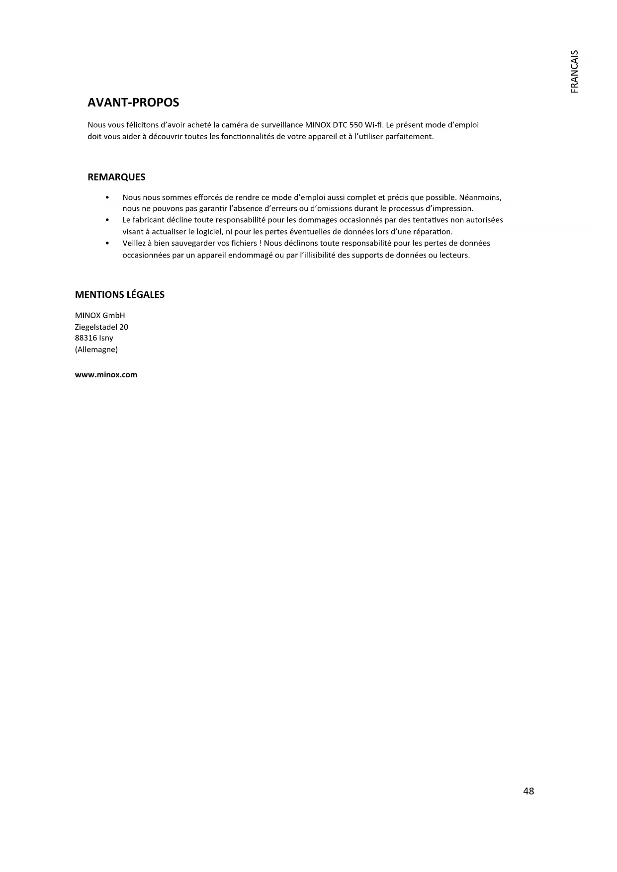 Aperçu 47 Avant-propos 48 Généralités 49 Caractéristiques de la caméra de surveillance 50 Première mise en surveillance 51 Utilisation 53 Connexion informatique 59 Application MINOX WIFI TRAIL CAM 60 Résolution des erreurs 65 Données techniques 66 Conservation 68 Nettoyage 6847 FRANCAIS48 FRANCAIS AVANT-PROPOS Nous vous félicitons d’avoir acheté la caméra de surveillance MINOX DTC 550 Wi-fi. Le présent mode d’emploi doit vous aider à découvrir toutes les fonctionnalités de votre appareil et à l’utiliser parfaitement.