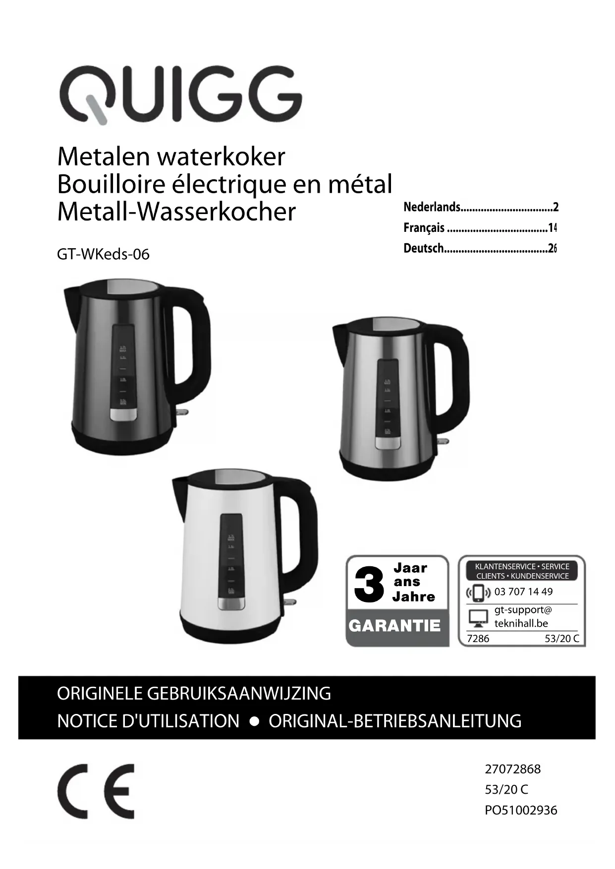 - eveneens weg. Vervolgens kunt u uw waterkoker weer gewoon gebruiken.12 Storing & remedie Technische gegevens Stroomvoorziening: 230-240 V~, 50 Hz Capaciteit: max. 1,7 Liter min. 0,5 Liter Vermogen: 2850-3100 Watt Beschermingsklasse: I Omdat onze producten voortdurend verder ontwikkeld en verbeterd worden, zijn wijzigingen in het design en technische veranderingen mogelijk. Deze gebruiksaanwijzing kan ook als pdf-bestand van onze homepage www.gt-support.de worden gedownload. Storing Mogelijke oorzaak en remedie Werkt niet. - Zit de stekker in het stopcontact? -Staat de waterkoker juist op de sok- kel? -Werd de droogkookbeveiliging geactiveerd? (zie pagina 9). Het koken duurt erg lang. - De waterkoker moet ontkalkt worden, zie pagina 11. Bij het uitgieten komt er maar weinig water uit de schenktuit. -Ga na of het filterinzetstuk vuil is en maak het eventueel schoon, zie pagina 10. Op de bodem aan de binnenkant van de waterkoker vormen zich vlekken. -Het gaat hier om kalkafzetting. Deze is onschadelijk, maar moet regelmatig worden verwijderd, zie pagina 11. De waterkoker schakelt niet uit, hoe- wel het water kookt. -Waterkoker uitschakelen en laten afkoelen. Controleer of het deksel gesloten en vastgeklikt is. Gevaar voor brandwonden door hete stoom!13 Afvoer Verpakking afvoeren Gooi de verpakking soort bij soort weg. Leg karton en kartonnen dozen bij het oud papier en breng folie naar de inzameling van herbruikbare materialen. Apparaat afvoeren Oude apparaten mogen niet in het normale huisvuil worden wegge- gooid. In overeenstemming met richtlijn 2012/19/EU moet het apparaat aan het einde van zijn levensduur via een geregelde afvoer worden ver- wijderd. Daarbij worden de in het apparaat aanwezige waardevolle stoffen verder doorge- leid voor hergebruik en wordt belasting van het milieu voorkomen. Breng het oude apparaat naar een inzamelpunt voor elektronisch afval of een hergebruik- centrum. Gooi ook de verpakkingsmaterialen weg in overeenstemming met de milieuei- sen, door ze soort bij soort in de beschikbaar gestelde inzamelcontainers te gooien. Neem voor nadere informatie contact op met uw plaatselijke afvalverwijderings- bedrijf of uw gemeentebestuur. Conformiteitsverklaring De conformiteit van het product met de wettelijk voorgeschreven normen wordt gewaarborgd. De volledige Conformiteitsverklaring vindt u op het internet op www.gt-support.de. Met dit symbool gemarkeerde producten voldoen aan alle toepasse- lijke Gemeenschapsvoorschriften van de Europese Economische Ruimte. Geteste veiligheid: producten die dit teken dragen, voldoen aan de eisen van de Duitse productveiligheidswet van de productveilig- heidswetgeving, (ProdSG).14 Sommaire Consignes de sécurité p. 15