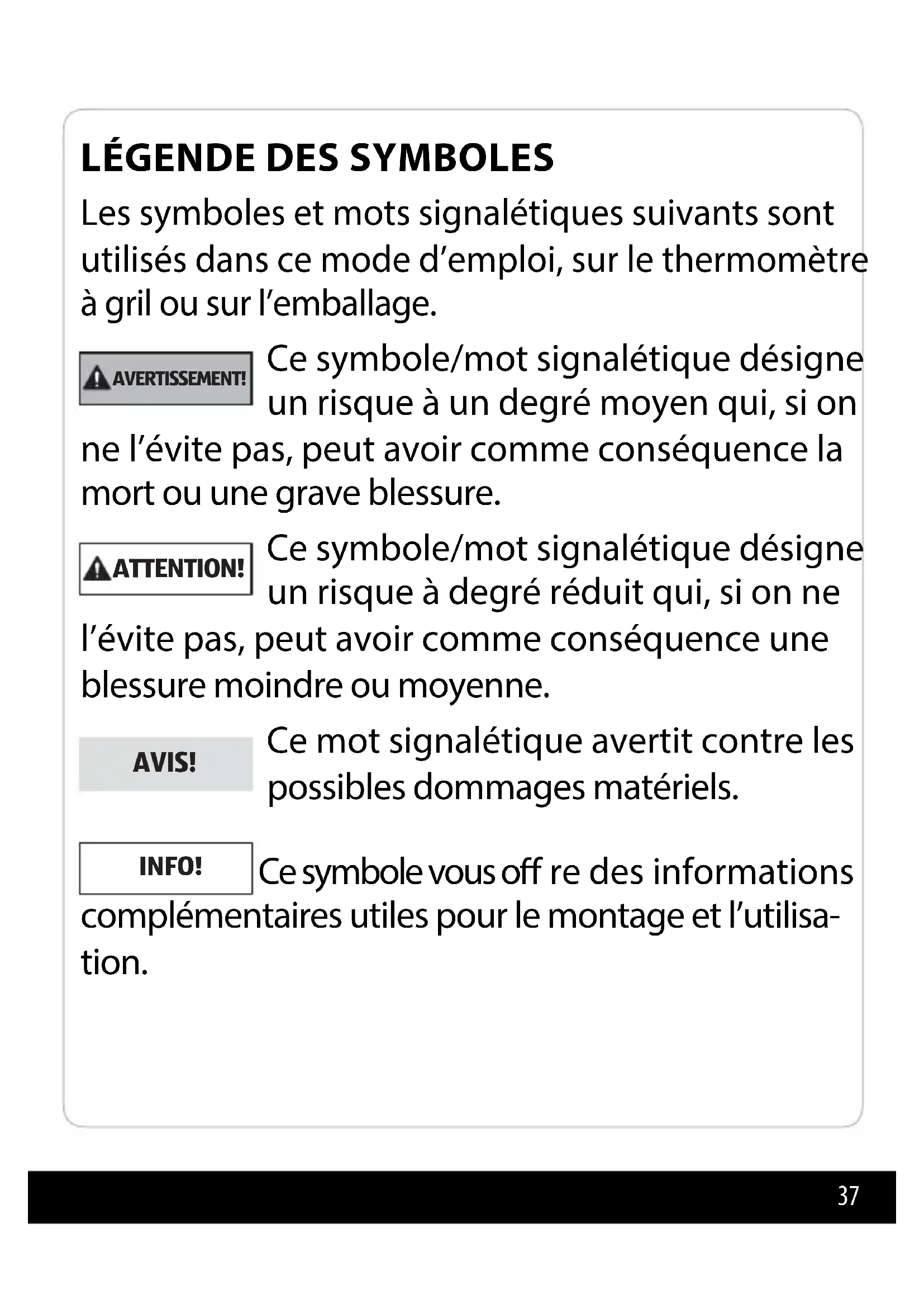 Les symboles et mots signalétiques suivants sont utilisés dans ce mode d’emploi, sur le thermomètre à gril ou sur l’emballage. AVERTISSEMENT! Ce symbole/mot signalétique désigne un risque à un degré moyen qui, si on ne l’évite pas, peut avoir comme conséquence la mort ou une grave blessure. ATTENTION! Ce symbole/mot signalétique désigne un risque à degré réduit qui, si on ne l’évite pas, peut avoir comme conséquence une blessure moindre ou moyenne. AVIS! Ce mot signalétique avertit contre les possibles dommages matériels. INFO! Ce symbole vous o re des informations complémentaires utiles pour le montage et l’utilisa- tion.38 Attention particulière! Lisez le mode d’emploi attentivement, en par- ticulier les consignes de sécurité. Ce symbole signi e que le thermomètre du gril convient aux aliments. Les produits marqués par ce symbole ré- pondent à toutes les consignes commu- nautaires de l’Espace économique européen. Étiquetage DEEE : Il est interdit de jeter l’appareil avec les dé- chets ménagers. Recyclage des piles : Il est interdit de jeter les piles et accus avec les ordures ménagères.39