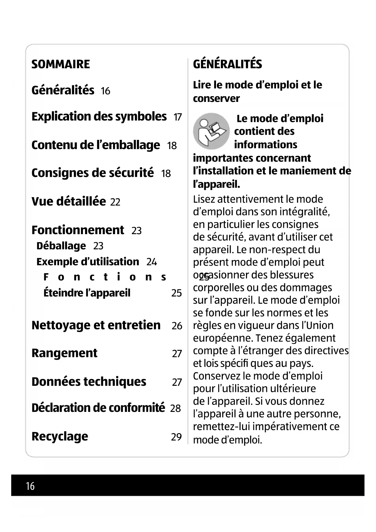 Explication des symboles 17 Contenu de l’emballage 18 Consignes de sécurité 18 Vue détaillée 22 Fonctionnement 23 Déballage 23 Exemple d’utilisation 24 Fonctions 25 Éteindre l’appareil 25 Nettoyage et entretien 26 Rangement 27 Données techniques 27