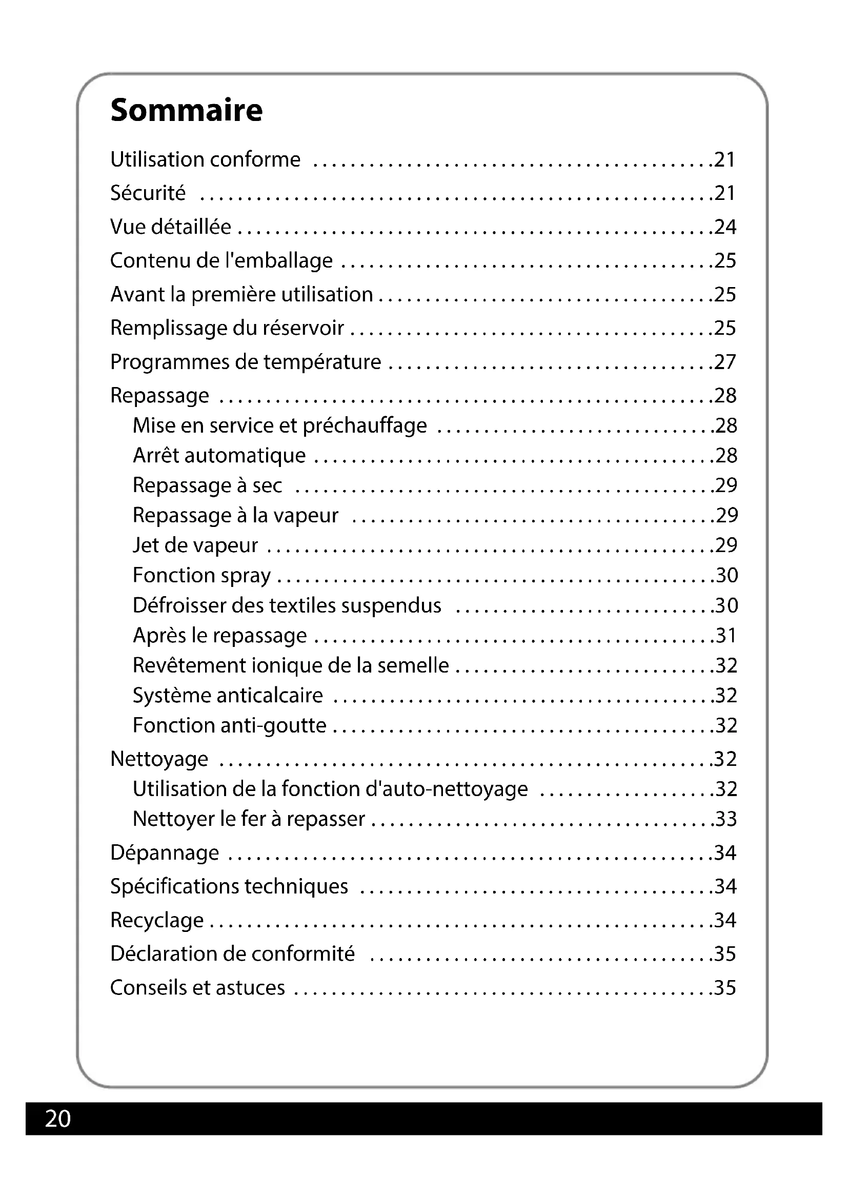 - Het strijken van wol is meestal niet no- dig. Als u dat toch wilt, strijk het kle- dingstuk dan tussen twee handdoeken en gebruik het temperatuurprogramma 8. Hemden en bloezen z Bij het strijken van hemden en bloe- zen is een brede strijkplank handig. z Strijk eerst passen en kraag van bin- nen, dan van buiten, daarna de kno- pen- en knoopsgatenbies van bin- nen. z Begin bij de mouwen met de man- chetten, die u eerst aan de binnen- en dan aan de buitenkant strijkt. Strijk daarna de mouwen eerst van de voor-, dan van de achterkant. z Strijk in de volgende stap het voor- pand. Leg daarvoor het hemd met de knopenbies zo op de strijkplank, dat de punt van de strijkplank de hemdpas raakt. Strijk het eerste hal- ve voorpand van het hemd over de hele lengte, daarna ook het tweede halve hemdvoorpand. z Strijk nu op de beschreven wijze ook het rugpand van het hemd. De tips & trucs vormen geen vervan- ging voor het lezen van deze hand- leiding. Als u hierna een tip of aan- wijzing vindt die in tegenspraak is met de gebruiksaanwijzing van het strijkijzer, moet u deze negeren. Houd u steeds aan de instructies van de handleiding. Dampfbuegeleisen BEL Druckbuch.book Seite 17 Dienstag, 2. Mai 2017 2:39 1418 z Hang het hemd op een kleerhanger om uit te dampen. Broeken z Als eerste strijkt u de broekzakken, daarna de broeksband eerst van binnen, dan van buiten. z Trek daarna het bovendeel van de broek over de strijkplank en strijk het aan beide zijden. z Moet de broek een strijkvouw heb- ben? Dan legt u het linker broeks- been met de buitenkant zo op de strijkplank, dat de beide naden pre- cies op elkaar liggen. Let daarbij op de aanwezige strijkvouwen. z Strijk eerst de binnenzijde van het broeksbeen, dan de buitenzijde. Doe hetzelfde met het tweede broeksbeen. z Hang de broek op een broekhanger om uit te dampen. z Per ongeluk ingestreken kreuken kunnen met een stoomstoot weer worden weggestreken. Buiten- of binnenkant? z Als u een glanzende stofbovenkant wilt, bijv. bij tafellinnen, strijkt u het wasgoed van buiten. Als u dat juist niet wilt, bijv. bij kleren, strijkt u deze vanaf de binnenkant. z Strijk donkere en tere stoffen aan de binnenkant. Of leg een doek tussen strijkijzer en stof. Belangrijk is dat vooral bij fluweel en ribfluweel. Als u deze stoffen direct strijkt, krijgt u glanzende plekken. z Applicaties en borduursels worden bijzonder mooi, als u ze op een zachte ondergrond eerst aan de buitenkant en dan aan de binnen- kant strijkt. Ditjes & datjes z Neem de was nog vochtig van de lijn of kies de instelling “strijkvoch- tig”, als u een droger gebruikt. De was glad vouwen en snel strijken. z Controleer de strijktemperatuur op een verborgen plek. Zo redt u het kledingstuk, als het ijzer te heet was. z Strijk bij hemden, bloezen en kleren eerst de moeilijk toegankelijke plekken aan beide zijden: knopen- biezen, manchetten, kragen en zak- ken. Pas daarna zijn de grote vlak- ken aan de beurt. z Een mouwplank is handig bij hem- den en bloezen. Hiermee worden ook moeilijk toegankelijke delen glad. z In de rust ligt de kracht: strijk lang- zaam en gelijkmatig. Jachtige strijk- bewegingen schuiven de stof gemakkelijk bij elkaar. z Vers gestreken was moet helemaal afkoelen, voordat deze in de kast wordt gelegd. Strijkwarme was kreukt gemakkelijker. Dampfbuegeleisen BEL Druckbuch.book Seite 18 Dienstag, 2. Mai 2017 2:39 14Dampfbuegeleisen BEL Druckbuch.book Seite 19 Dienstag, 2. Mai 2017 2:39 1420 Sommaire Utilisation conforme . . . . . . . . . . . . . . . . . . . . . . . . . . . . . . . . . . . . . . . . . . .21 Sécurité . . . . . . . . . . . . . . . . . . . . . . . . . . . . . . . . . . . . . . . . . . . . . . . . . . . . . . .21 Vue détaillée . . . . . . . . . . . . . . . . . . . . . . . . . . . . . . . . . . . . . . . . . . . . . . . . . . .24 Contenu de l'emballage . . . . . . . . . . . . . . . . . . . . . . . . . . . . . . . . . . . . . . . .25 Avant la première utilisation . . . . . . . . . . . . . . . . . . . . . . . . . . . . . . . . . . . .25 Remplissage du réservoir . . . . . . . . . . . . . . . . . . . . . . . . . . . . . . . . . . . . . . .25 Programmes de température . . . . . . . . . . . . . . . . . . . . . . . . . . . . . . . . . . .27 Repassage . . . . . . . . . . . . . . . . . . . . . . . . . . . . . . . . . . . . . . . . . . . . . . . . . . . . .28 Mise en service et préchauffage . . . . . . . . . . . . . . . . . . . . . . . . . . . . . .28 Arrêt automatique . . . . . . . . . . . . . . . . . . . . . . . . . . . . . . . . . . . . . . . . . . .28 Repassage à sec . . . . . . . . . . . . . . . . . . . . . . . . . . . . . . . . . . . . . . . . . . . . .29 Repassage à la vapeur . . . . . . . . . . . . . . . . . . . . . . . . . . . . . . . . . . . . . . .29 Jet de vapeur . . . . . . . . . . . . . . . . . . . . . . . . . . . . . . . . . . . . . . . . . . . . . . . .29 Fonction spray . . . . . . . . . . . . . . . . . . . . . . . . . . . . . . . . . . . . . . . . . . . . . . .30 Défroisser des textiles suspendus . . . . . . . . . . . . . . . . . . . . . . . . . . . .30 Après le repassage . . . . . . . . . . . . . . . . . . . . . . . . . . . . . . . . . . . . . . . . . . .31 Revêtement ionique de la semelle . . . . . . . . . . . . . . . . . . . . . . . . . . . .32 Système anticalcaire . . . . . . . . . . . . . . . . . . . . . . . . . . . . . . . . . . . . . . . . .32 Fonction anti-goutte . . . . . . . . . . . . . . . . . . . . . . . . . . . . . . . . . . . . . . . . .32 Nettoyage . . . . . . . . . . . . . . . . . . . . . . . . . . . . . . . . . . . . . . . . . . . . . . . . . . . . .32 Utilisation de la fonction d'auto-nettoyage . . . . . . . . . . . . . . . . . . .32 Nettoyer le fer à repasser . . . . . . . . . . . . . . . . . . . . . . . . . . . . . . . . . . . . .33 Dépannage . . . . . . . . . . . . . . . . . . . . . . . . . . . . . . . . . . . . . . . . . . . . . . . . . . . .34 Spécifications techniques . . . . . . . . . . . . . . . . . . . . . . . . . . . . . . .