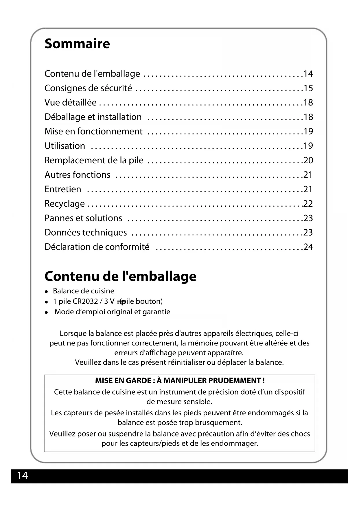 - Déclaration de conformité Contenu de l'emballage Balance de cuisine 1 pile CR2032 / 3 V (pile bouton) Mode d’emploi original et garantie Lorsque la balance est placée près d'autres appareils électriques, celle-ci peut ne pas fonctionner correctement, la mémoire pouvant être altérée et des erreurs d'affichage peuvent apparaître. Veuillez dans le cas présent réinitialiser ou déplacer la balance. MISE EN GARDE : À MANIPULER PRUDEMMENT ! Cette balance de cuisine est un instrument de précision doté d’un dispositif de mesure sensible. Les capteurs de pesée installés dans les pieds peuvent être endommagés si la balance est posée trop brusquement. Veuillez poser ou suspendre la balance avec précaution afin d’éviter des chocs pour les capteurs/pieds et de les endommager. Druckbuch Kuechenwaage BEL.book Seite 14 Mittwoch, 11. November 2020 1:52 1315 Consignes de sécurité Lire et conserver le mode d’emploi Veuillez lire attentivement les informations suivantes et en tenir compte. Prière de conserver le mode d’emploi pour toute référence future. Si vous donnez l’article à quelqu’un d’autre, veuillez remettre également le présent mode d’emploi. Instructions importantes Cet appareil peut être utilisé par des enfants âgés d’au moins 8 ans, ainsi que par des personnes ayant des capacités physiques, sensorielles ou mentales réduites ou n’ayant pas les expériences et / ou connaissances requises, à condition qu’ils soient surveillés ou aient été informés au sujet de la sécurité d’utilisation de l’appareil et qu’ils aient compris les risques en résultant. Surveillez les enfants afin de vous assurer qu’ils ne jouent pas avec l’appareil. Les travaux de nettoyage et d’entretien qui peuvent être effectués par l’utilisateur ne doivent pas être réalisés par des enfants, à moins qu’ils ne soient surveillés et âgés d’au moins 8 ans. Les piles peuvent être dangereuses. Conservez, pour cette raison, les piles hors de la portée des petits enfants. Si une pile est avalée ou si elle arrive dans le corps d’une façon ou d’une autre, demandez immédiatement l’assistance d’un médecin. Sinon, cela peut provoquer de graves brûlures dans les 2 heures et celles-ci peuvent provoquer la mort. Utilisation conforme La balance de cuisine sert à peser des aliments et de petits articles dans un cadre privé domestique. La charge maximale (voir « Caractéristiques techniques ») ne doit pas être dépassée. Druckbuch Kuechenwaage BEL.book Seite 15 Mittwoch, 11. November 2020 1:52 1316 Cette balance est prévue pour un usage ménager et conçue pour peser les quantités généralement requises dans ce cadre. Cette balance ne convient pas à un usage professionnel (boulangeries, restaurants, etc.). Risques pour les enfants Empêchez les enfants de jouer avec les emballages afin d’éviter tout risque d’asphyxie. Veillez à ce qu’ils ne se couvrent pas la tête avec le sachet d’emballage. Risque de blessures Lisez le chapitre « Mise en service » et « Remplacement de la pile ». Les piles non rechargeables ne doivent pas être rechargées. Il ne faut pas mélanger différents types de piles ou des piles neuves et usagées. Insérer les piles en respectant la polarité (+/-). Ne pas court-circuiter les piles ni l’appareil. Retirer immédiatement les piles usées de l’appareil et les éliminer. Retirer les piles de l’appareil s’il est inutilisé pendant une longue période. Attention : risque d'explosion en cas de remplacement non conforme de la pile. Remplacez la pile uniquement par une pile de type identique ou similaire. Respectez les indications des « Caractéristiques techniques ». Il n'est pas autorisé de recharger les piles ou de les réactiver d'une autre manière, de les désassembler, de les réchauffer, lancer au feu ou de les court-circuiter. Il existe le risque accru d'explosion et d'écoulement, et, de plus, les gaz pourraient s'échapper ! Éviter le contact avec la peau, les yeux et les muqueuses. En cas de contact avec l'acide contenu dans les piles, rincez immédiatement et abondamment à l'eau et consultez rapidement un médecin. Si la balance de cuisine tombe et se brise, il existe un risque de coupure dû aux éclats de verre. Consignes concernant les dommages matériels Ne plongez pas la balance dans l'eau ou d'autres liquides. Posez la balance sur une surface plane et stable. Druckbuch Kuechenwaage BEL.book Seite 16 Mittwoch, 11. November 2020 1:52 1317 Ne surchargez pas la balance. Respectez les indications des «Caractéristiques techniques». Posez uniquement des articles à peser sur la balance. Ne placez pas la balance à proximité d'appareils pouvant émettre des rayonnements électromagnétiques (téléphone mobile, radio, etc.) ; ils peuvent être à l'origine de dysfonctionnements ou d'erreurs dans les indications affichées à l'écran. Le dessous de la balance est muni de pieds. Étant donné que la surface du mobilier ou du sol peut être revêtue de différents matériaux et traitée avec des produits d'entretien divers, il n'est pas totalement exclu que certains de ces matériaux contiennent des composants qui attaquent ou ramollissent les pieds de l'appareil. Dans ce cas, posez la balance sur un support antidérapant. Retirez la pile de l'appareil si elle est usagée ou si vous n'utilisez pas la balance pendant de longues périodes. Vous éviterez ainsi tout dommage susceptible de se produire en cas de fuite. N'exposez pas les piles à des conditions extrêmes, par exemple en les stockant à proximité d'un corps chaud ou directement au soleil. Le risque de fuite serait encore plus élevé. Si nécessaire, nettoyez les contacts de la pile et de l'appareil avant de mettre la pile en place. N'effectuez aucune modification sur l'appareil. Faites effectuer les réparations uniquement par un spécialiste et respectez les conditions de garantie. N'utilisez jamais d'objets du
