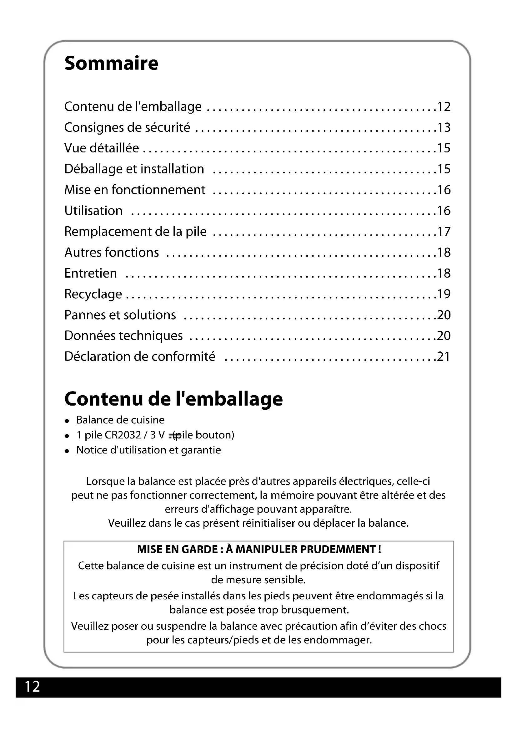 - Déclaration de conformité Contenu de l'emballage Balance de cuisine 1 pile CR2032 / 3 V (pile bouton) Notice d'utilisation et garantie Lorsque la balance est placée près d'autres appareils électriques, celle-ci peut ne pas fonctionner correctement, la mémoire pouvant être altérée et des erreurs d'affichage pouvant apparaître. Veuillez dans le cas présent réinitialiser ou déplacer la balance. MISE EN GARDE : À MANIPULER PRUDEMMENT ! Cette balance de cuisine est un instrument de précision doté d’un dispositif de mesure sensible. Les capteurs de pesée installés dans les pieds peuvent être endommagés si la balance est posée trop brusquement. Veuillez poser ou suspendre la balance avec précaution afin d’éviter des chocs pour les capteurs/pieds et de les endommager. Druckbuch Kuechenwaage BEL.book Seite 12 Dienstag, 12. Mai 2020 11:18 1113 Consignes de sécurité Lire et conserver le mode d’emploi Veuillez lire attentivement les informations suivantes et en tenir compte. Prière de conserver le mode d’emploi pour toute référence future. Si vous donnez l’article à quelqu’un d’autre, veuillez remettre également le présent mode d’emploi. Instructions importantes Cet appareil peut être utili- sé par des enfants âgés d’au moins 8 ans, ainsi que par des personnes ayant des capacités physiques, sensorielles ou mentales réduites ou n’ayant pas les expériences et / ou connaissances requises, à condition qu’ils soient sur- veillés ou aient été infor- més au sujet de la sécurité d’utilisation de l’appareil et qu’ils aient compris les risques en résultant. Surveillez les enfants afin de vous assurer qu’ils ne jouent pas avec l’appareil. Les travaux de nettoyage et d’entretien qui peuvent être effectués par l’utilisa- teur ne doivent pas être réalisés par des enfants, à moins qu’ils ne soient sur- veillés et âgés d’au moins 8ans. Les piles peuvent être dan- gereuses. Conservez, pour cette raison, les piles hors de la portée des petits en- fants. Si une pile est avalée ou si elle arrive dans le corps d’une façon ou d’une autre, demandez immédia- tement l’assistance d’un médecin. Sinon, cela peut provoquer de graves brû- lures dans les 2 heures et celles-ci peuvent provo- quer la mort. Utilisation conforme La balance de cuisine sert à peser des aliments et de petits articles dans un cadre privé domestique. La charge maximale (voir « Caractéris- tiques techniques ») ne doit pas être dépassée. Cette balance est prévue pour un usage ménager et conçue pour peser les quantités généralement requises dans ce cadre. Cette balance ne convient pas à un usage professionnel (boulangeries, restaurants, etc.). Risques pour les enfants Empêchez les enfants de jouer avec les emballages afin d’éviter tout Druckbuch Kuechenwaage BEL.book Seite 13 Dienstag, 12. Mai 2020 11:18 1114 risque d’asphyxie. Veillez à ce qu’ils ne se couvrent pas la tête avec le sachet d’emballage. Risque de blessures Attention : risque d'explosion en cas de remplacement non conforme de la pile. Remplacez la pile uniquement par une pile de type identique ou similaire. Respec- tez les indications des « Caractéris- tiques techniques ». Il n'est pas autorisé de recharger les piles ou de les réactiver d'une autre manière, de les désassembler, de les réchauffer, lancer au feu ou de les court-circuiter. Il existe le risque accru d'explosion et d'écoulement, et, de plus, les gaz pourraient s'échapper ! Éviter le contact avec la peau, les yeux et les muqueuses. En cas de contact avec l'acide contenu dans les piles, rincez immédiatement et abondamment à l'eau et consultez rapidement un médecin. Si la balance de cuisine tombe et se brise, il existe un risque de coupure dû aux éclats de verre. Consignes concernant les dommages matériels Ne plongez pas la balance dans l'eau ou d'autres liquides. Posez la balance sur une surface plane et stable. Ne surchargez pas la balance. Res- pectez les indications des «Caracté- ristiques techniques». Posez uni- quement des articles à peser sur la balance. Ne placez pas la balance à proximité d'appareils pouvant émettre des rayonnements électromagné- tiques (téléphone mobile, radio, etc.) ; ils peuvent être à l'origine de dysfonctionnements ou d'erreurs dans les indications affi- chées à l'écran. Le dessous de la balance est muni de pieds. Étant donné que la surface du mobilier ou du sol peut être revêtue de différents matériaux et traitée avec des produits d'entre- tien divers, il n'est pas totalement exclu que certains de ces matériaux contiennent des composants qui attaquent ou ramollissent les pieds de l'appareil. Dans ce cas, posez la balance sur un support antidéra- pant. Retirez la pile de l'appareil si elle est usagée ou si vous n'utilisez pas la balance pendant de longues périodes. Vous éviterez ainsi tout dommage susceptible de se pro- duire en cas de fuite. N'exposez pas les piles à des condi- tions extrêmes, par exemple en les stockant à proximité d'un corps chaud ou directement au soleil. Le risque de fuite serait encore plus élevé. Si nécessaire, nettoyez les contacts de la pile et de l'appareil avant de mettre la pile en place. N'effectuez aucune modification sur l'appareil. Faites effectuer les réparations uniquement par un spécialiste et respectez les condi- tions de garantie. N'utilisez jamais d'objets durs, ni de grattoir, ni de produits abrasifs pour nettoyer la balance. Vous risquez de rayer la surface. Druckbuch Kuechenwaage BEL.book Seite 14 Dienstag, 12. Mai 2020 11:18 1115 Vue détaillée Exemple d'image Déballage et installation p. 21
