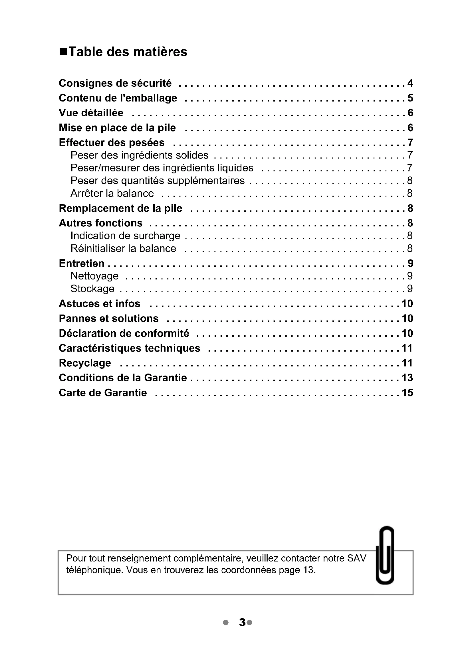 - Carte de Garantie Pour tout renseignement complémentaire, veuillez contacter notre SAV téléphonique. Vous en trouverez les coordonnées page 13. Digitale Kuechenwaage Eckig France E43350.book Seite 3 Montag, 20. Dezember 2010 10:29 10 4 Consignes de sécurité Lisez attentivement les informations suivantes et conservez cette notice d'utilisation afin de pouvoir vous y référer ultérieurement. Si vous cédez la balance à une autre personne, n'oubliez pas de lui donner également cette notice. Usage prévu La balance de cuisine sert à peser des aliments et de petits articles dans un cadre privé domestique. La charge maximale (voir «Caractéristiques tech- niques») ne doit pas être dépassée. Cette balance est prévue pour un usage ménager et conçue pour peser les quantités généralement requises dans ce cadre. Cette balance ne convient pas à un usage professionnel (boulangeries, restau- rants, etc.). Risques pour les enfants Les piles peuvent être nocives en cas d’ingestion. Rangez la balance et les piles hors de portée des jeunes enfants. En cas d’ingestion d’une pile, contactez immédiatement un médecin. Empêchez les enfants de jouer avec les emballages afin d’éviter tout risque d’asphyxie. Veillez à ce qu’ils ne se couvrent pas la tête avec le sachet d’embal- lage. Risque de blessure Attention : risque d'explosion en cas de remplacement non conforme de la pile. Remplacez la pile uniquement par une pile de type identique ou similaire. Respectez les indications des «Caractéristiques techniques». Ne pas recharger les piles, les réactiver par d'autres moyens, les ouvrir, les jeter au feu ni les court-circuiter. Éviter le contact avec la peau, les yeux et les muqueuses. En cas de contact avec l'acide contenu dans les piles, rincez immédiatement et abondamment à l'eau et consultez rapidement un médecin. Attention - Dommages matériels Ne plongez pas la balance dans l'eau ou d'autres liquides. Posez la balance sur une surface plane et stable. Ne surchargez pas la balance. Respectez les indications des «Caractéristiques techniques». Posez uniquement des articles à peser sur la balance. Ne placez pas la balance à proximité d'appareils pouvant émettre des rayonne- ments électromagnétiques (téléphone mobile, radio, etc.) ; ils peuvent être à l'origine de dysfonctionnements ou d'erreurs dans les indications affichées à l'écran. Digitale Kuechenwaage Eckig France E43350.book Seite 4 Montag, 20. Dezember 2010 10:29 10 5 p. 15