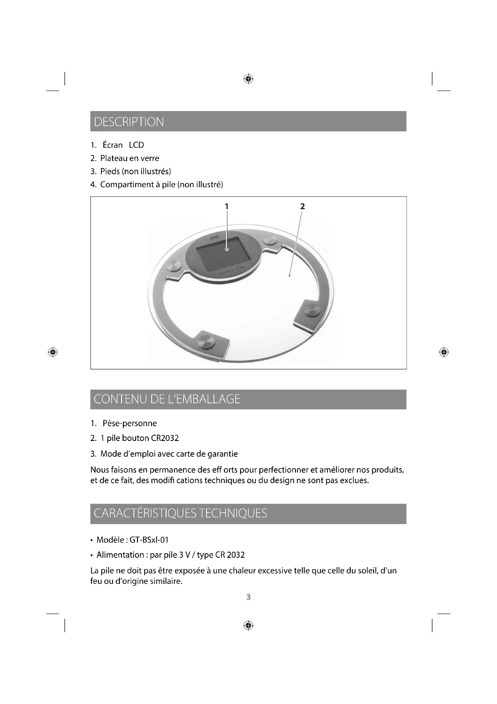 - Alimentation : par pile 3 V / type CR 2032 La pile ne doit pas être exposée à une chaleur excessive telle que celle du soleil, d’un feu ou d’origine similaire.4