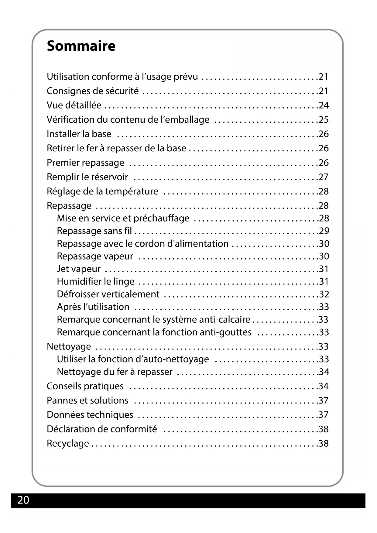 | Maintenance et réparation | Nettoyer régulièrement la semelle avec un chiffon doux, détartrer le réservoir d'eau tous les 3 mois pour maintenir la performance. |