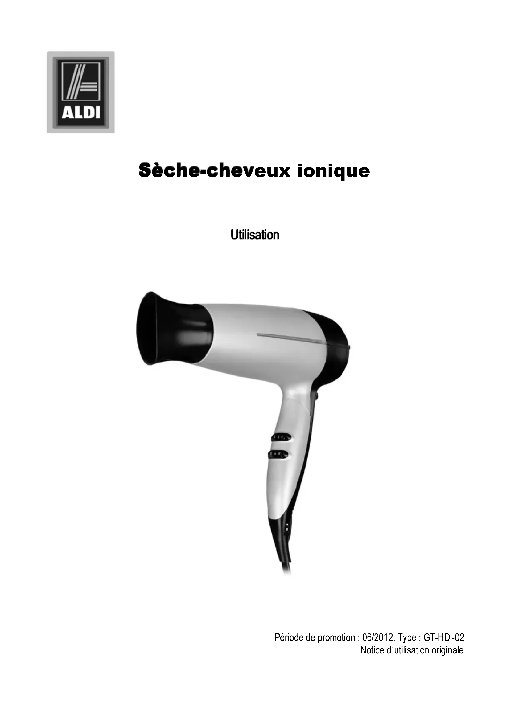 gesamtbuch_Schweiz.book Seite 14 Montag, 30. Januar 2012 11:03 11avec fonction ionique Utilisation Sèche-cheveux ionique Période de promotion : 06/2012, Type : GT-HDi-02 Notice d´utilisation originale gesamtbuch_Schweiz.book Seite 15 Montag, 30. Januar 2012 11:03 11Commercialisé par : Globaltronics GmbH & Co. KG D-20095 Hamburg Domstr. 19 06/2012 Chère cliente, cher client, Nous vous remercions d’avoir acheté ce produit. Nous espérons qu’il vous fera plaisir à l‘utiliser. Dans cette notice d’utilisation, vous trouverez des instructions précises à propos de l’emploi optimal et en toute sécurité de cet article. En vous souhaitant d‘utiliser ce produit à satisfaction ! Déclaration de conformité Ce produit est certifié conforme aux normes prévues par la loi. Vous trou- verez la déclaration de conformité intégrale sur Internet à l’adresse www.gt-support.de. Le sigle GS (sécurité éprouvée) certifie que le produit est conforme aux exigences de la loi allemande sur la sécurité des appareils et produits (GPSG) entspricht. Le sigle GS indique que la santé et la sécurité de l’utilisa- teur ne seront pas mises en danger lors d’une utilisation conforme et lors d’une utilisation erronée prévisible du produit . Il s’agit d’un sigle non obligatoire. Intertek est un laboratoire d’essais accrédité et reconnu à l’échelle internationale, représenté dans plus de 100 pays. Par la certification CE, le fabricant confirme que le produit est conforme aux directives européennes spécifiques en vigueur pour ce produit gesamtbuch_Schweiz.book Seite 16 Montag, 30. Januar 2012 11:03 1117 Sèche-cheveux ionique Composants fournis