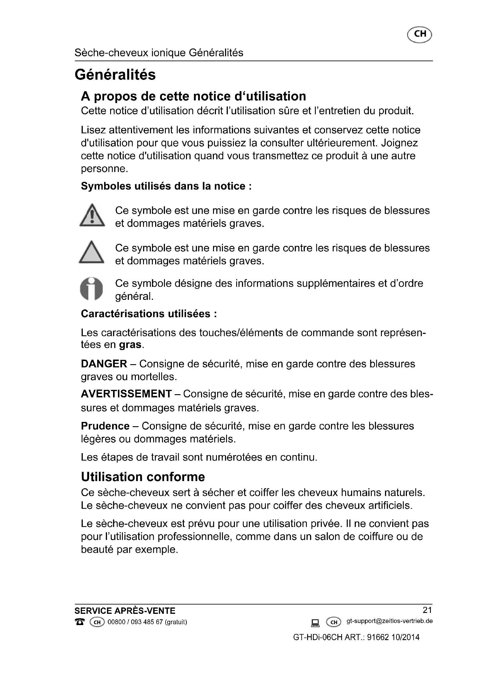 Généralités A propos de cette notice d‘utilisation Cette notice d’utilisation décrit l’utilisation sûre et l’entretien du produit. Lisez attentivement les informations suivantes et conservez cette notice d'utilisation pour que vous puissiez la consulter ultérieurement. Joignez cette notice d'utilisation quand vous transmettez ce produit à une autre personne. Symboles utilisés dans la notice : Ce symbole est une mise en garde contre les risques de blessures et dommages matériels graves. Ce symbole est une mise en garde contre les risques de blessures et dommages matériels graves. Ce symbole désigne des informations supplémentaires et d’ordre général. Caractérisations utilisées : Les caractérisations des touches/éléments de commande sont représen- tées en gras. DANGER – Consigne de sécurité, mise en garde contre des blessures graves ou mortelles. AVERTISSEMENT – Consigne de sécurité, mise en garde contre des bles- sures et dommages matériels graves. Prudence – Consigne de sécurité, mise en garde contre les blessures légères ou dommages matériels. Les étapes de travail sont numérotées en continu. Utilisation conforme Ce sèche-cheveux sert à sécher et coiffer les cheveux humains naturels. Le sèche-cheveux ne convient pas pour coiffer des cheveux artificiels. Le sèche-cheveux est prévu pour une utilisation privée. Il ne convient pas pour l’utilisation professionnelle, comme dans un salon de coiffure ou de beauté par exemple. Druckbuch Ionenhaartrockner.book Seite 21 Donnerstag, 22. Mai 2014 3:18 15SécuritéSèche-cheveux ionique CH CH