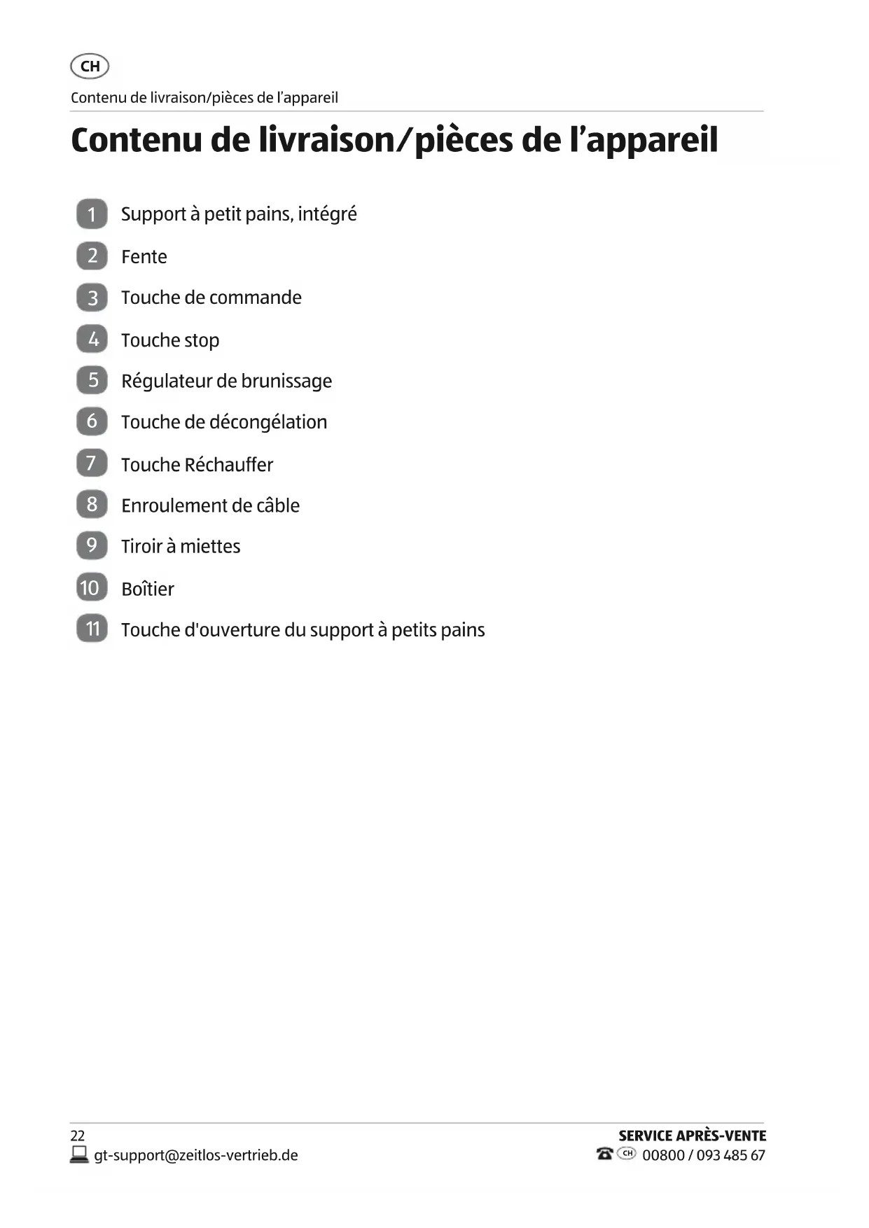 1 Support à petit pains, intégré 2 Fente 3 Touche de commande 4 Touche stop 5 Régulateur de brunissage 6 Touche de décongélation 7 Touche Réchauffer 8 Enroulement de câble 9 Tiroir à miettes 10 Boîtier 11 Touche d'ouverture du support à petits pains