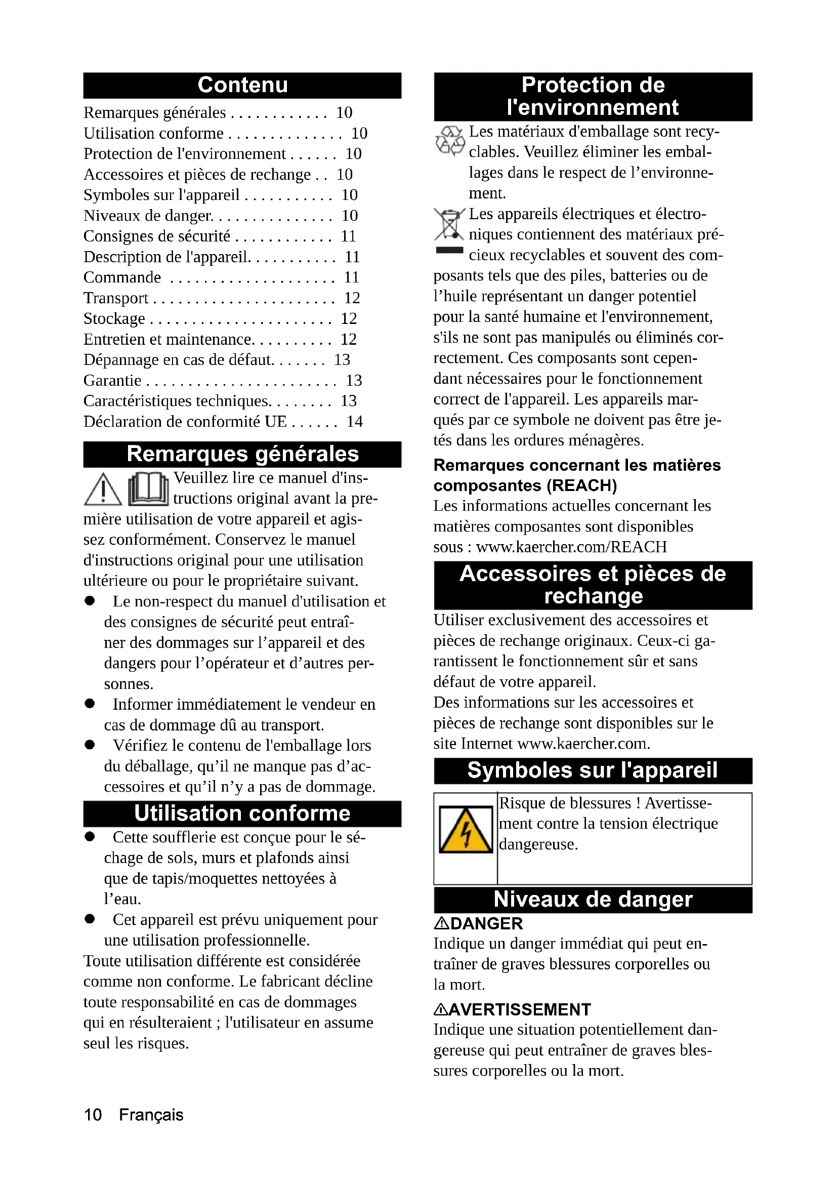 - Cable length (EU) m 7,5 Chairman of the Board of Management Director Regulatory Affairs & Certification10 Français Contenu Remarques générales Veuillez lire ce manuel d'ins- tructions original avant la pre- mière utilisation de votre appareil et agis- sez conformément. Conservez le manuel d'instructions original pour une utilisation ultérieure ou pour le propriétaire suivant. Le non-respect du manuel d'utilisation et des consignes de sécurité peut entraî- ner des dommages sur l’appareil et des dangers pour l’opérateur et d’autres per- sonnes. Informer immédiatement le vendeur en cas de dommage dû au transport. Vérifiez le contenu de l'emballage lors du déballage, qu’il ne manque pas d’ac- cessoires et qu’il n’y a pas de dommage. Utilisation conforme Cette soufflerie est conçue pour le sé- chage de sols, murs et plafonds ainsi que de tapis/moquettes nettoyées à l’eau. Cet appareil est prévu uniquement pour une utilisation professionnelle. Toute utilisation différente est considérée comme non conforme. Le fabricant décline toute responsabilité en cas de dommages qui en résulteraient ; l'utilisateur en assume seul les risques. Protection de l'environnement Les matériaux d'emballage sont recy- clables. Veuillez éliminer les embal- lages dans le respect de l’environne- ment. Les appareils électriques et électro- niques contiennent des matériaux pré- cieux recyclables et souvent des com- posants tels que des piles, batteries ou de l’huile représentant un danger potentiel pour la santé humaine et l'environnement, s'ils ne sont pas manipulés ou éliminés cor- rectement. Ces composants sont cepen- dant nécessaires pour le fonctionnement correct de l'appareil. Les appareils mar- qués par ce symbole ne doivent pas être je- tés dans les ordures ménagères. Remarques concernant les matières composantes (REACH) Les informations actuelles concernant les matières composantes sont disponibles sous : www.kaercher.com/REACH Accessoires et pièces de rechange Utiliser exclusivement des accessoires et pièces de rechange originaux. Ceux-ci ga- rantissent le fonctionnement sûr et sans défaut de votre appareil. Des informations sur les accessoires et pièces de rechange sont disponibles sur le site Internet www.kaercher.com. Symboles sur l'appareil Niveaux de danger DANGER Indique un danger immédiat qui peut en- traîner de graves blessures corporelles ou la mort. 몇 AVERTISSEMENT Indique une situation potentiellement dan- gereuse qui peut entraîner de graves bles- sures corporelles ou la mort. Remarques générales p. 10