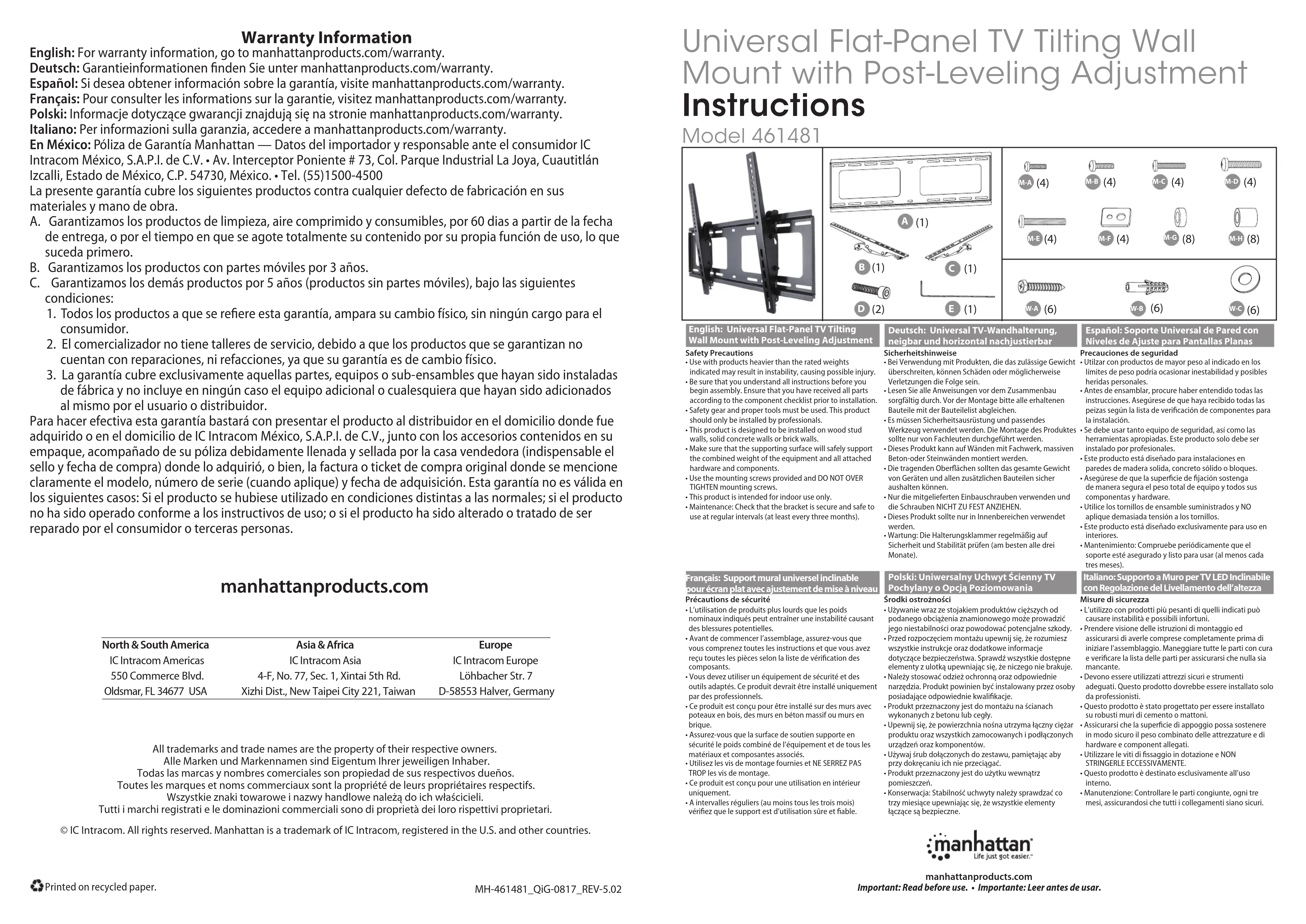 Téléchargez la notice de votre Support mural au format PDF gratuitement ! Retrouvez votre notice 461481 - MANHATTAN et reprennez votre appareil électronique en main. Sur cette page sont publiés tous les documents nécessaires à l'utilisation de votre appareil 461481 de la marque MANHATTAN.