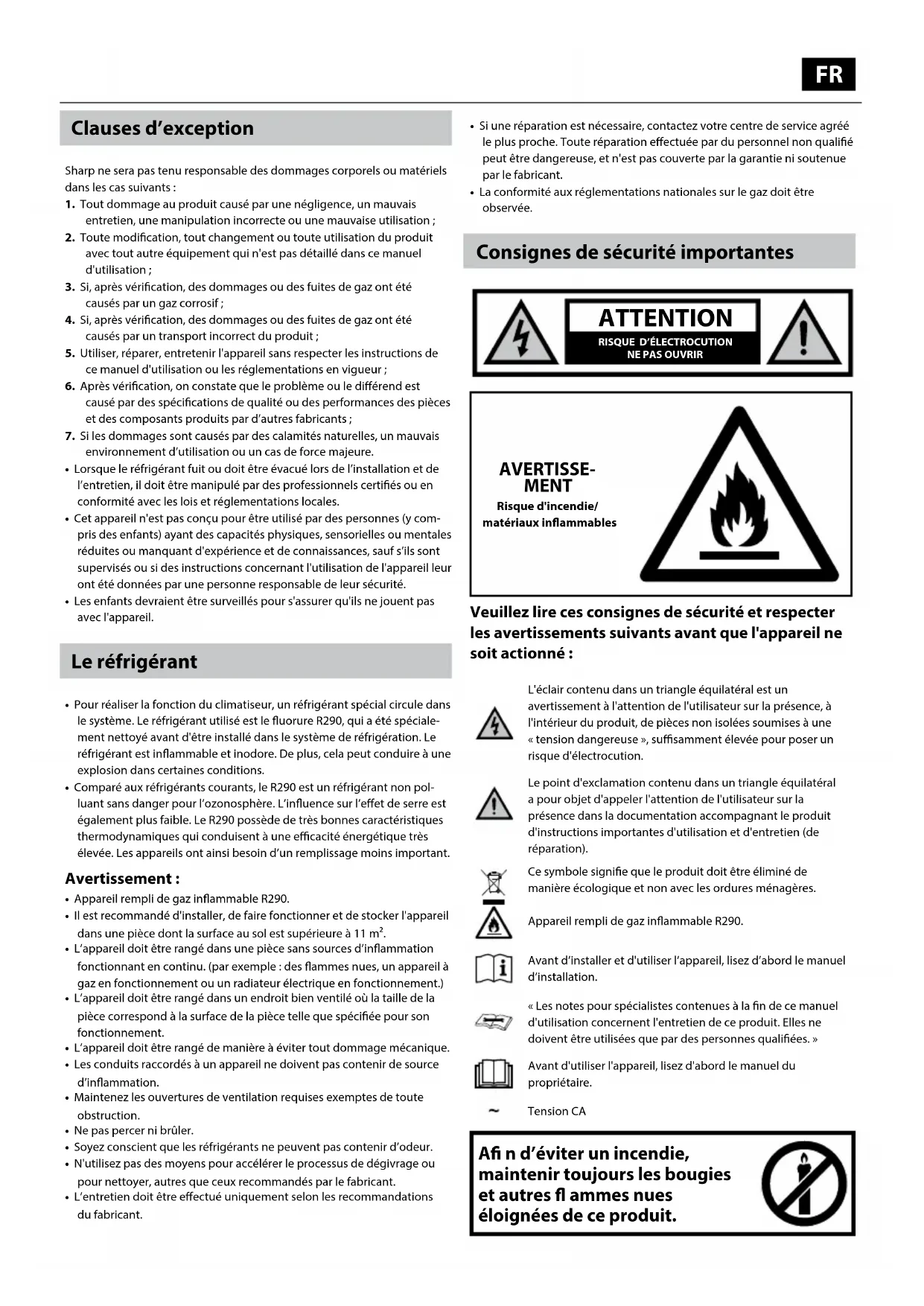 AVERTISSE- MENT Risque d'incendie/matériaux inammables Veuillez lire ces consignes de sécurité et respecter les avertissements suivants avant que l'appareil ne soit actionné : L'éclair contenu dans un triangle équilatéral est un avertissement à l'attention de l'utilisateur sur la présence, à l'intérieur du produit, de pièces non isolées soumises à une «tension dangereuse», susamment élevée pour poser un risque d'électrocution.Le point d'exclamation contenu dans un triangle équilatéral a pour objet d'appeler l'attention de l'utilisateur sur la présence dans la documentation accompagnant le produit d'instructions importantes d'utilisation et d'entretien (de réparation).Ce symbole signie que le produit doit être éliminé de manière écologique et non avec les ordures ménagères.Appareil rempli de gaz inammable R290.Avant d’installer et d'utiliser l’appareil, lisez d’abord le manuel d’installation.«Les notes pour spécialistes contenues à la n de ce manuel d'utilisation concernent l'entretien de ce produit. Elles ne doivent être utilisées que par des personnes qualiées.»Avant d'utiliser l'appareil, lisez d'abord le manuel du propriétaire.Tension CA A n d’éviter un incendie, maintenir toujours les bougies et autres ammes nues éloignées de ce produit.
