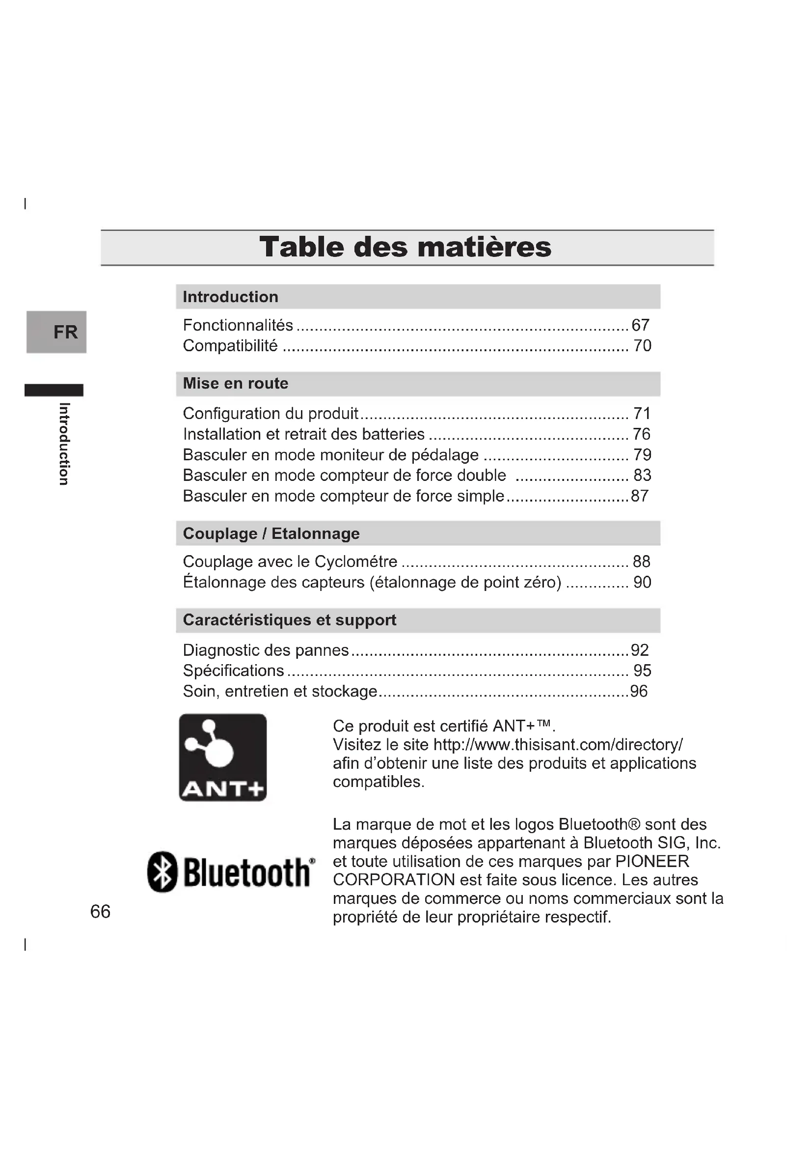 - Soin, entretien et stockage Introduction SGY-PM910ZW_ZLW_ZRW_Body.indb 66 2017/8/10 9:57:05 Ce produit est certifié ANT+™. Visitez le site http://www.thisisant.com/directory/ afin d’obtenir une liste des produits et applications compatibles. La marque de mot et les logos Bluetooth® sont des marques déposées appartenant à Bluetooth SIG, Inc. et toute utilisation de ces marques par PIONEER CORPORATION est faite sous licence. Les autres marques de commerce ou noms commerciaux sont la propriété de leur propriétaire respectif.67 p. 96