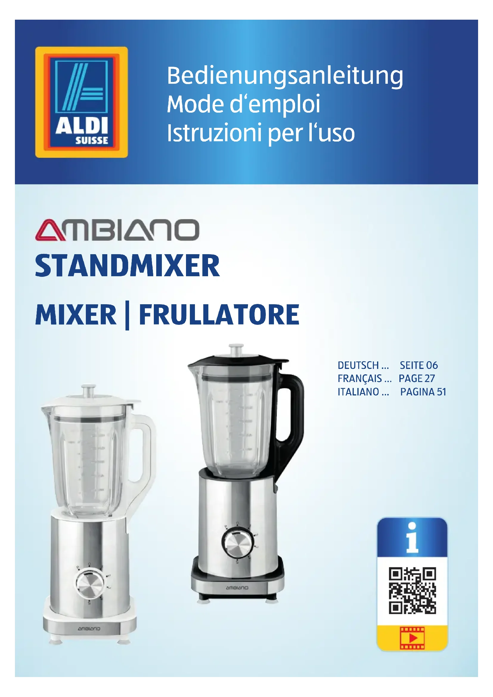 Aller rapidement et facilement au but avec les codes QR Si vous avez besoin d’informations sur les produits, de pièces de rechange ou d’accessoires, de données sur les garanties fabricant ou sur les unités de service ou si vous souhaitez regarder confortablement des instructions en vidéo – avec nos codes QR, vous parvenez au but en toute facilité. Les codes QR, qu’est-ce? Les codes QR (QR = Quick Response) sont des codes graphiques qui peuvent être lus à l’aide d’un appareil photo du smartphone et qui contiennent par exemple un lien vers un site Internet ou des données de contact. Votre avantage: plus de frappe contraignante d’adresses Internet ou de données de contact! Comment faire? Pour scanner les codes QR, vous avez simplement besoin d’un smartphone, d’un lec- teur de codes QR installé ainsi que d’une connexion Internet. Vous trouverez géné- ralement un lecteur de codes QR gratuitement dans l’App Store de votre smartphone. Testez dès maintenant Scannez simplement le code QR suivant avec votre smartphone pour en savoir plus sur votre nouveau produit ALDI. Votre portail de services ALDI Toutes les informations mentionnées plus haut sont également disponibles sur Internet via le portail de services ALDI sous www.aldi-service.ch. Standmixer CH FR INNEN.indd 29 13.01.2017 14:42:47Généralités