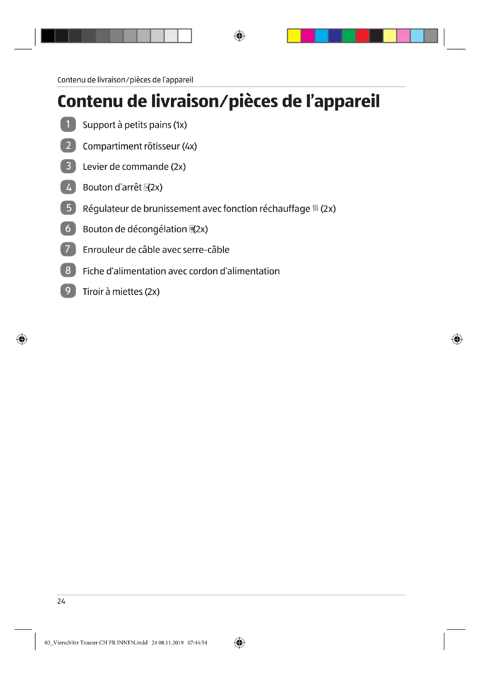 - Lors de l’utilisation du lecteur de codes QR, selon votre tarif, il peut y avoir des frais de connexion internet. 03_Vierschlitz Toaster CH FR INNEN.indd 25 08.11.2019 07:44:55Généralités