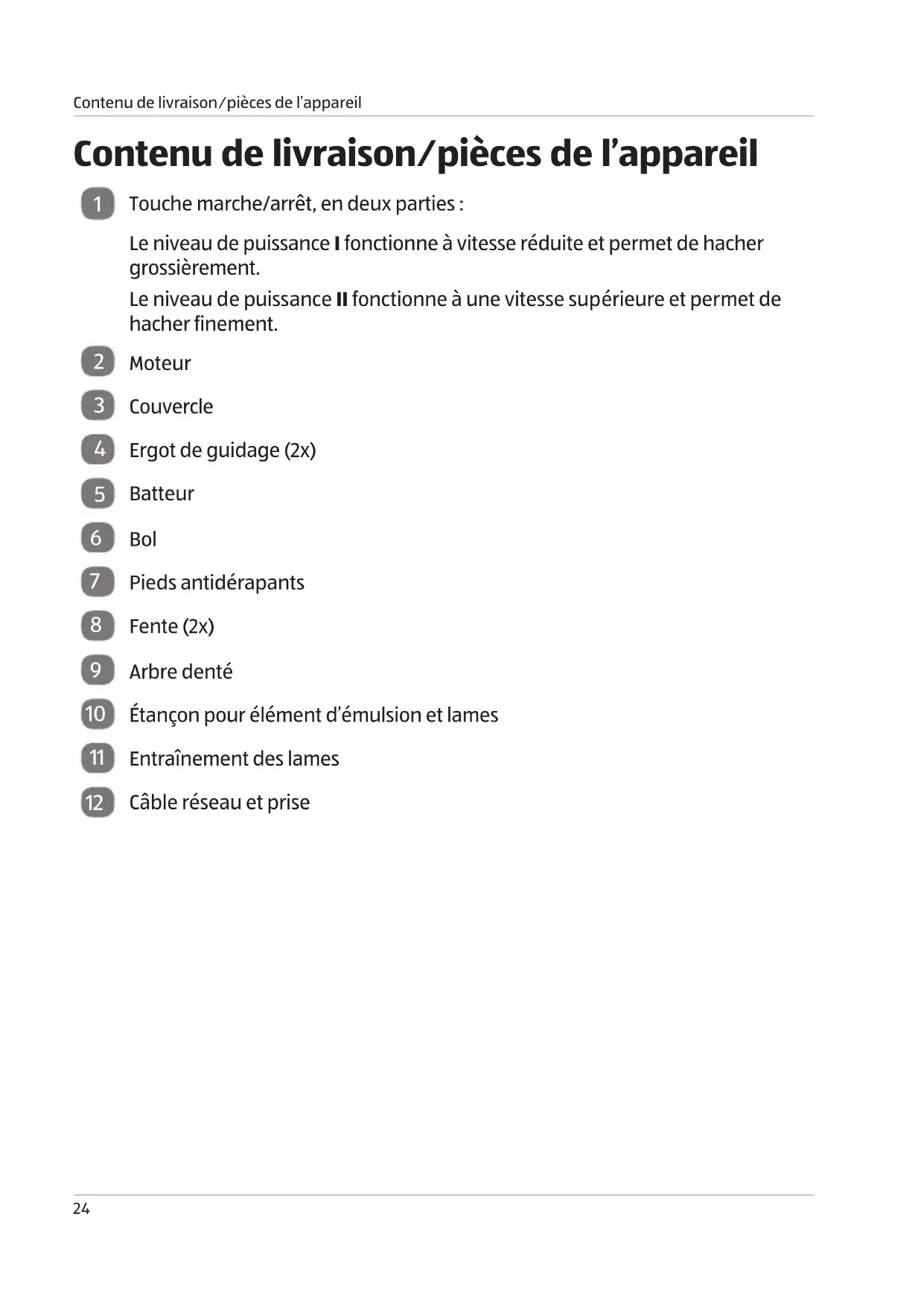 Touche marche/arrêt, en deux parties : Le niveau de puissance I fonctionne à vitesse réduite et permet de hacher grossièrement. Le niveau de puissance II fonctionne à une vitesse supérieure et permet de hacher finement.