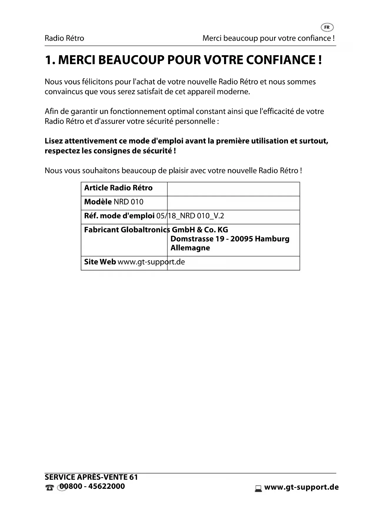 Nous vous félicitons pour l'achat de votre nouvelle Radio Rétro et nous sommes convaincus que vous serez satisfait de cet appareil moderne. Afin de garantir un fonctionnement optimal constant ainsi que l'efficacité de votre Radio Rétro et d'assurer votre sécurité personnelle : Lisez attentivement ce mode d'emploi avant la première utilisation et surtout, respectez les consignes de sécurité ! Nous vous souhaitons beaucoup de plaisir avec votre nouvelle Radio Rétro ! Article Radio Rétro Modèle NRD 010 Réf. mode d'emploi 05/18_NRD 010_V.2 Fabricant Globaltronics GmbH & Co. KG Domstrasse 19 - 20095 Hamburg Allemagne Site Web www.gt-support.de NRD010_2018.book Seite 61 Mittwoch, 29. August 2018 1:52 13Généralités Radio Rétro