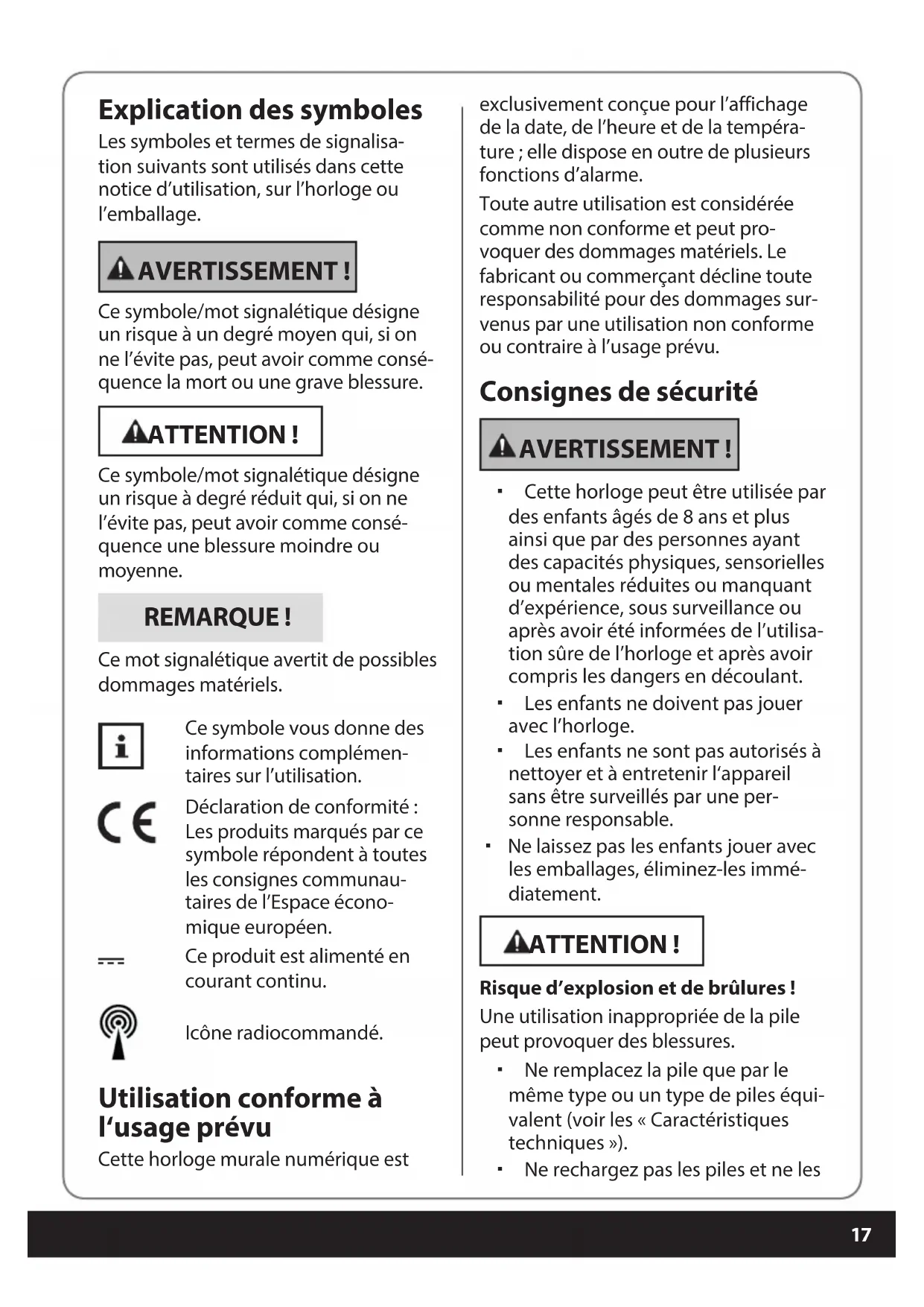 Explication des symboles Les symboles et termes de signalisa- tion suivants sont utilisés dans cette notice d’utilisation, sur l’horloge ou l’emballage. AVERTISSEMENT ! Ce symbole/mot signalétique désigne un risque à un degré moyen qui, si on ne l’évite pas, peut avoir comme consé- quence la mort ou une grave blessure. ATTENTION ! Ce symbole/mot signalétique désigne un risque à degré réduit qui, si on ne l’évite pas, peut avoir comme consé- quence une blessure moindre ou moyenne. REMARQUE ! Ce mot signalétique avertit de possibles dommages matériels. Ce symbole vous donne des informations complémen- taires sur l’utilisation. Déclaration de conformité : Les produits marqués par ce symbole répondent à toutes les consignes communau- taires de l’Espace écono- mique européen. Ce produit est alimenté en courant continu. Icône radiocommandé. Utilisation conforme à l‘usage prévu Cette horloge murale numérique est exclusivement conçue pour l’affichage de la date, de l’heure et de la tempéra- ture ; elle dispose en outre de plusieurs fonctions d’alarme. Toute autre utilisation est considérée comme non conforme et peut pro- voquer des dommages matériels. Le fabricant ou commerçant décline toute responsabilité pour des dommages sur- venus par une utilisation non conforme ou contraire à l’usage prévu. Consignes de sécurité AVERTISSEMENT ! Cette horloge peut être utilisée par des enfants âgés de 8 ans et plus ainsi que par des personnes ayant des capacités physiques, sensorielles ou mentales réduites ou manquant d’expérience, sous surveillance ou après avoir été informées de l’utilisa- tion sûre de l’horloge et après avoir compris les dangers en découlant. Les enfants ne doivent pas jouer avec l’horloge. Les enfants ne sont pas autorisés à nettoyer et à entretenir l‘appareil sans être surveillés par une per- sonne responsable. Ne laissez pas les enfants jouer avec les emballages, éliminez-les immé- diatement. ATTENTION ! Risque d’explosion et de brûlures ! Une utilisation inappropriée de la pile peut provoquer des blessures. Ne remplacez la pile que par le même type ou un type de piles équi- valent (voir les « Caractéristiques techniques »). Ne rechargez pas les piles et ne les Druckbuch BEL.indb 17Druckbuch BEL.indb 17 21.04.2020 11:28:5821.04.2020 11:28:5818 réactivez pas par d’autres moyens. Lorsque vous insérez les piles, veillez à respecter la polarité (+/-). Nettoyez, si nécessaire, les contacts des piles et de l‘appareil avant d‘in- sérer les piles. Ne démontez pas les piles et conser- vez-les dans un endroit frais et sec. Ne court-circuitez pas les piles. N’exposez pas les piles à une chaleur excessive (par ex. à la lumière directe du soleil) et ne les jetez pas dans le feu. Ne conservez pas les piles dans un environnement à très faible pres- sion atmosphérique. Si le compartiment à piles ne se ferme plus correctement, n’utilisez plus l’horloge. Évitez de mettre le liquide des piles en contact avec la peau, les yeux et les muqueuses. En cas de contact, rincez les endroits concernés immé- diatement à l’eau claire et consultez un médecin. Les piles peuvent être dangereuses. C’est pourquoi les piles doivent être conservées hors de la vue et de la portée des enfants en bas âge. Si une pile est avalée ou si elle arrive dans le corps d’une façon ou d’une autre, demandez immédiatement l’assistance d’un médecin. La pile peut être soumise à des températures extrêmement faibles ou élevées pendant l’utilisation, le stockage, le transport et une faible pression de l’air à haute altitude. Remplacement d’une batterie par un type incorrect pouvant supprimer une protection (par exemple, dans le cas de certains types de batteries au lithium). Mise au rebut d’une batterie dans un feu ou dans un four chaud, ou écrasement mécanique ou coupure d’une batterie ou exposition à une chaleur excessive telle que celle du soleil, d’un feu ou d’origine simi- laire, susceptible de provoquer une explosion. Maintien d’une batterie dans un environnement à très haute tem- pérature pouvant provoquer une explosion ou la fuite de liquide ou de gaz inammables. Exposition de la batterie à une pression de l’air extrêmement faible pouvant provoquer une explosion ou la fuite de liquide ou de gaz inammables. Retirez les piles vides de leur com- partiment. Le liquide contenu dans les piles risque de s’écouler. Il est également recommandé de retirer les piles dans les cas suivants : - Si vous n’utilisez pas le produit pendant un certain temps, - avant d’éliminer le produit. REMARQUE ! Risque d‘endommagement ! Une utilisation incorrecte de l’horloge peut entraîner des dommages. Protégez l’horloge de la chaleur extrême, des rayons du soleil, de la poussière ainsi que des champs magnétiques, des produits chimiques et de l’abrasion méca- nique. N’approchez pas l’horloge d’une amme, notamment de bougies. Ne faites pas tomber l’horloge et ne la soumettez à aucun impact important. Ne plongez pas l’horloge dans l’eau ni dans aucun autre liquide et proté- gez-la de l’humidité. Druckbuch BEL.indb 18Druckbuch BEL.indb 18 21.04.2020 11:28:5821.04.2020 11:28:58Vue détaillée L’écran 1 Secondes 2 Affichage Heure d’été (DST) 3 Affichage Radio 4 Affichage AM/PM 5 Heures 6 Minutes 7 Affichage Répétition* 8 Phase de la lune Fuseau horaire 9 Fuseau horaire 10 Symbole de l’alarme 11 Affichage du niveau de charge des piles 12 Jour/Mois ** 13 Mois/Jour **