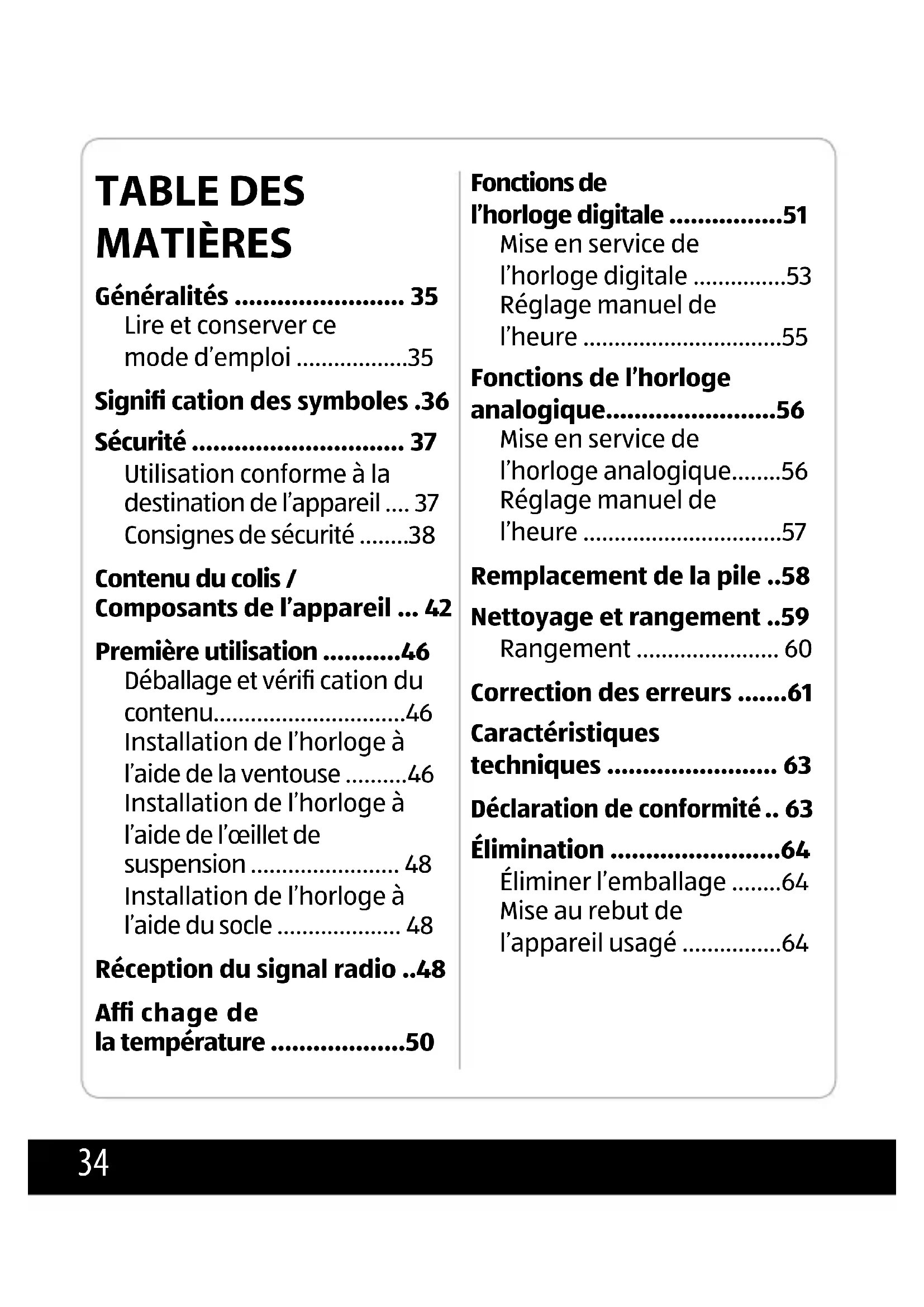 particulier le verre de l’hor- loge. Rangement - Retirez la pile avant de ranger l’horloge. - Rangez l’horloge dans un endroit sec et à l’abri, entre 0 °C et 40 °C. - Rangez l’horloge hors de la vue et de la portée des enfants. - Pour le rangement, res- pectez les instructions du chapitre « Consignes de sécurité ».61 Correction des erreurs Avant de nous signaler un problème, vérifi ez la pile et rem- placez-la par une pile neuve le cas échéant. Erreur et cause possible Dépannage L’horloge ne reçoit aucun signal radio. La réception du signal radio peut être perturbée ou impossible en raison de constructions ou d’obstacles naturels (par ex. des montagnes). Des interférences électro- magnétiques ou atmos- phériques peuvent égale- ment gêner le signal radio. Si l’horloge ne reçoit aucun signal, réessayez à un autre endroit avec une meilleure ré- ception. Cette erreur peut être résolue en installant l’horloge à un autre endroit. Respectez les instructions du chapitre « Réception d’un signal radio ». La température affi chée est erronée. L’affi chage de la température peut être infl uencé par le rayonne- ment direct du soleil. N’exposez pas l’horloge aux rayons directs du soleil. La fraîcheur ou la chaleur émis par le mur, peuvent modifi er l’affi chage de la température.62 Les aiguilles de l’horloge ne bougent plus (horloge analogique) ou l’affi chage sur l’écran s’estompe ou disparaît totalement (hor- loge digitale). C’est un signe d’une fai- blesse de la pile. Remplacez la pile. Lorsque vous insérez les piles, veillez à respecter la polarité. Voir chapitre « Remplacement de la pile ». La ventouse n’adhère pas. Le support sur lequel vous ventousez l’horloge doit être lisse et propre. Il est recommandé de net- toyer le support avec un détergent. Respectez les ins- tructions du chapitre « Instal- lation de l’horloge à l’aide de la ventouse ». L’heure ne s’affi che pas correctement.