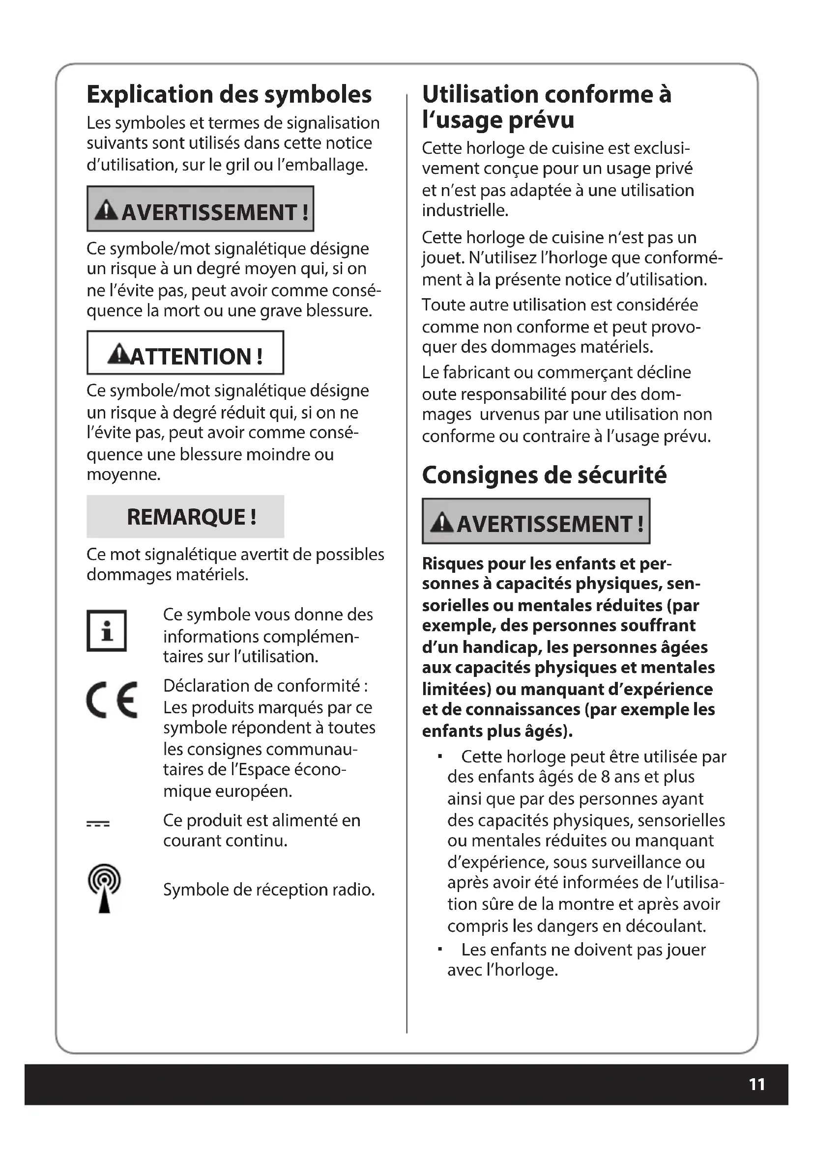 Explication des symboles Les symboles et termes de signalisation suivants sont utilisés dans cette notice d’utilisation, sur le gril ou l’emballage. AVERTISSEMENT ! Ce symbole/mot signalétique désigne un risque à un degré moyen qui, si on ne l’évite pas, peut avoir comme consé- quence la mort ou une grave blessure. ATTENTION ! Ce symbole/mot signalétique désigne un risque à degré réduit qui, si on ne l’évite pas, peut avoir comme consé- quence une blessure moindre ou moyenne. REMARQUE ! Ce mot signalétique avertit de possibles dommages matériels. Ce symbole vous donne des informations complémen- taires sur l’utilisation. Déclaration de conformité : Les produits marqués par ce symbole répondent à toutes les consignes communau- taires de l’Espace écono- mique européen. Ce produit est alimenté en courant continu. Symbole de réception radio. Utilisation conforme à l‘usage prévu Cette horloge de cuisine est exclusi- vement conçue pour un usage privé et n’est pas adaptée à une utilisation industrielle. Cette horloge de cuisine n‘est pas un jouet. N’utilisez l’horloge que conformé- ment à la présente notice d’utilisation. Toute autre utilisation est considérée comme non conforme et peut provo- quer des dommages matériels. Le fabricant ou commerçant décline oute responsabilité pour des dom- mages urvenus par une utilisation non conforme ou contraire à l’usage prévu. Consignes de sécurité AVERTISSEMENT ! Risques pour les enfants et per- sonnes à capacités physiques, sen- sorielles ou mentales réduites (par exemple, des personnes souffrant d’un handicap, les personnes âgées aux capacités physiques et mentales limitées) ou manquant d’expérience et de connaissances (par exemple les enfants plus âgés). Cette horloge peut être utilisée par des enfants âgés de 8 ans et plus ainsi que par des personnes ayant des capacités physiques, sensorielles ou mentales réduites ou manquant d’expérience, sous surveillance ou après avoir été informées de l’utilisa- tion sûre de la montre et après avoir compris les dangers en découlant. Les enfants ne doivent pas jouer avec l’horloge. Druckbuch BEL.indb 11Druckbuch BEL.indb 11 21.10.2021 07:39:3321.10.2021 07:39:3312 Les enfants ne sont pas autorisés à nettoyer et à entretenir l‘appareil sans être surveillés par une per- sonne responsable. Ne laissez pas les enfants jouer avec les emballages, éliminez-les immé- diatement. ATTENTION ! Risque d’explosion et de brûlures ! Une utilisation inappropriée de la pile peut provoquer des blessures. Ne remplacez la pile que par le même type ou un type de piles équi- valent (voir les « Caractéristiques techniques »). Ne rechargez pas les piles et ne les réactivez pas par d’autres moyens. Lorsque vous insérez les piles, veillez à respecter la polarité (+/-). Nettoyez, si nécessaire, les contacts des piles et de l‘appareil avant d‘in- sérer les piles. Ne démontez pas les piles et conser- vez-les dans un endroit frais et sec. Ne court-circuitez pas les piles. N’exposez pas les piles à une chaleur excessive (par ex. à la lumière directe du soleil) et ne les jetez pas dans le feu. Ne conservez pas les piles dans un environnement à très faible pres- sion atmosphérique. Si le compartiment à piles ne se ferme plus correctement, n’utilisez plus l’horloge. Évitez de mettre le liquide des piles en contact avec la peau, les yeux et les muqueuses. En cas de contact, rincez les endroits concernés immé- diatement à l’eau claire et consultez un médecin. Les piles peuvent être dangereuses. C’est pourquoi les piles doivent être conservées hors de la vue et de la portée des enfants en bas âge. Si une pile est avalée ou si elle arrive dans le corps d’une façon ou d’une autre, demandez immédiatement l’assistance d’un médecin. Retirez les piles de leur compar- timent lorsqu’elles sont vides. Le liquide contenu dans les piles risque de s’écouler. Il est également recom- mandé de retirer les piles dans les cas suivants : - si le produit n’est pas utilisé pen- dant une période prolongée, - avant de jeter le produit. REMARQUE ! Risque d‘endommagement ! Une utilisation incorrecte de l’horloge peut entraîner des dommages. Protégez l’horloge de la chaleur extrême, des rayons du soleil, de la poussière ainsi que des champs magnétiques, des produits chimiques et de l’abrasion méca- nique. N’approchez pas l’horloge d’une amme, notamment de bougies. Ne faites pas tomber l’horloge et ne la soumettez à aucun impact important. Ne plongez pas l’horloge dans l’eau ni dans aucun autre liquide et proté- gez-la de l’humidité. Contenu de la livraison Horloge de cuisine 1 pile LR6/R6 (AA) Druckbuch BEL.indb 12Druckbuch BEL.indb 12 21.10.2021 07:39:3321.10.2021 07:39:33Vue détaillée 1 Aiguille des heures 2 Aiguille des minutes 3 Cadran 4 Aiguille des secondes (uniquement pour les modèles GT-KWC22-04BL, GT-KWC22-03CR, GT-KWC22-03CH) 5 Touche REC - Redémarrer la radiotransmission 6 Touche RESET - Réinitialiser l’horloge aux paramètres d’usine 7 Compartiment à piles pour 1 pile LR6/R6 (AA) 8 Touche SET - Réglage manuel de l’heure » Pour démarrer l’horloge, retirez la bande isolante.