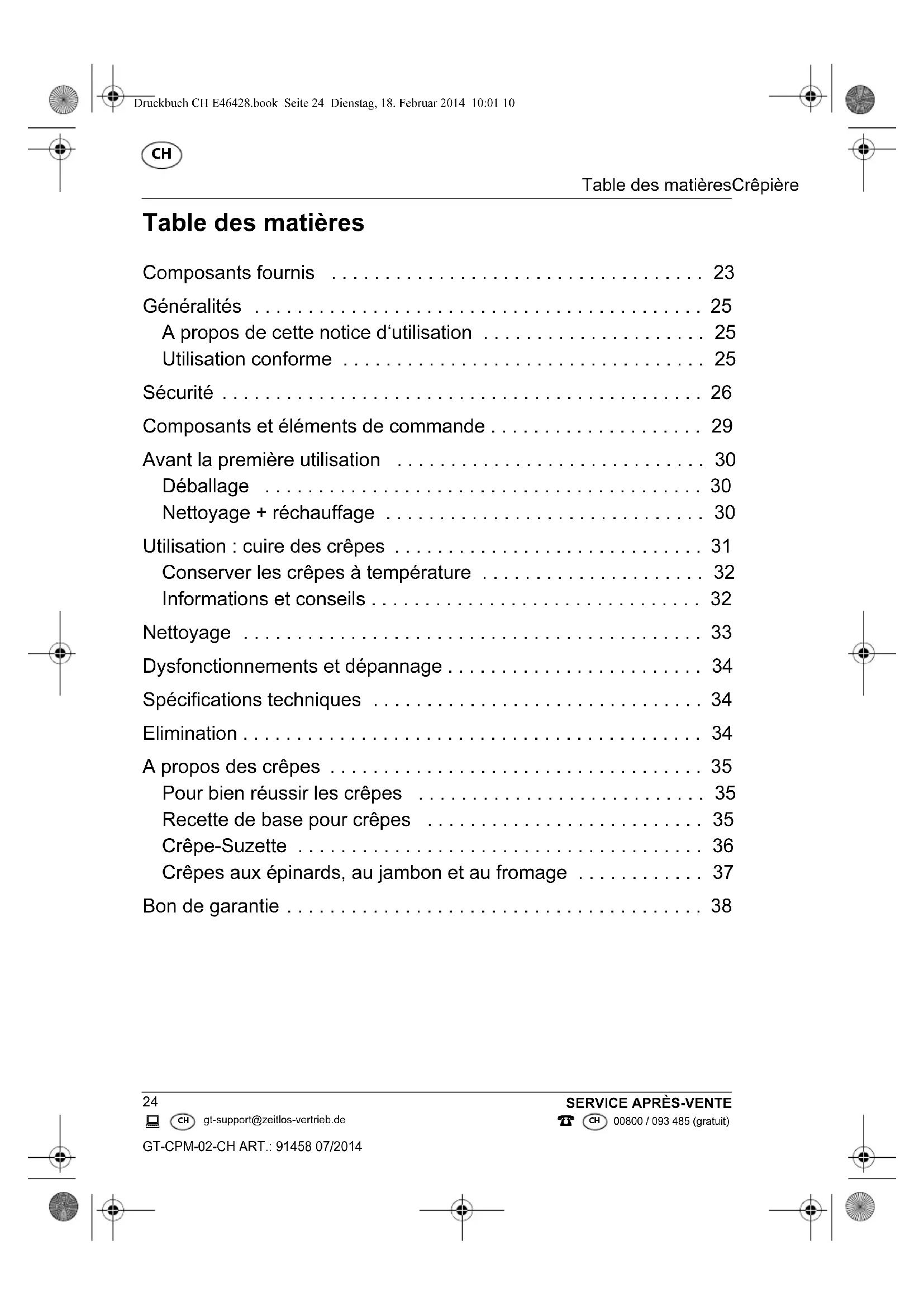 Composants fournis 1x notice d’utili- sation avec garantie 1x plaque de cuisson 1x base de la crêpière 1x retourneur 1x distributeur de pâte Druckbuch CH E46428.book Seite 23 Dienstag, 18. Februar 2014 10:01 10Table des matièresCrêpière CH CH Table des matières