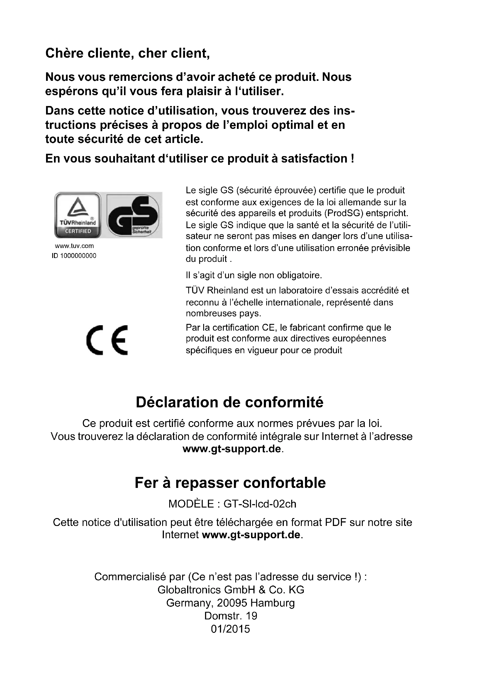GT-Sl-lcd-02ch ART.: 91764 01/2015 E47131 Druckbuch Dampfbuegeleisen CH.book Seite 27 Donnerstag, 14. August 2014 4:47 16Commercialisé par (Ce n’est pas l’adresse du service !) : Globaltronics GmbH & Co. KG Germany, 20095 Hamburg Domstr. 19 01/2015 Chère cliente, cher client, Nous vous remercions d’avoir acheté ce produit. Nous espérons qu’il vous fera plaisir à l‘utiliser. Dans cette notice d’utilisation, vous trouverez des ins- tructions précises à propos de l’emploi optimal et en toute sécurité de cet article. En vous souhaitant d‘utiliser ce produit à satisfaction ! Déclaration de conformité Ce produit est certifié conforme aux normes prévues par la loi. Vous trouverez la déclaration de conformité intégrale sur Internet à l’adresse www.gt-support.de. Fer à repasser confortable MODÈLE : GT-Sl-lcd-02ch Cette notice d'utilisation peut être téléchargée en format PDF sur notre site Internet www.gt-support.de. Le sigle GS (sécurité éprouvée) certifie que le produit est conforme aux exigences de la loi allemande sur la sécurité des appareils et produits (ProdSG) entspricht. Le sigle GS indique que la santé et la sécurité de l’utili- sateur ne seront pas mises en danger lors d’une utilisa- tion conforme et lors d’une utilisation erronée prévisible du produit . Il s’agit d’un sigle non obligatoire. TÜV Rheinland est un laboratoire d’essais accrédité et reconnu à l’échelle internationale, représenté dans nombreuses pays. Par la certification CE, le fabricant confirme que le produit est conforme aux directives européennes spécifiques en vigueur pour ce produit www.tuv.comID 1000000000 Druckbuch Dampfbuegeleisen CH.book Seite 28 Donnerstag, 14. August 2014 4:47 16Fer à repasser confortable Composants fournis CHAT