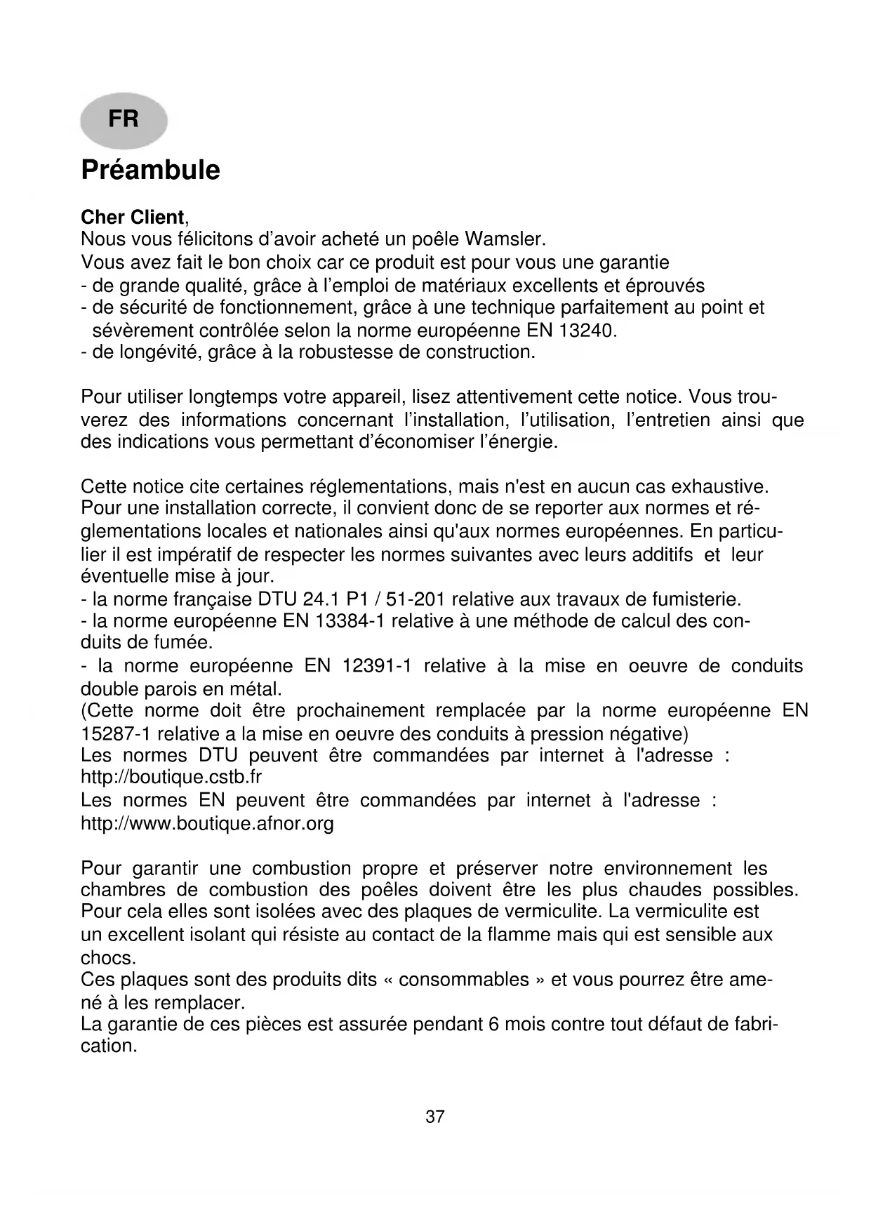 Cher Client, Nous vous félicitons d’avoir acheté un poêle Wamsler. Vous avez fait le bon choix car ce produit est pour vous une garantie - de grande qualité, grâce à l’emploi de matériaux excellents et éprouvés - de sécurité de fonctionnement, grâce à une technique parfaitement au point et sévèrement contrôlée selon la norme européenne EN 13240. - de longévité, grâce à la robustesse de construction. Pour utiliser longtemps votre appareil, lisez attentivement cette notice. Vous trou- verez des informations concernant l’installation, l’utilisation, l’entretien ainsi que des indications vous permettant d’économiser l’énergie. Cette notice cite certaines réglementations, mais n'est en aucun cas exhaustive. Pour une installation correcte, il convient donc de se reporter aux normes et ré- glementations locales et nationales ainsi qu'aux normes européennes. En particu- lier il est impératif de respecter les normes suivantes avec leurs additifs et leur éventuelle mise à jour. - la norme française DTU 24.1 P1 / 51-201 relative aux travaux de fumisterie. - la norme européenne EN 13384-1 relative à une méthode de calcul des con- duits de fumée. - la norme européenne EN 12391-1 relative à la mise en oeuvre de conduits double parois en métal. (Cette norme doit être prochainement remplacée par la norme européenne EN 15287-1 relative a la mise en oeuvre des conduits à pression négative) Les normes DTU peuvent être commandées par internet à l'adresse : http://boutique.cstb.fr Les normes EN peuvent être commandées par internet à l'adresse : http://www.boutique.afnor.org Pour garantir une combustion propre et préserver notre environnement les chambres de combustion des poêles doivent être les plus chaudes possibles. Pour cela elles sont isolées avec des plaques de vermiculite. La vermiculite est un excellent isolant qui résiste au contact de la flamme mais qui est sensible aux chocs. Ces plaques sont des produits dits « consommables » et vous pourrez être ame- né à les remplacer. La garantie de ces pièces est assurée pendant 6 mois contre tout défaut de fabri- cation. FR38 Pour les préserver il faut veiller à respecter les quantités maximum de bois (indi- quées dans cette notice) et éviter les chocs lors de l'introduction des bûches. Ainsi vous pourrez profiter de votre poêle plusieurs saisons sans les remplacer. La pierre ollaire est un produit naturel avec des nuances de couleur et des veines, en aucun cas l'aspect de la pierre est un motif de réclamation. Attention Pour toute commande de pièces de rechange indiquer le № de type, le № de référence et le № de série inscrits sur la plaque signalétique de l’appareil.