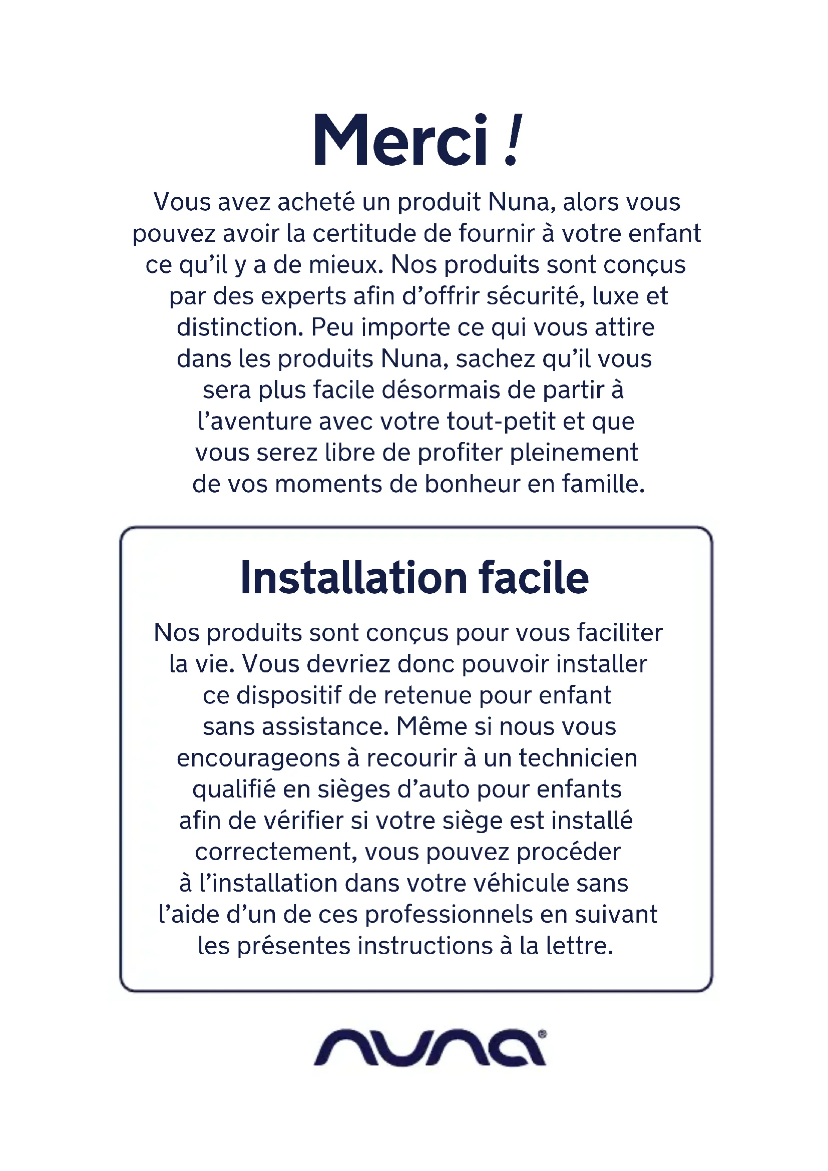 280 RAVA instructions ENInstallation facile Nos produits sont conçus pour vous faciliter la vie. Vous devriez donc pouvoir installer ce dispositif de retenue pour enfant sans assistance. Même si nous vous encourageons à recourir à un technicien qualifié en sièges d’auto pour enfants afin de vérifier si votre siège est installé correctement, vous pouvez procéder à l’installation dans votre véhicule sans l’aide d’un de ces professionnels en suivant les présentes instructions à la lettre. Merci ! Vous avez acheté un produit Nuna, alors vous pouvez avoir la certitude de fournir à votre enfant ce qu’il y a de mieux. Nos produits sont conçus par des experts afin d’offrir sécurité, luxe et distinction. Peu importe ce qui vous attire dans les produits Nuna, sachez qu’il vous sera plus facile désormais de partir à l’aventure avec votre tout-petit et que vous serez libre de profiter pleinement de vos moments de bonheur en famille.82 RAVA – Mode d’emploi