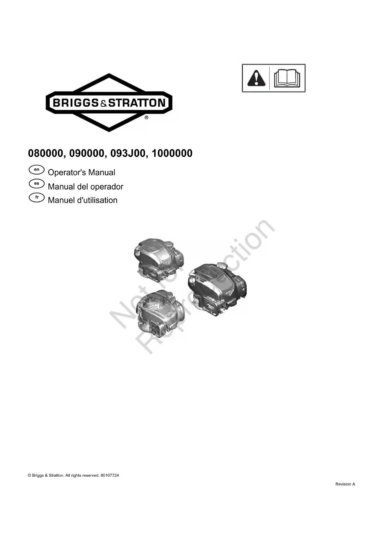 Las solicitudes de reclamación de garantía se cumplimentarán según las disposiciones de la política de garantía del motor B&S. La cobertura de garantía no se aplica a fallas de piezas de emisiones que no sean piezas originales de los equipos de B&S o a piezas que fallen debido a abuso, negligencia o mantenimiento incorrecto, según lo establecido en la política de garantía del motor de B&S. B&S no es responsable de la cobertura en garantía de fallas de piezas de emisiones causadas por el uso de piezas adicionadas o modificadas. Consulte la información relevante sobre el período de durabilidad de emisiones y el índice de aire en la etiqueta de emisiones de su pequeño motor todo terreno Los motores con certificación de cumplimiento de la normativa sobre emisiones de la Junta de Recursos del Aire de California (CARB) deben mostrar información sobre el período de durabilidad de las emisiones y el índice de calidad del aire. Briggs&Stratton ofrece esta información al consumidor en las etiquetas de emisiones. La etiqueta de emisiones del motor contiene la información de certificación. Elperíodo de durabilidad de las emisionesindica la cantidad de horas durante las cuales el motor puede funcionar cumpliendo las normas sobre emisiones, siempre que se realicen las operaciones de mantenimiento adecuadas de acuerdo con el manual del operador. Se utilizan las siguientes categorías: Moderada: Los motores con desplazamiento inferior a 80cc tienen certificación de conformidad de emisiones por 50horas del tiempo real de operación. Los motores con desplazamiento superior a 80cc tienen certificación de conformidad de emisiones por 125horas del tiempo real de operación. Intermedia: Los motores con un desplazamiento de 80cc o inferior cuentan con certificación de conformidad de emisiones para 125horas de tiempo de operación efectiva del motor. Los motores con un desplazamiento superior a 80cc cuentan con certificación de conformidad de emisiones para 250horas de tiempo de operación efectiva del motor. Extendida: Los motores con un desplazamiento de 80cc o inferior cuentan con certificación de conformidad de emisiones para 300horas de tiempo de operación efectiva del motor. Los motores con un desplazamiento superior a 80cc cuentan con certificación de conformidad de emisiones para 500horas de tiempo de operación efectiva del motor. Por ejemplo, un cortacésped de empuje típico se suele utilizar entre 20 y 25horas al año. Por lo tanto, elperíodo de durabilidad de las emisionesde un motor con clasificaciónintermediaequivaldría entre 10 y 12años. Los motores Briggs&Stratton cuentan con la certificación de cumplimiento de la fase2 o 3 de las normativas sobre emisiones de la Agencia de Protección del Medioambiente de los Estados Unidos (USEPA). El período de cumplimiento de la normativa sobre emisiones que figura en la etiqueta de cumplimiento de emisiones indica el número de horas de funcionamiento durante las cuales el motor ha demostrado cumplir los requisitos federales sobre emisiones. Para motores con desplazamiento de 80cc o menos: CategoríaC = 50horas, categoríaB = 125horas, categoríaA = 300horas Para motores con desplazamiento mayor a 80cc o menor a 225cc: CategoríaC = 125horas, categoríaB = 250horas, categoríaA = 500horas Para motores con desplazamiento de 225cc o superior: CategoríaC = 250horas, categoríaB = 500horas, categoríaA = 1000horas 80106344 (Revisión A) 24 BRIGGSandSTRATTON.COM Not for ReproductionInformations générales Ce manuel contient des renseignements sur la sécurité pour vous informer des dangers et des risques associés aux moteurs et sur la façon de les prévenir. Il comprend aussi des instructions sur l’utilisation et l’entretien approprié du moteur. Puisque Briggs & Stratton ne sait pas quel équipement alimentera ce moteur, il est important de lire et de comprendre ces instructions. Conservez ces instructions d’origine pour référence future. REMARQUE :Les figures et illustrations dans ce manuel sont fournies à titre indicatif et peuvent différer de votre modèle. Si vous avez besoin d’aide, communiquer avec un détaillant autorisé de service. Pour obtenir des pièces de remplacement ou de l’aide technique, noter la date d’achat, le modèle de moteur, le type, la garniture et le numéro de série du moteur. Ces numéros se trouvent sur votre moteur. Consulter la section Caractéristiques et commandes. Date d’achat Modèle du moteur - Type - Garniture Numéro de série du moteur Coordonnées du contact du bureau européen Pour des questions liées aux émissions européennes, communiquer avec notre bureau européen à°: Max-Born-Straße 2, 68519 Viernheim, Allemagne. Union européenne (UE) Phase V (5): Valeurs de dioxyde de carbone (CO2) Entrer CO2 dans la fenêtre de recherche sur BriggsandStratton.com pour trouver les valeurs de dioxyde de carbone des moteurs de Briggs & Stratton ayant un certificat d’approbation de la UE. Information sur le recyclage Recycler tous les emballages, les boîtes, les huiles usées et les batteries, tel que spécifié par les réglementations gouvernementales. Sécurité de l’utilisateur Symbole d’alerte de sécurité et mots-indicateurs Le symbole d’alerte de sécurité identifie l’information de sécurité relative aux dangers qui pourraient causer des blessures. Un mot de signalisation (DANGER, AVERTISSEMENT ou ATTENTION) est utilisé pour indiquer la possibilité et la gravité des blessures potentielles. En plus, un symbole de danger est utilisé pour représenter un type de danger. DANGER indique un danger qui, si non évité, provoquera la mort ou des blessures graves. AVERTISSEMENT indique un danger qui, si non évité, pourrait causer la mort ou des blessures graves. ATTENTION indique un danger qui, si non évité, pourrait causer une blessure mineure ou modérée. AVIS indique des informations considérées importantes, mais non liées aux dangers. Rense