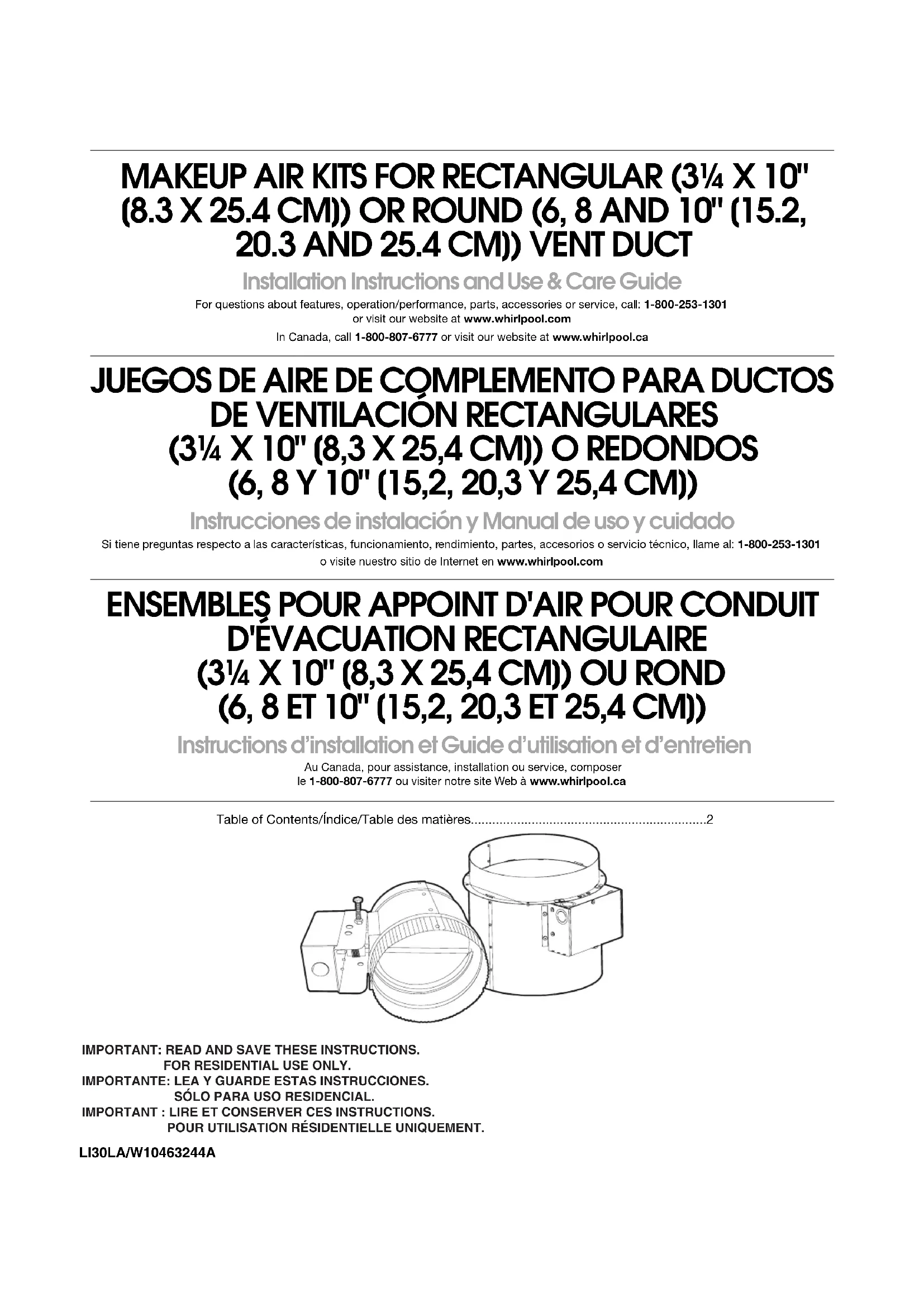 La présente garantie ne couvre pas : 1. Les interventions de dépannage à domicile, notamment les interventions visant à rectifier l’installation de l'accessoire de cuisson ou à expliquer à l’utilisateur le mode d’utilisation du produit. 2. Le remplacement du produit ou les pièces spécifiées par l’usine lorsque l'accessoire de cuisson est utilisé à des fins autres qu’un usage domestique unifamilial normal ou lorsque les instructions d’installation et/ou les instructions de l’opérateur et (ou) de l’utilisateur fournies ne sont pas respectées. 3. Les dommages imputables à : accident, modification, usage impropre ou abusif, incendie, inondation, actes de Dieu, installation fautive ou installation non conforme aux codes d’électricité ou de plomberie ou l’utilisation de pièces consomptibles ou de produits de nettoyage non approuvés par Whirlpool Corporation. 4. Les défauts d'esthétique, notamment les éraflures, traces de choc, fissures ou tout autre dommage subi par l'accessoire de cuisson, à moins que ces dommages ne résultent de vices de matériaux ou de fabrication et ne soient signalés à Whirlpool dans les 30 jours suivant la date d'achat. 5. Les pièces spécifiées par l’usine ou le remplacement du produit résultant d’une modification non autorisée apportée au produit. 6. Les frais de déplacement, de transport ou d’expédition indépendants des frais expressément stipulés dans la présente garantie limitée de l'accessoire de cuisson. 7. Le retrait ou la réinstallation de garnitures, panneaux décoratifs, meubles, panneaux de gypse ou autres dispositifs préinstallés et/ ou le remplacement du produit. Le coût d’une réparation ou d’un remplacement dans le cadre de ces circonstances exclues est à la charge du client.Si vous résidez aux États-Unis ou au Canada et que vous devez soumettre une demande de dépannage dans le cadre de la garantie : 1. Les clients résidant aux É.-U. doivent contacter notre service à la clientèle au 1-800-253-1301, de 8 h à 20 h, du lundi au vendredi, heure normale de l'Est. Les clients résidant au Canada doivent contacter notre service à la clientèle au 1-800-807-6777, de 8 h à 18 h 30, du lundi au vendredi, heure normale de l'Est. 2. Fournir au conseiller le numéro de modèle et de série du produit, ainsi qu'une adresse d'expédition (pas de boîte postale S.V.P.). 3. Le conseiller vous indiquera si l'accessoire de cuisson peut bénéficier de pièces de rechange spécifiées par l’usine ou d’un remplacement. 4. Il vous sera peut-être demandé d'envoyer le produit à un centre de réparation désigné par Whirlpool. L'assurance et le fret jusqu'au centre de réparation désigné relèvent de votre responsabilité. Veuillez indiquer vos nom et adresse sur un morceau de papier et l’accompagner d’une copie de votre preuve d'achat (reçu de caisse, bordereau d'achat, etc.). Le produit doit être correctement emballé pour éviter tout dommage pendant le transport car nous ne pourrons être tenus responsables d’un tel dommage. 5. Whirlpool retournera sans frais à votre domicile l'appareil concerné ou, à sa discrétion, un accessoire de cuisson identique ou comparable, ou encore des pièces de rechange spécifiées par l’usine. CLAUSE D'EXONÉRATION DE RESPONSABILITÉ AU TITRE DES GARANTIES IMPLICITES LES GARANTIES IMPLICITES, Y COMPRIS LES GARANTIES APPLICABLES DE QUALITÉ MARCHANDE OU D'APTITUDE À UN USAGE PARTICULIER, SONT LIMITÉES À 1 AN OU À LA PLUS COURTE PÉRIODE AUTORISÉE PAR LA LOI. Certains États et provinces ne permettent pas de limitation sur la durée des garanties implicites de qualité marchande ou d'aptitude à un usage particulier, de sorte que la limitation ci-dessus peut ne pas être applicable dans votre cas. Cette garantie vous confère des droits juridiques spécifiques et vous pouvez également jouir d’autres droits qui peuvent varier d’une juridiction à l'autre. LIMITATION DES RECOURS; EXCLUSION DES DOMMAGES FORTUITS OU INDIRECTS LE SEUL ET EXCLUSIF RECOURS DU CLIENT DANS LE CADRE DE LA PRÉSENTE GARANTIE LIMITÉE CONSISTE EN LA RÉPARATION OU LE REMPLACEMENT DU PRODUIT TEL QUE PRÉVU PAR LA PRÉSENTE, ET CE À NOTRE DISCRÉTION. WHIRLPOOL N’ASSUME AUCUNE RESPONSABILITÉ CONCERNANT LES DOMMAGES FORTUITS OU INDIRECTS. Certains États et provinces ne permettent pas l’exclusion ou la limitation des dommages fortuits ou indirects de sorte que ces limitations peuvent ne pas être applicables dans votre cas. Cette garantie vous confère des droits juridiques spécifiques et vous pouvez également jouir d’autres droits qui peuvent varier d’une juridiction à l'autre. A l’extérieur du Canada et des 50 Etats des Etats-Unis, cette garantie ne s’applique pas. Contacter votre marchand Whirlpool autorisé pour déterminer si une autre garantie s’applique. Pour un dépannage aux États-Unis, composer le 1-800-422-1230. Au Canada, composer le 1-800-807-6777. 12/11 Conservez ensemble ce manuel et votre reçu de vente pour référence ultérieure. Pour un entretien ou une réparation sous garantie, vous devez présenter un document attestant de la date d’achat ou d’installation. Inscrivez les renseignements suivants relatifs à votre accessoire de cuisson afin de faciliter l'obtention d'un dépannage ou d'aide en cas de besoin. Vous devrez connaître le numéro de modèle au complet. Numéro de modèle______________________________________________ Numéro de série ________________________________________________ Date d’achat____________________________________________________ W10463244A © 2012. All rights reserved. Todos los derechos reservados. Tous droits réservés. 1/12 Printed in Mexico Impreso en México Imprimé au Mexique