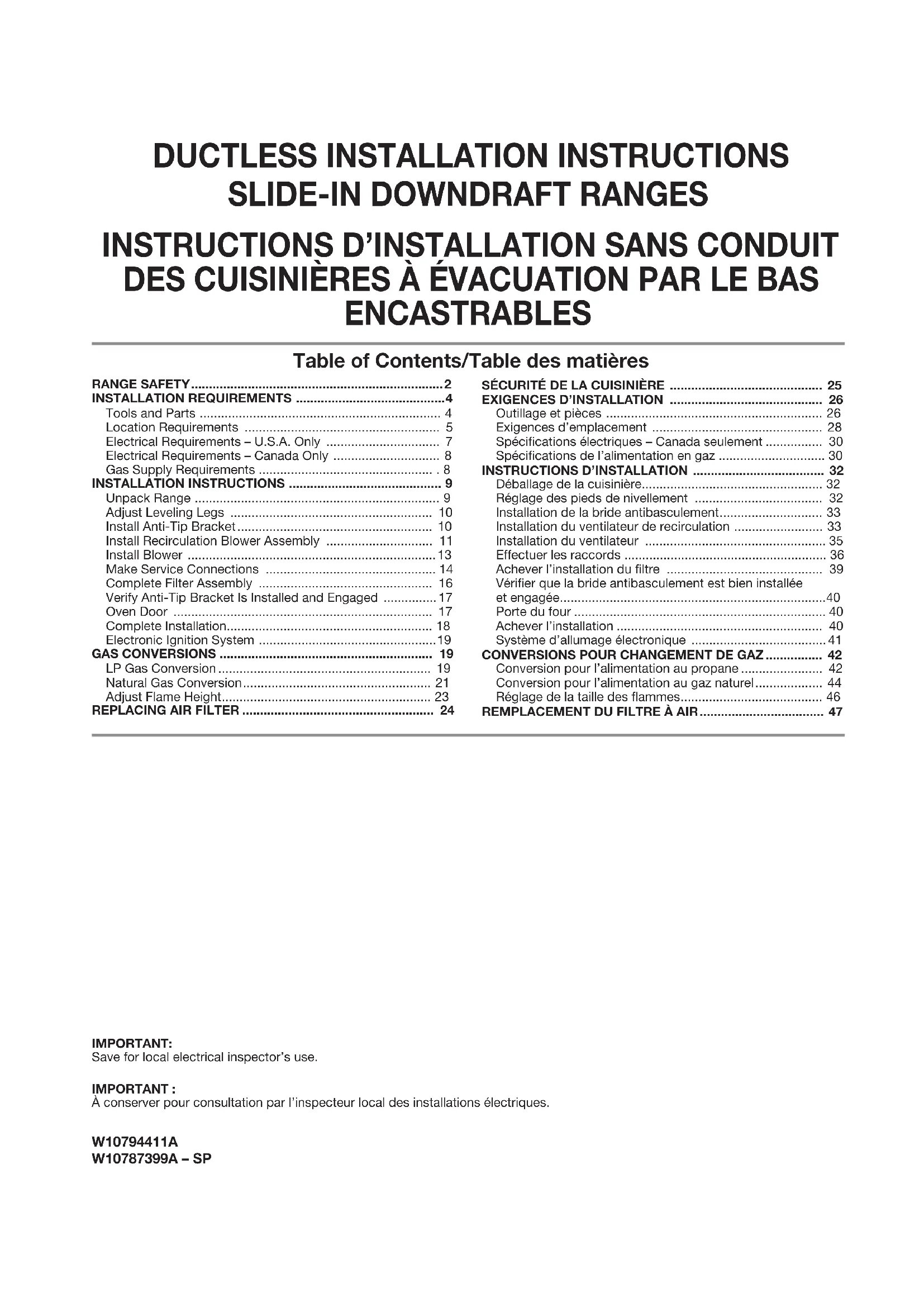 “Instructions d’installation” de ce manuel pour achever cette procédure. IMPORTANT : S'assurer de bien conserver les gicleurs qui ont été remplacés au cours de la conversion.44 Conversion pour l’alimentation au gaz naturel Risque de basculement Un enfant ou une personne adulte peut faire basculer la cuisinière, ce qui peut causer un décès. Fixer la bride antibasculement au plancher ou au mur, conformément aux instructions d'installation. Faire glisser de nouveau la cuisinière de façon à ce que le pied arrière de la cuisinière se trouve dans la fente de la bride antibasculement. Réengager la bride antibasculement si la cuisinière a été déplacée. Ne pas faire fonctionner la cuisinière si la bride antibasculement n'est pas installée et engagée. Le non-respect de ces instructions peut causer un décès ou des brûlures graves aux enfants et aux adultes. AVERTISSEMENT