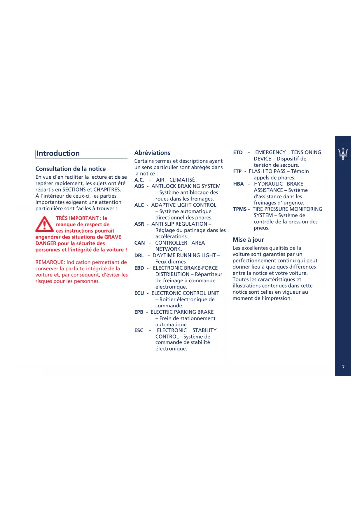 La MC Stradale entre en production.6 3500 Vignale spyder Mistral spyder Ghibli spyder7 Introduction Consultation de la notice En vue d’en faciliter la lecture et de se repérer rapidement, les sujets ont été répartis en SECTIONS et CHAPITRES. À l’intérieur de ceux-ci, les parties importantes exigeant une attention particulière sont faciles à trouver : TRÈS IMPORTANT : le manque de respect de ces instructions pourrait engendrer des situations de GRAVE DANGER pour la sécurité des personnes et l’intégrité de la voiture ! REMARQUE: indication permettant de conserver la parfaite intégrité de la voiture et, par conséquent, d’éviter les risques pour les personnes. Abréviations Certains termes et descriptions ayant un sens particulier sont abrégés dans la notice :