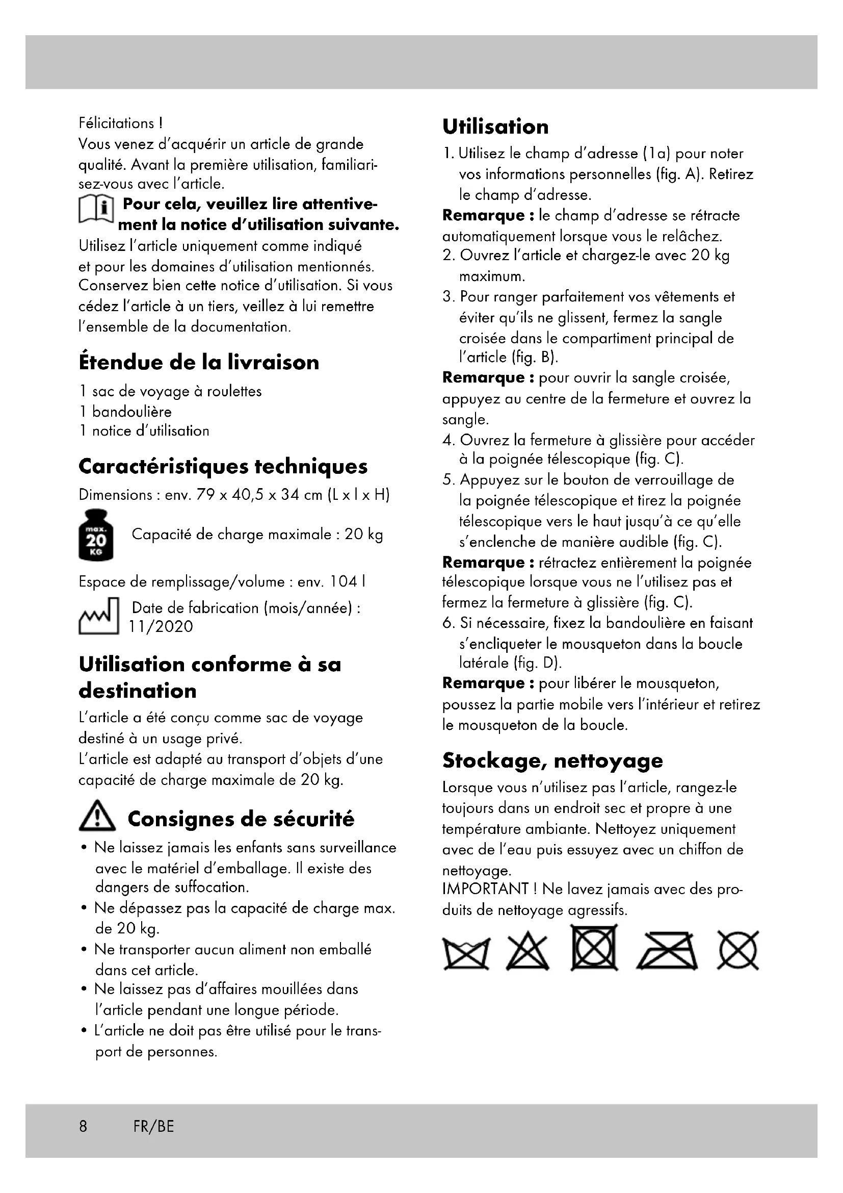 - s‘il présente les qualités qu‘un acheteur peut légitimement attendre eu égard aux déclara- tions publiques faites par le vendeur, par le producteur ou par son représentant, notam- ment dans la publicité ou l‘étiquetage ;10 2° Ou s‘il présente les caractéristiques définies d‘un commun accord par les parties ou être propre à tout usage spécial recherché par l‘acheteur, porté à la connaissance du vendeur et que ce dernier a accepté. Article L217-12 du Code de la consommation L‘action résultant du défaut de conformité se prescrit par deux ans à compter de la délivrance du bien. Article 1641 du Code civil Le vendeur est tenu de la garantie à raison des défauts cachés de la chose vendue qui la rendent impropre à l‘usage auquel on la destine, ou qui diminuent tellement cet usage que l‘acheteur ne l‘aurait pas acquise, ou n‘en aurait donné qu‘un moindre prix, s‘il les avait connus. Article 1648 1er alinéa du Code civil L‘action résultant des vices rédhibitoires doit être intentée par l‘acquéreur dans un délai de deux ans à compter de la découverte du vice. Les pièces détachées indispensables à l’utili- sation du produit sont disponibles pendant la durée de la garantie du produit. IAN : 355295_2004 Service France Tel. : 0800 919270 E-Mail : deltasport@lidl.fr Service Belgique Tel. : 070 270 171 (0,15 EUR/Min.) E-Mail : deltasport@lidl.be FR/BE11 Gefeliciteerd! Met uw aankoop hebt u voor een hoogwaardig artikel gekozen. Zorg ervoor dat u voor het eerste gebruik met het artikel vertrouwd raakt. Lees hiervoor de volgende ge- bruiksaanwijzing zorgvuldig door. Gebruik het artikel alleen zoals omschreven en voor het aangegeven doel. Bewaar deze ge- bruiksaanwijzing goed. Geef alle documenten mee als u het artikel aan iemand anders geeft. Leveringsomvang 1 x reistas met wieltjes 1 x schouderriem 1 x gebruiksaanwijzing Technische gegevens Afmetingen: ca. 79 x 40,5 x 34 cm (l x b x h) Maximaal laadvermogen: 20 kg Inhoud/volume: ca. 104 l Productiedatum (maand/jaar): 11/2020 Beoogd gebruik Het artikel is ontwikkeld als reistas voor particu- lier gebruik. Het artikel is geschikt voor het transport van voorwerpen met een maximaal laadgewicht van 20 kg. Veiligheidstips