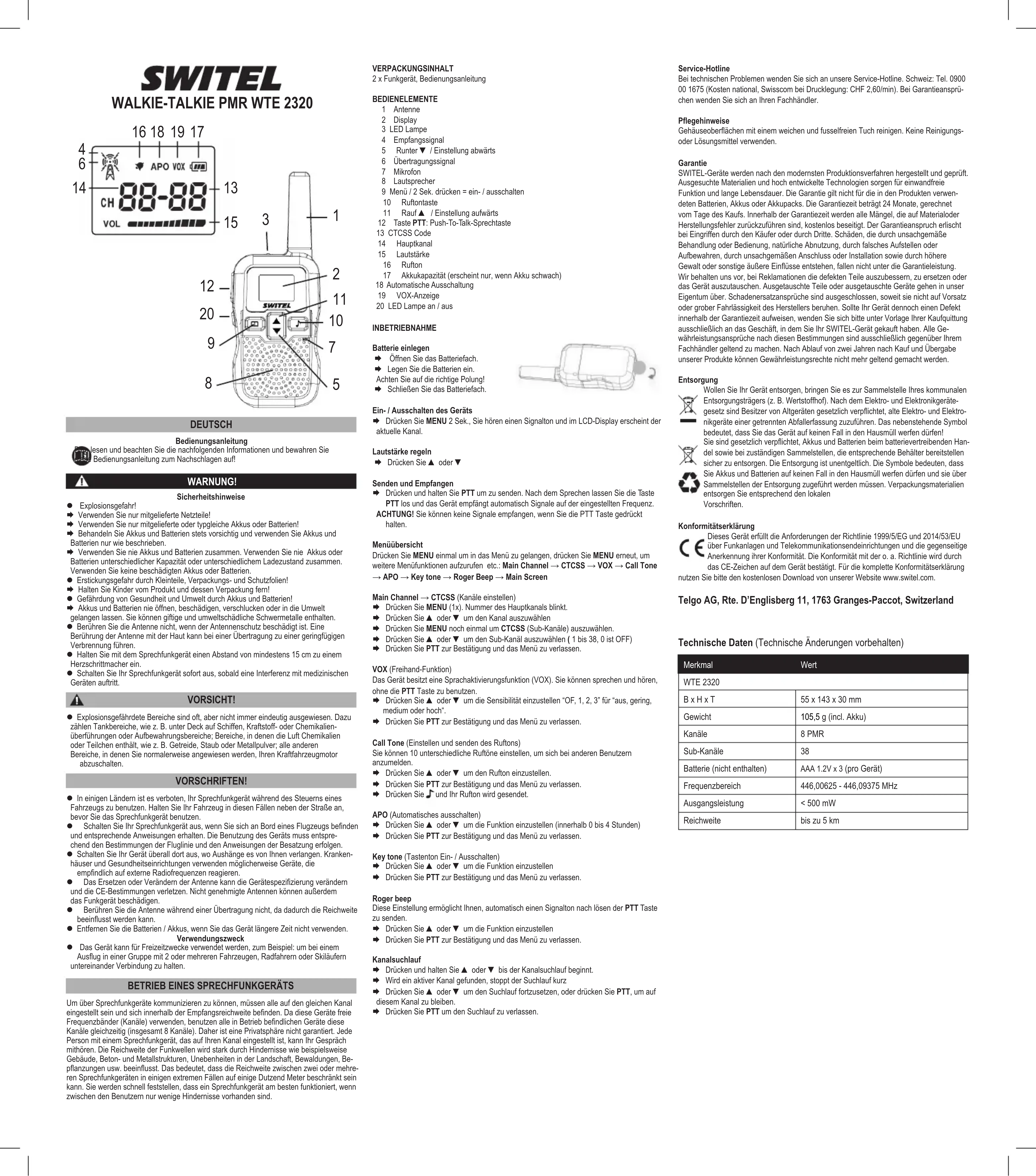 Ligne d‘assistance directeNotrehotlineestàvotredispositionau01.70.71.26.87(Numérosanssurtaxe,coûtd’unappellocal,letarifpeutdifférerselonvotreopérateur).FAQ sur switel.com téléchargementRemarques d‘entretienNettoyez les surfaces du boîtier avec un chiffon doux et non pelucheux. N‘utilisez pas de produits d‘entretien ou de solvants.GarantieLesappareilsSWITELsontcontrôlésetfabriquéssuivantlesmeilleursprocédés.Desmatériaux sélectionnés et des technologies de pointe leur garantissent un fonctionnement irréprochableetunelongueduréedevie.Lagarantienes‘appliquepasauxpilesetpilesrechargeablesutiliséesdanslesproduits.Laduréedelagarantieestde24moisàpartirdeladated‘achat.Pendantladuréedelagarantie,touslesdéfautsdusàdesvicesdematérieloudefabricationserontéliminésgratuitement.Ledroitàlagarantieexpireencasd‘intervention de l‘acheteur ou de tiers. Les dommages provenant d‘un maniement ou d‘une manipulation incorrects, d‘une usure naturelle, d‘une mauvaise mise en place ou d‘une mauvaiseconservation,d‘unraccordementoud‘uneinstallationincorrectsainsiqued‘uncasdeforcemajeureouautresinuencesextérieuressontexclusdelagarantie.Encasderéclamations, nous nous réservons le droit de réparer, de remplacer les pièces défectueuses ou d‘échanger l‘appareil. Les composants remplacés ou les appareils échangés deviennent notrepropriété.Lesdemandesdedommagesetintérêtssontexcluestantquelesdéfautsne reposent pas sur une faute intentionnelle ou une négligence grossière du fabricant. Si votre appareil SWITEL présente cependant un défaut pendant la période de garantie, veuil-lez vous adresser exclusivement au magasin où vous l‘avez acheté en présentant votre bon d‘achat.Vousnepouvezfairevaloirvosdroitsàlagarantierépondantàcesdispositionsqu‘exclusivementauprèsdevotrerevendeur.Deuxansaprèsl‘achatetlaremisedenosproduits,iln‘estpluspossibledefairevaloirlesdroitsàlagarantie.Mettre l‘appareil au rebutSi vous ne voulez plus vous servir de votre appareil, veuillez l‘apporter au centre de collectedel‘organismedetraitementdesdéchetsdevotrecommune(parex.centrederecyclage).D‘aprèslaloirelativeauxappareilsélectriquesetélectroniques,lespropriétairesd‘appareilsusagéssonttenusdemettretouslesappareilsélectriquesetélectroniquesusagésdansuncollecteurséparé.L‘icôneci-contresigniequevous ne devez en aucun cas jeter votre appareil dans les ordures ménagères ! Vous êtestenusparlaloid‘éliminervospilesetpilesrechargeablesauprèsd‘unreven-deurdepilesainsiqu‘auprèsdecentresdecollecteresponsablesdeleuréliminationquimettentàdispositiondesconteneursadéquats.Leuréliminationestgratuite.L‘icôneci-contresigniequevousnedevezenaucuncasjeterlespilesetpilesrechargeablesdanslesorduresménagères,maisquevousdevezlesapporteràuncentre de collecte. Éliminez les fournitures d‘emballage selon les règlements locaux.Déclaration de conformitéCet appareil est en conformité avec la directive 1999/5/EG e 2014/53/EU sur les installationsderadioetdetélécommunicationetlareconnaissanceréciproquedeleurconformité.Laconformitéavecladirectivementionnéeci-dessusestconr-méesurl‘appareilparlamarqeCE.Vousavezlapossibilitédetéléchargergratuitementladéclaration intégrale de conformité sur notre site Internet www.switel.com. Telgo AG, Rte. D’Englisberg 11, 1763 Granges-Paccot, Switzerland3