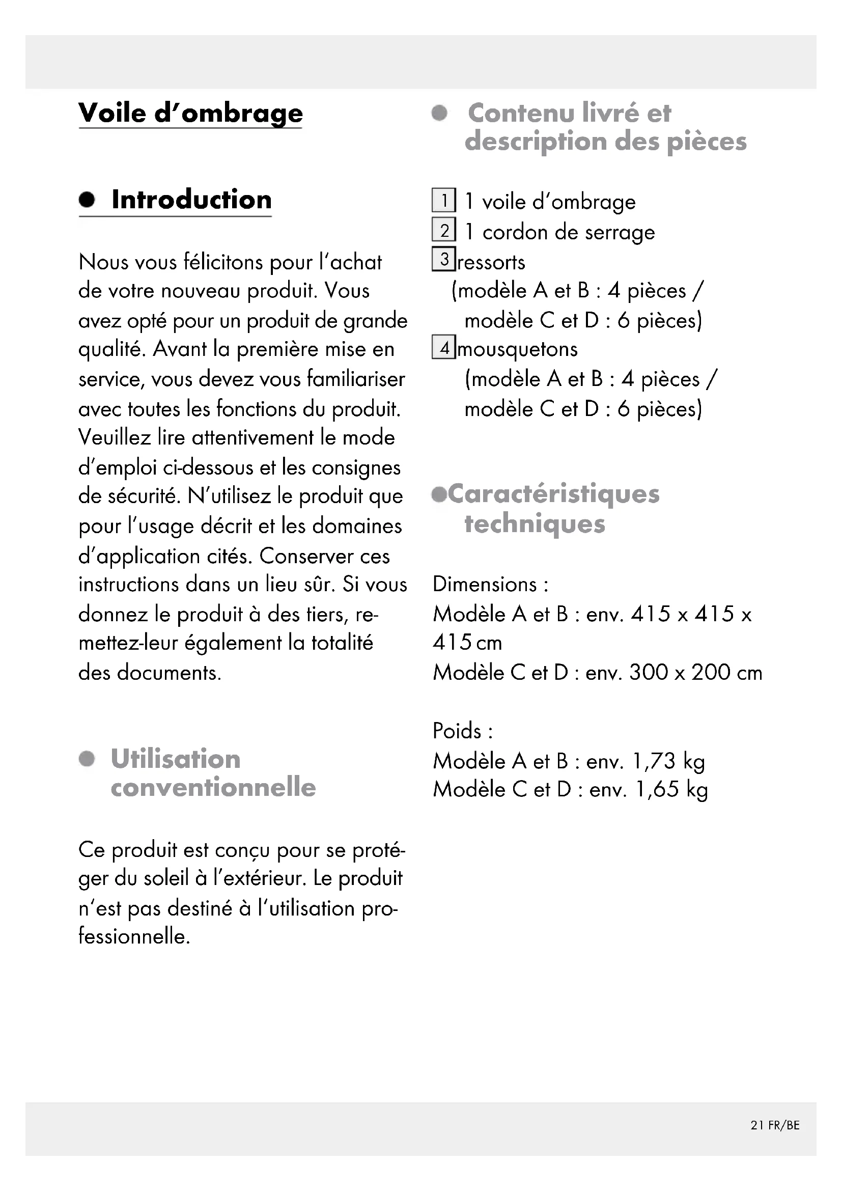 mousquetons (modèle A et B : 4 pièces / modèle C et D : 6 pièces) Caractéristiques techniques Dimensions : Modèle A et B : env. 415 x 415 x 415 cm Modèle C et D : env. 300 x 200 cm Poids : Modèle A et B : env. 1,73 kg Modèle C et D : env. 1,65 kg22 FR/BE Indications de sécurité