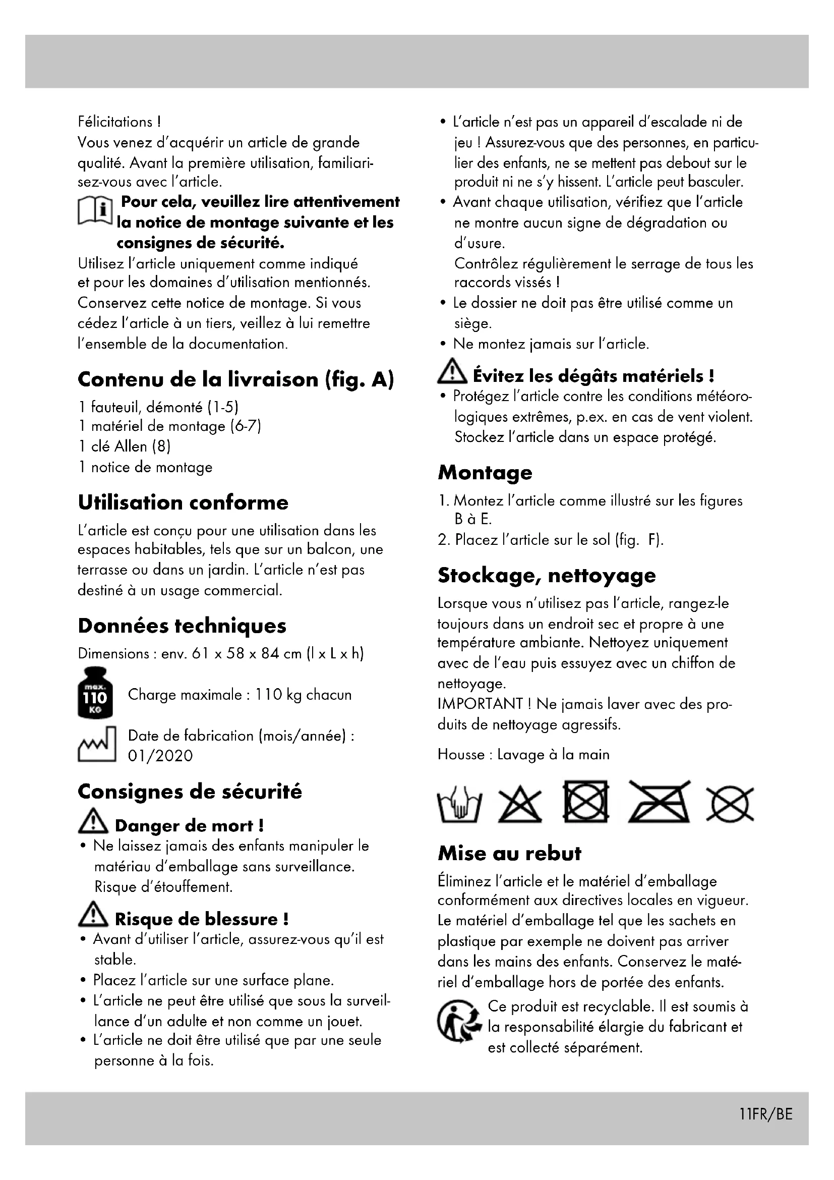 - s‘il présente les qualités qu‘un acheteur peut légitimement attendre eu égard aux déclara- tions publiques faites par le vendeur, par le producteur ou par son représentant, notam- ment dans la publicité ou l‘étiquetage ; 2° Ou s‘il présente les caractéristiques définies d‘un commun accord par les parties ou être propre à tout usage spécial recher-ché par l‘acheteur, porté à la connaissance du vendeur et que ce dernier a accepté. Article L217-12 du Code de la consommation L‘action résultant du défaut de conformité se prescrit par deux ans à compter de la délivrance du bien. FR/BE13FR/BE Article 1641 du Code civil Le vendeur est tenu de la garantie à raison des défauts cachés de la chose vendue qui la rendent impropre à l‘usage auquel on la destine, ou qui diminuent tellement cet usage que l‘acheteur ne l‘aurait pas acquise, ou n‘en aurait donné qu‘un moindre prix, s‘il les avait connus. Article 1648 1er alinéa du Code civil L‘action résultant des vices rédhibitoires doit être intentée par l‘acquéreur dans un délai de deux ans à compter de la découverte du vice. Les pièces détachées indispensables à l’utili- sation du produit sont disponibles pendant la durée de la garantie du produit. IAN : 332816_1907 Service France Tel. : 0800 919270 E-Mail : deltasport@lidl.fr Service Belgique Tel. : 070 270 171 (0,15 EUR/Min.) E-Mail : deltasport@lidl.be14 NL/BE Gefeliciteerd! Met uw aankoop hebt u voor een hoogwaardig artikel gekozen. Zorg ervoor dat u voor het eerste gebruik met het artikel vertrouwd raakt. Lees hiervoor de volgende monta- gehandleiding en de veiligheid- stips zorgvuldig door. Gebruik het artikel alleen zoals omschreven en voor het aangegeven doel. Bewaar deze monta- gehandleiding goed. Geef alle documenten mee als u het artikel aan iemand anders geeft. In het leveringspakket inbegrepen (afb. A) 1 x fauteuil, gedemonteerd (1-5) 1 x montagemateriaal (6-7) 1 x inbussleutel (8) 1 x montagehandleiding Voorgeschreven gebruik Het artikel werd ontwikkeld voor het gebruik in woongedeeltes, bv. op het balkon, op het terras of in de tuin. Het artikel is niet bestemd voor commercieel gebruik. Technische gegevens Afmetingen: ca. 61 x 84 x 58 cm (B x H x T)