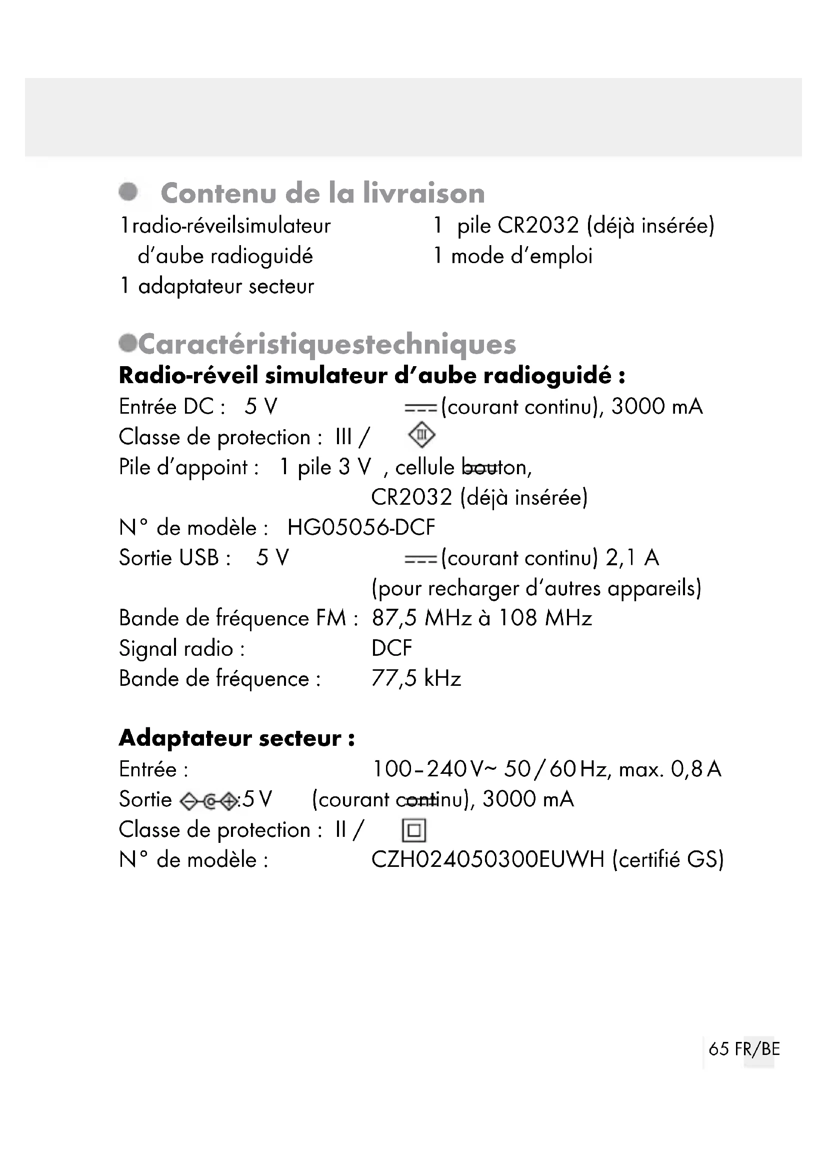Adaptateur secteur65 FR/BE Contenu de la livraison 1 radio-réveil simulateur d’aube radioguidé 1 adaptateur secteur 1 pile CR2032 (déjà insérée) 1 mode d‘emploi Caractéristiques techniques Radio-réveil simulateur d’aube radioguidé : Entrée DC : 5 V (courant continu), 3000 mA Classe de protection : III / Pile d’appoint : 1 pile 3 V , cellule bouton, CR2032 (déjà insérée) N° de modèle : HG05056-DCF Sortie USB : 5 V (courant continu) 2,1 A (pour recharger d‘autres appareils) Bande de fréquence FM : 87,5 MHz à 108 MHz Signal radio: DCF Bande de fréquence : 77,5 kHz Adaptateur secteur : Entrée : 100–240 V∼ 50 / 60 Hz, max. 0,8 A Sortie : 5 V (courant continu), 3000 mA Classe de protection: II / N° de modèle : CZH024050300EUWH (certifié GS)66 FR/BE Instructions générales de sécurité Familiarisez-vous avec toutes les indications de manipulation et de sécurité avant la première utilisation du produit! Si vous remettez le produit à un tiers, veuillez également lui transmettre tous les documents s‘y rapportant! Le réveil lumineux est à utiliser exclusivement avec l‘adaptateur secteur fourni (n° de modèle CZH024050300EUWH).