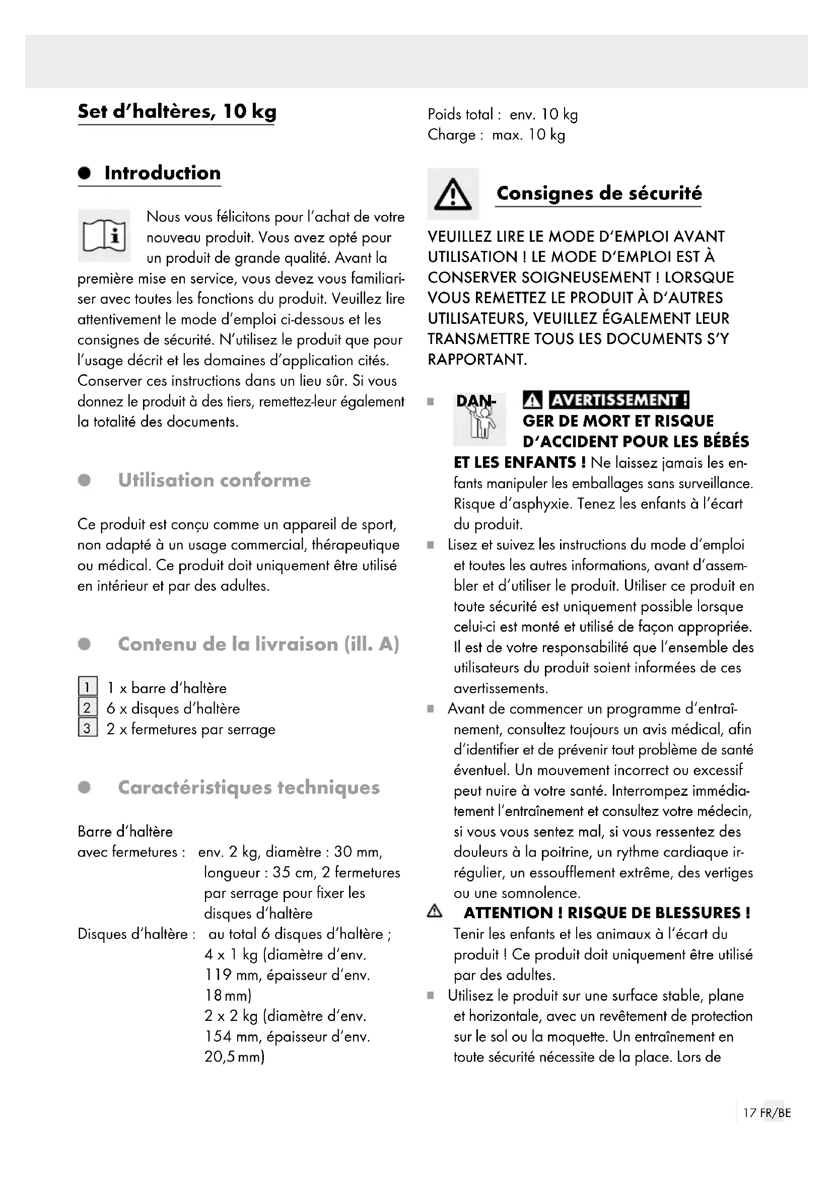 2 x fermetures par serrage Caractéristiques techniques Barre d‘haltère avec fermetures: env. 2 kg, diamètre: 30 mm, longueur: 35 cm, 2 fermetures par serrage pour fixer les disques d‘haltère Disques d‘haltère : au total 6 disques d‘haltère ; 4 x 1 kg (diamètre d‘env. 119 mm, épaisseur d‘env. 18 mm) 2 x 2 kg (diamètre d‘env. 154 mm, épaisseur d‘env. 20,5 mm) Poids total : env. 10 kg Charge : max. 10 kg Consignes de sécurité VEUILLEZ LIRE LE MODE D‘EMPLOI AVANT